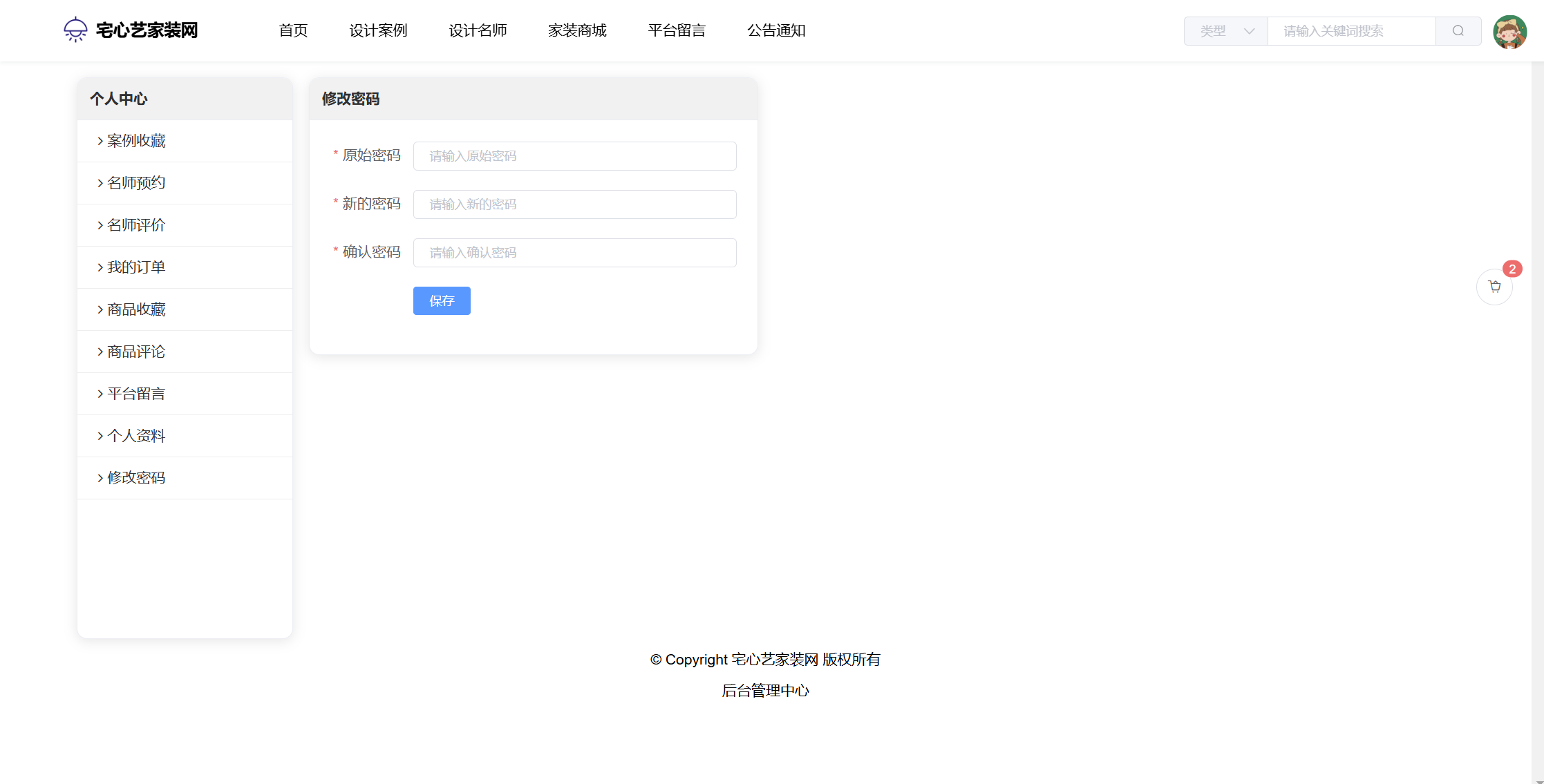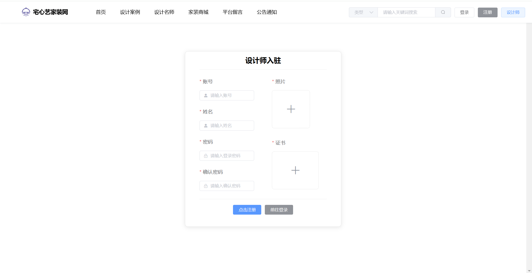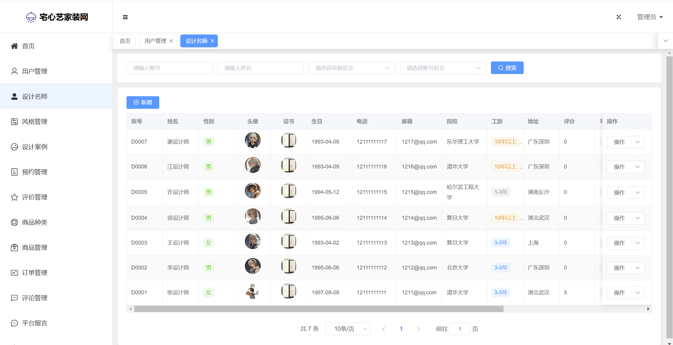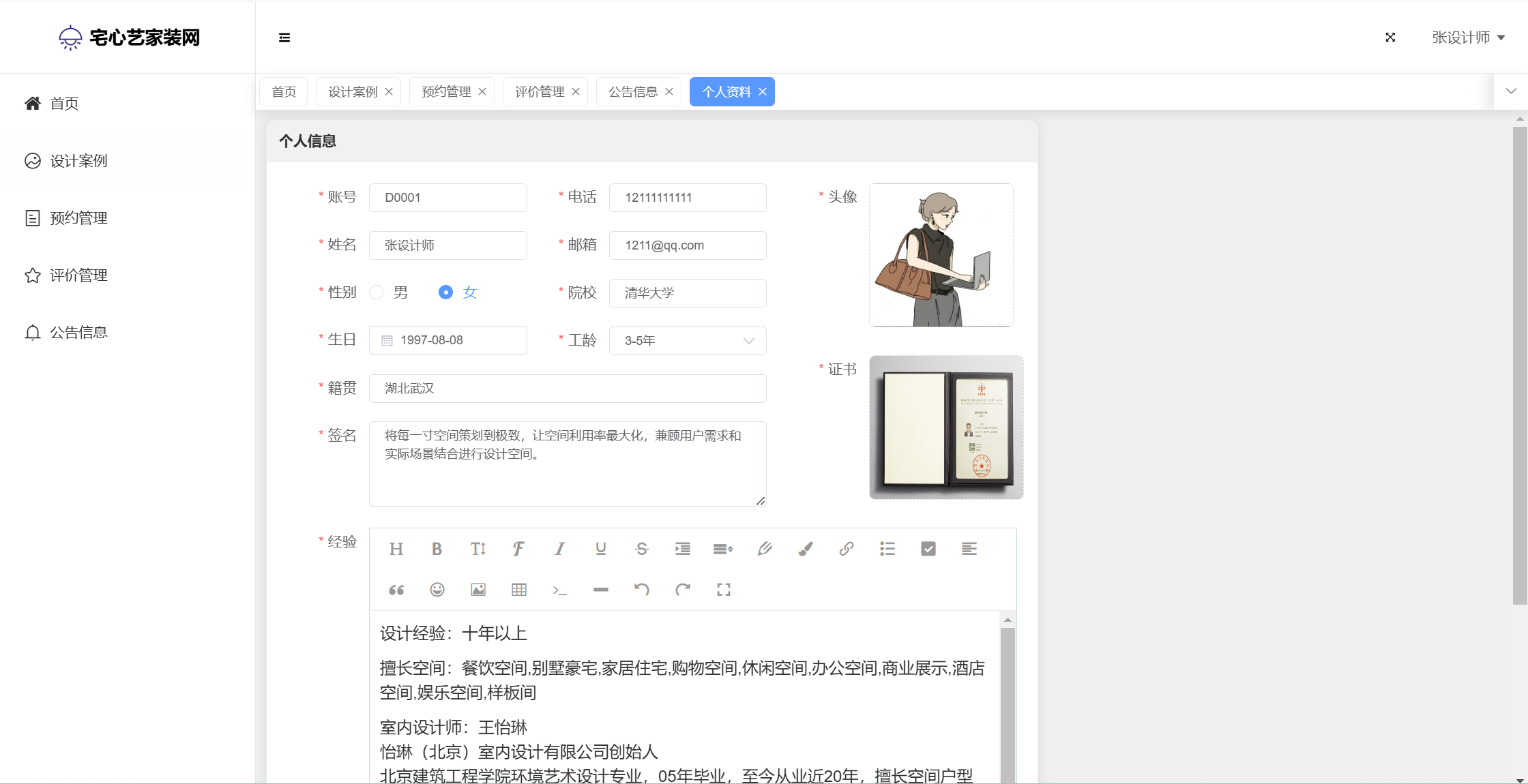 设计师:设计案例;预约管理;评价管理;公告信息;个人信息(上传头像、证书);修改密码;