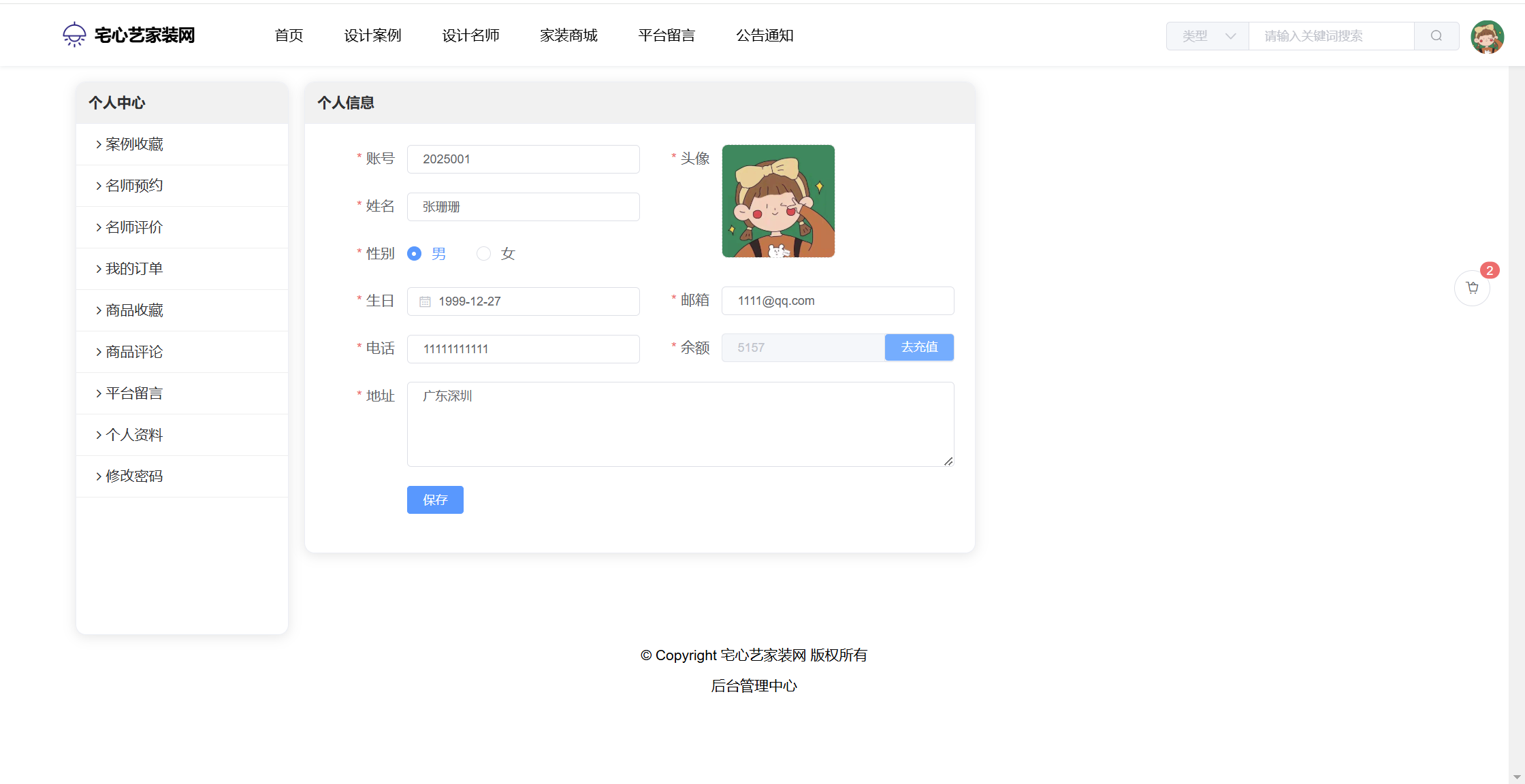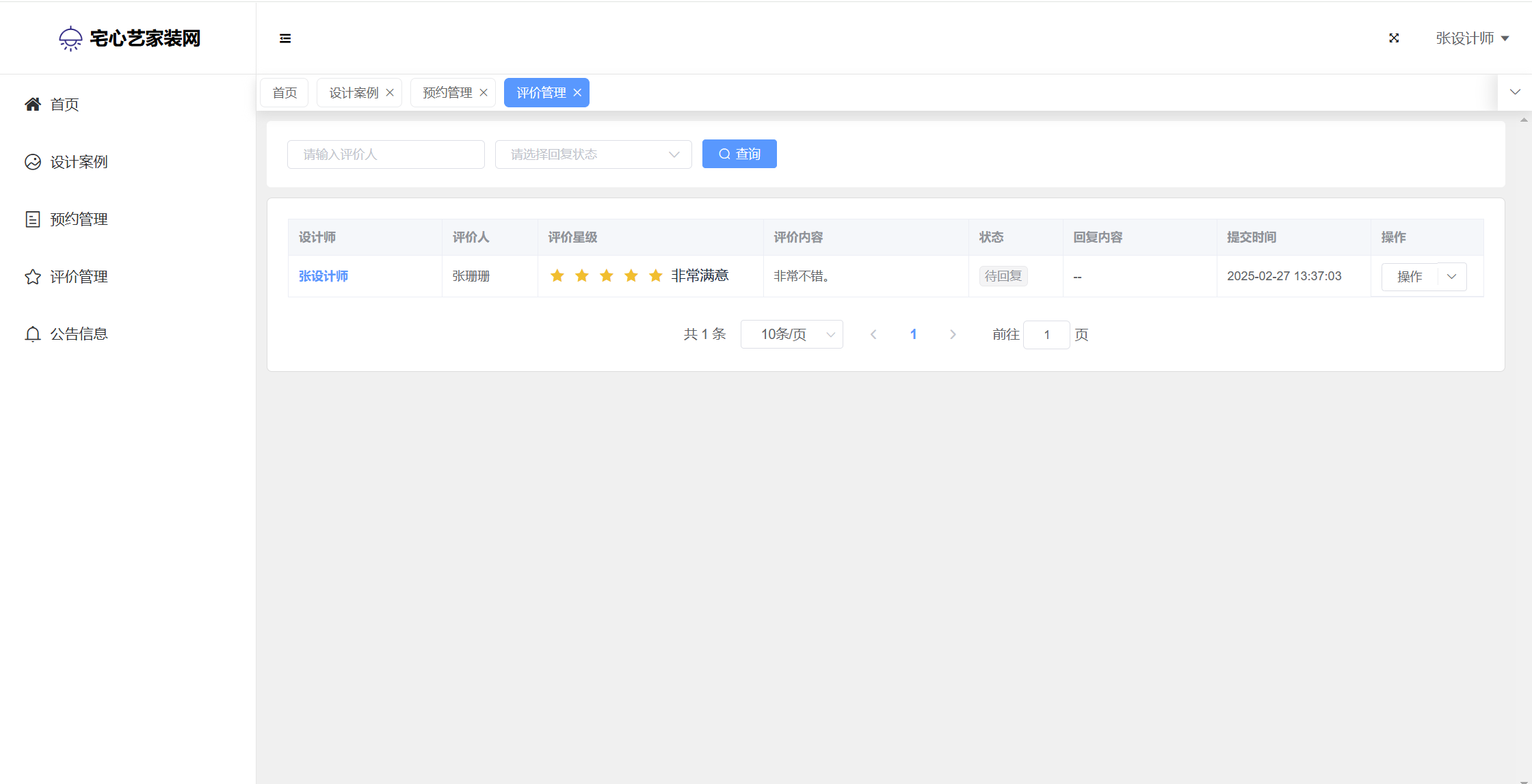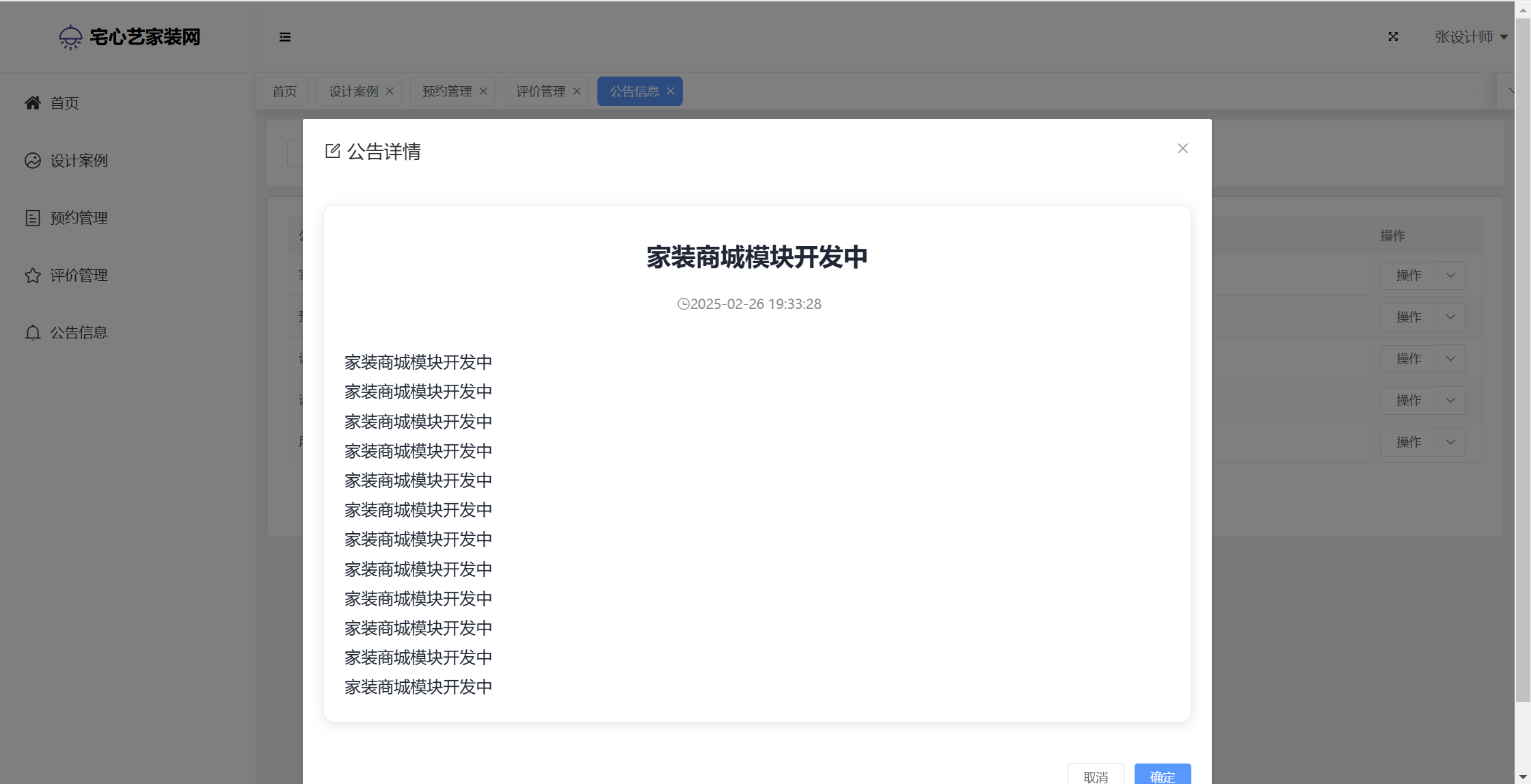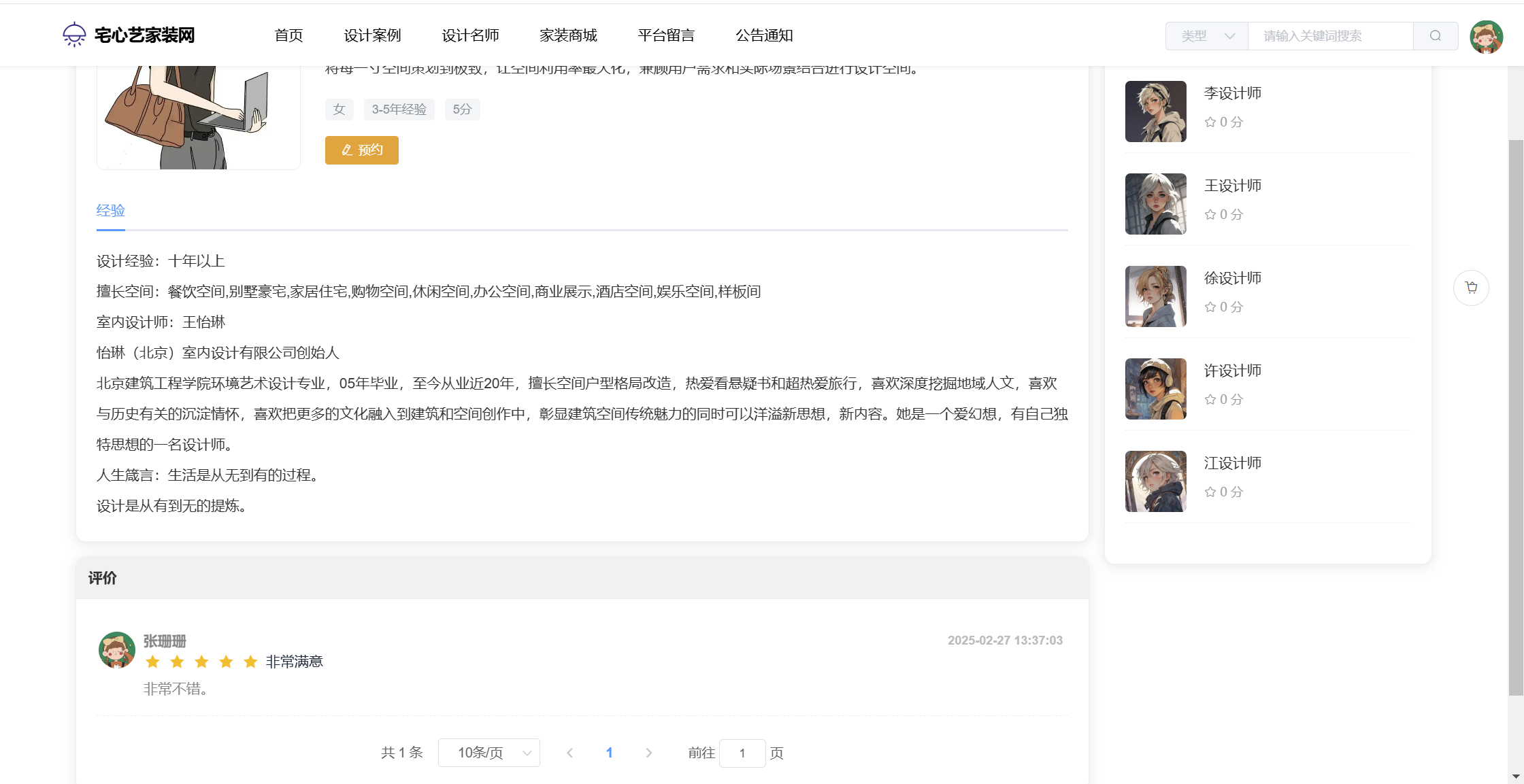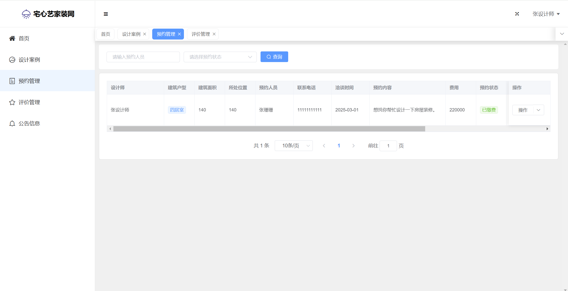 基于SpringBoot+Vue前后端分离的宅心艺家装网系统(源码+文档),系统包含管理员、设计师、用户角色,功能如下: