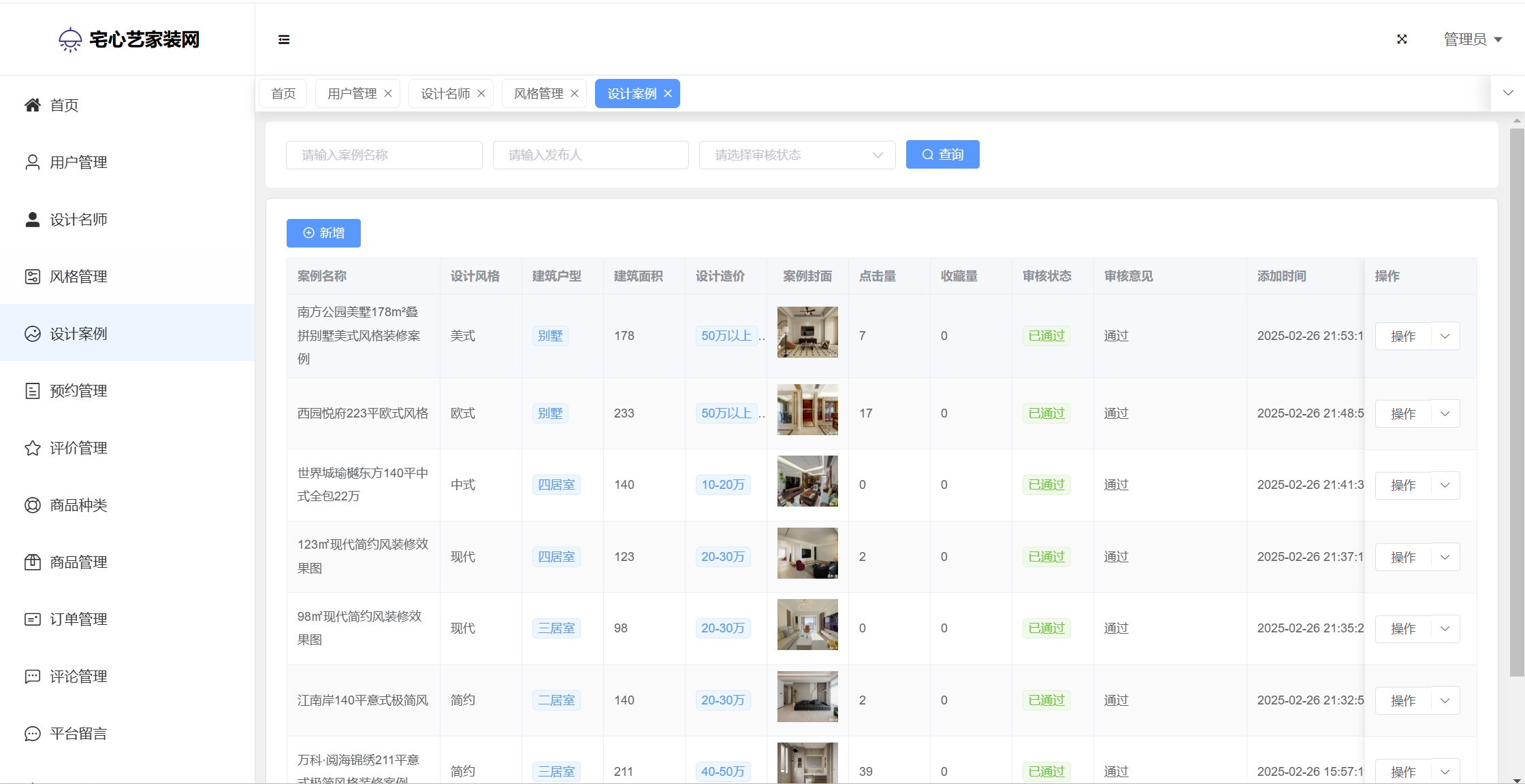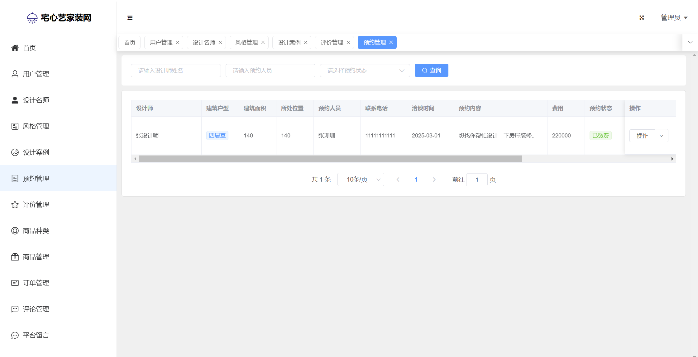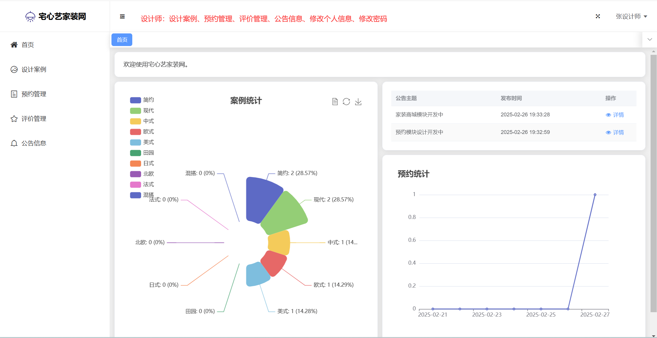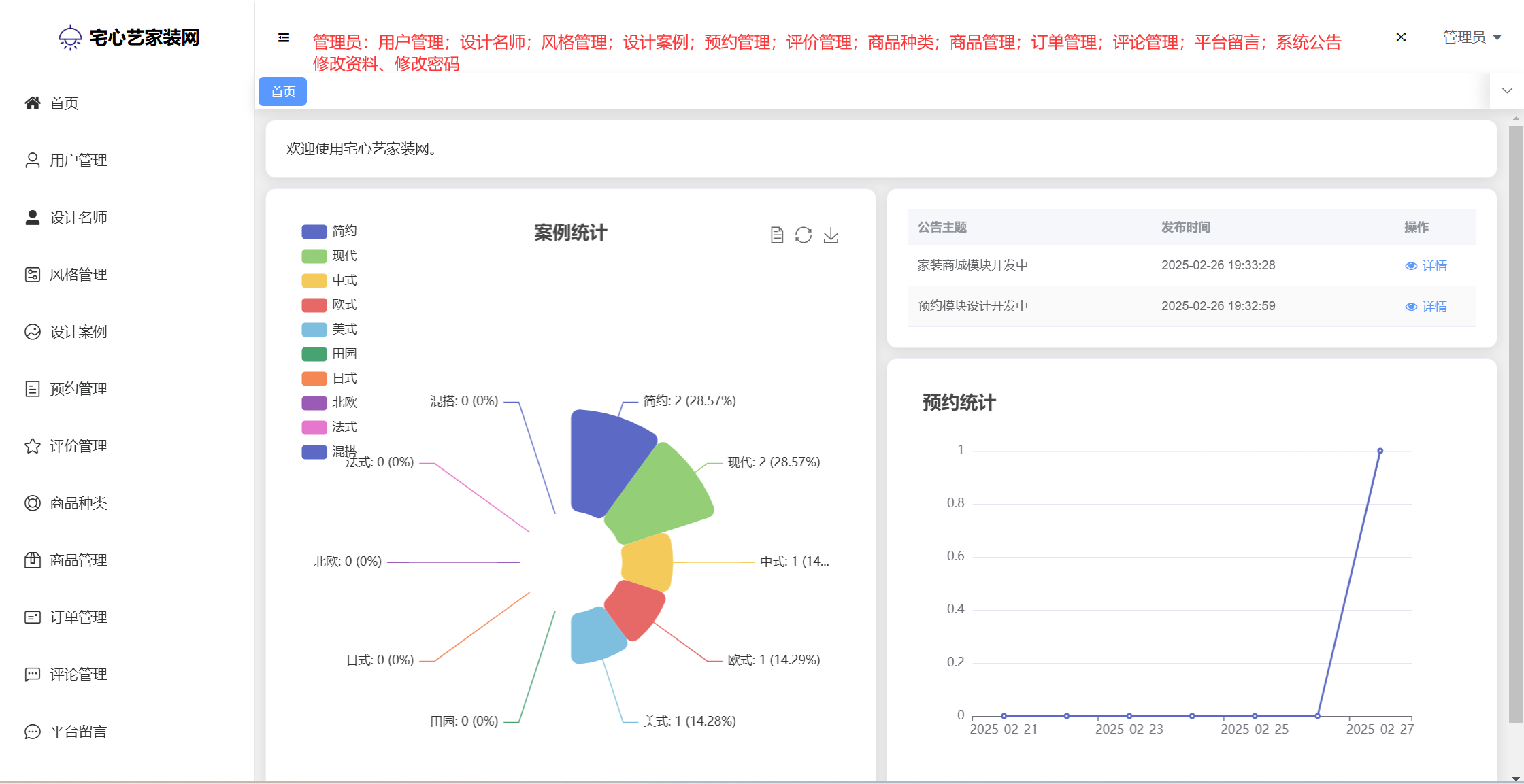 管理员:首页统计(案例统计、预约统计);用户管理;设计名师;风格管理;设计案例;预约管理;评价管理;商品种类;商品管理;订单管理;评论管理;平台留言;公告信息;个人信息;密码修改。