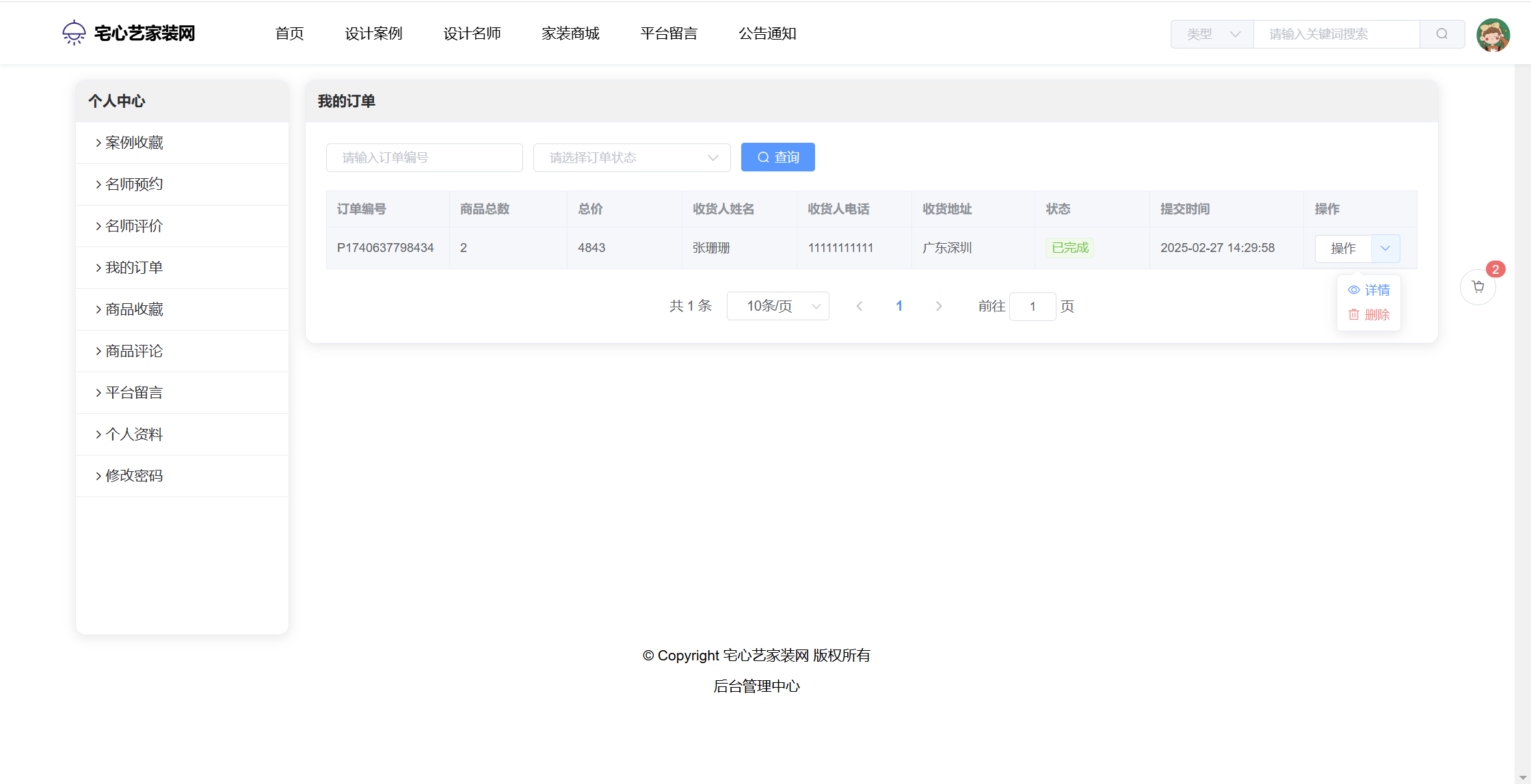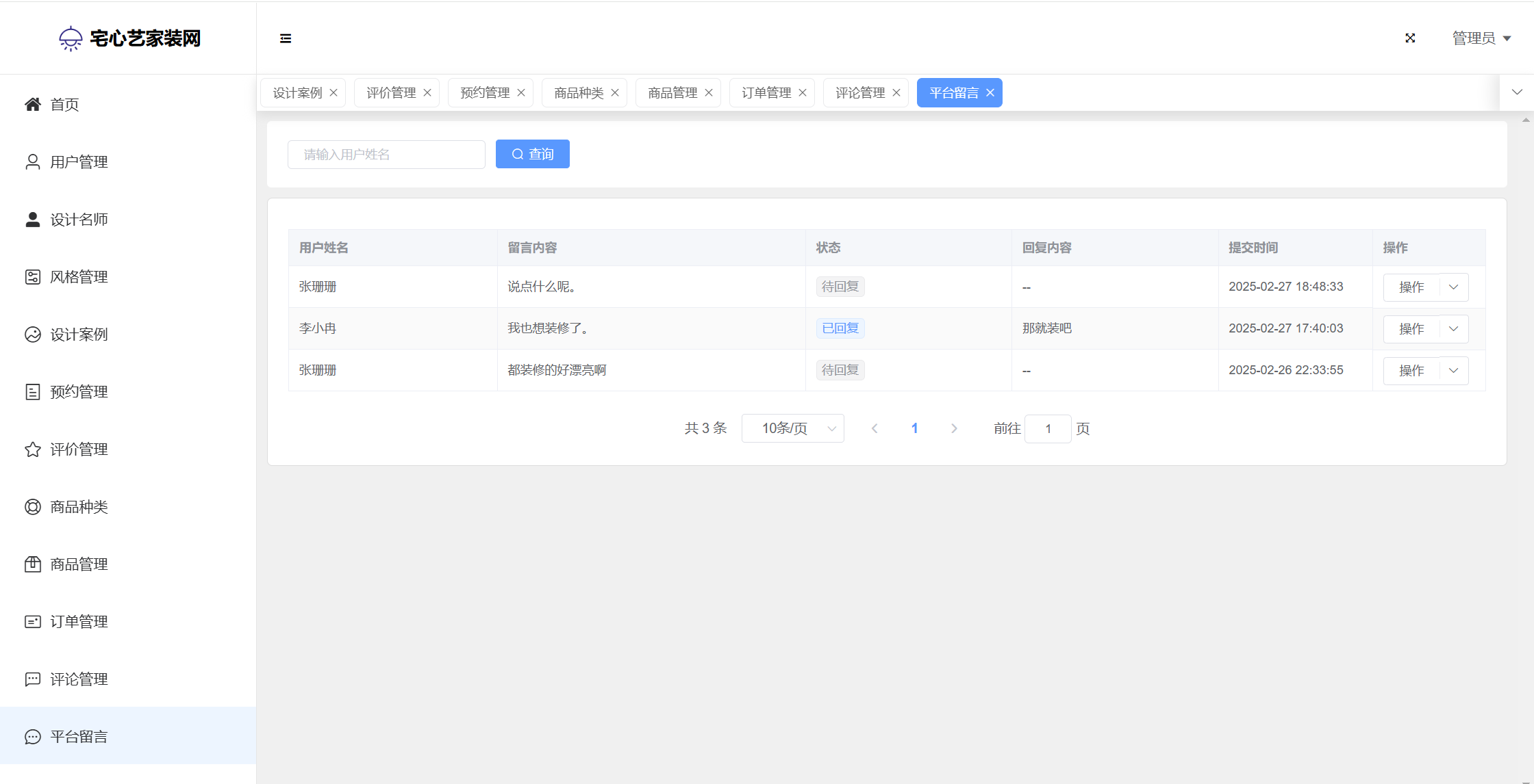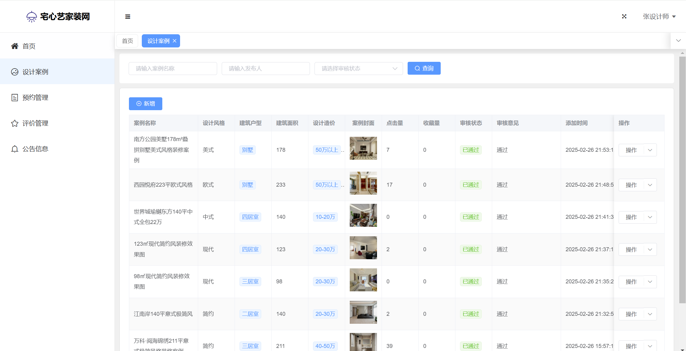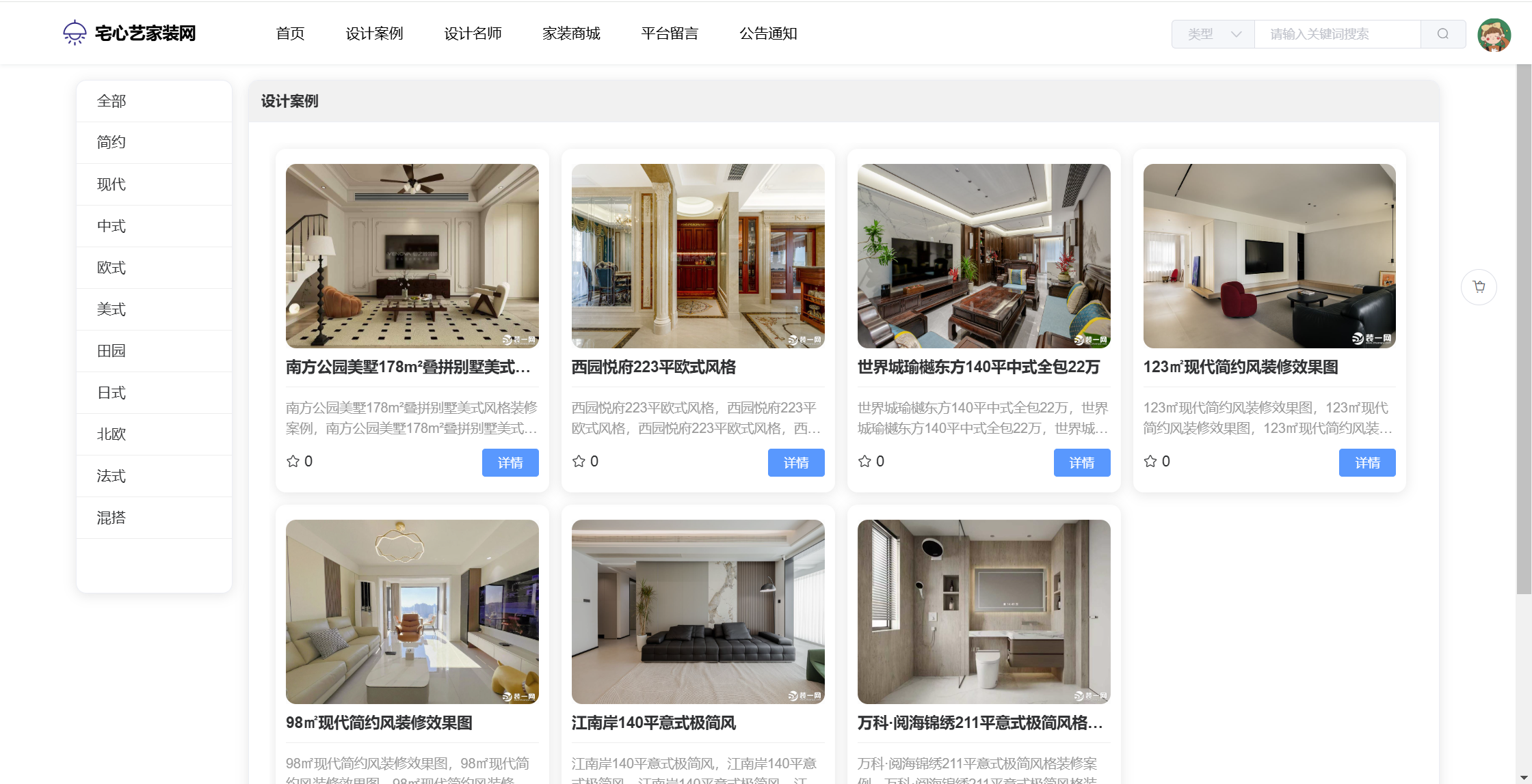 管理员:首页统计(案例统计、预约统计);用户管理;设计名师;风格管理;设计案例;预约管理;评价管理;商品种类;商品管理;订单管理;评论管理;平台留言;公告信息;个人信息;密码修改。