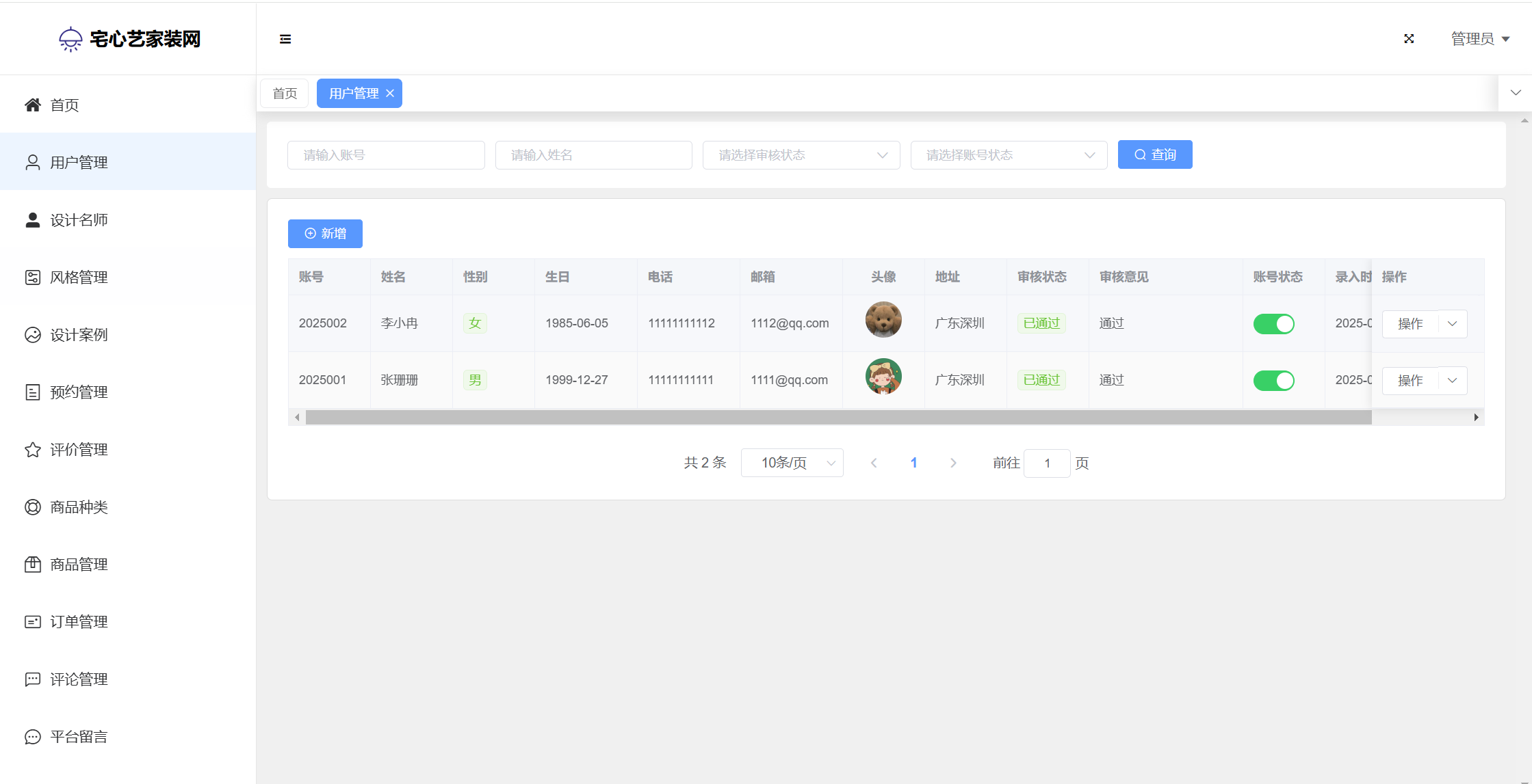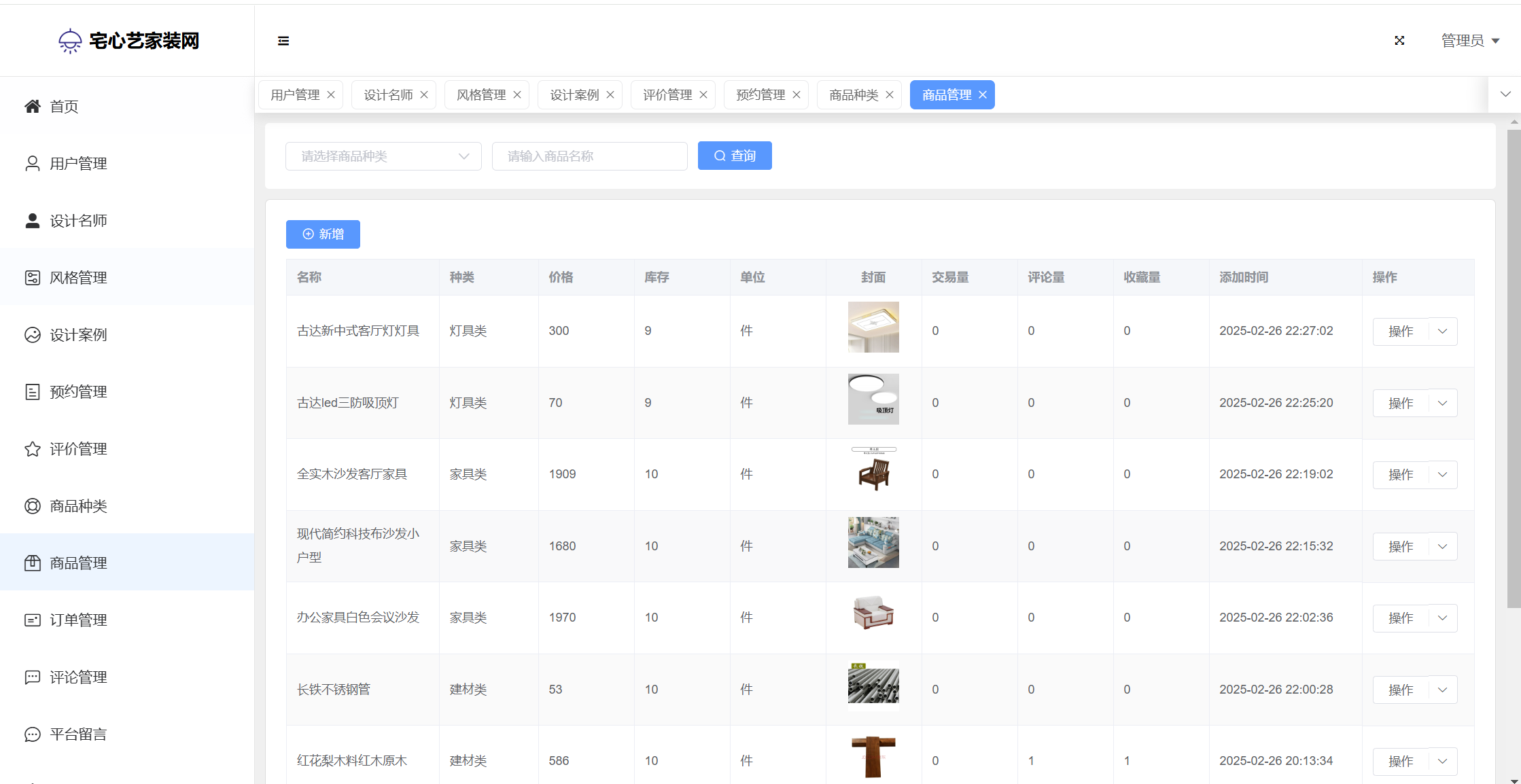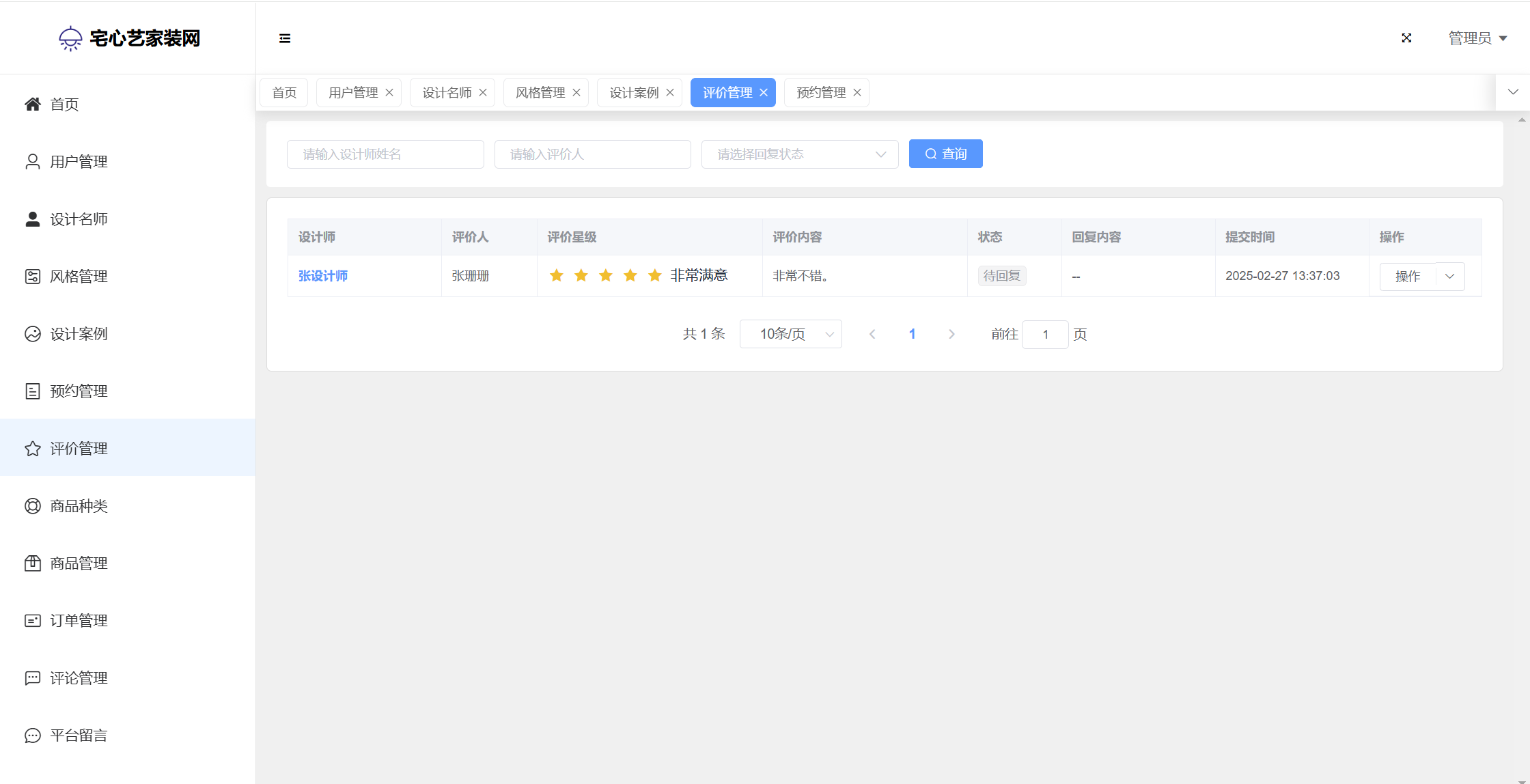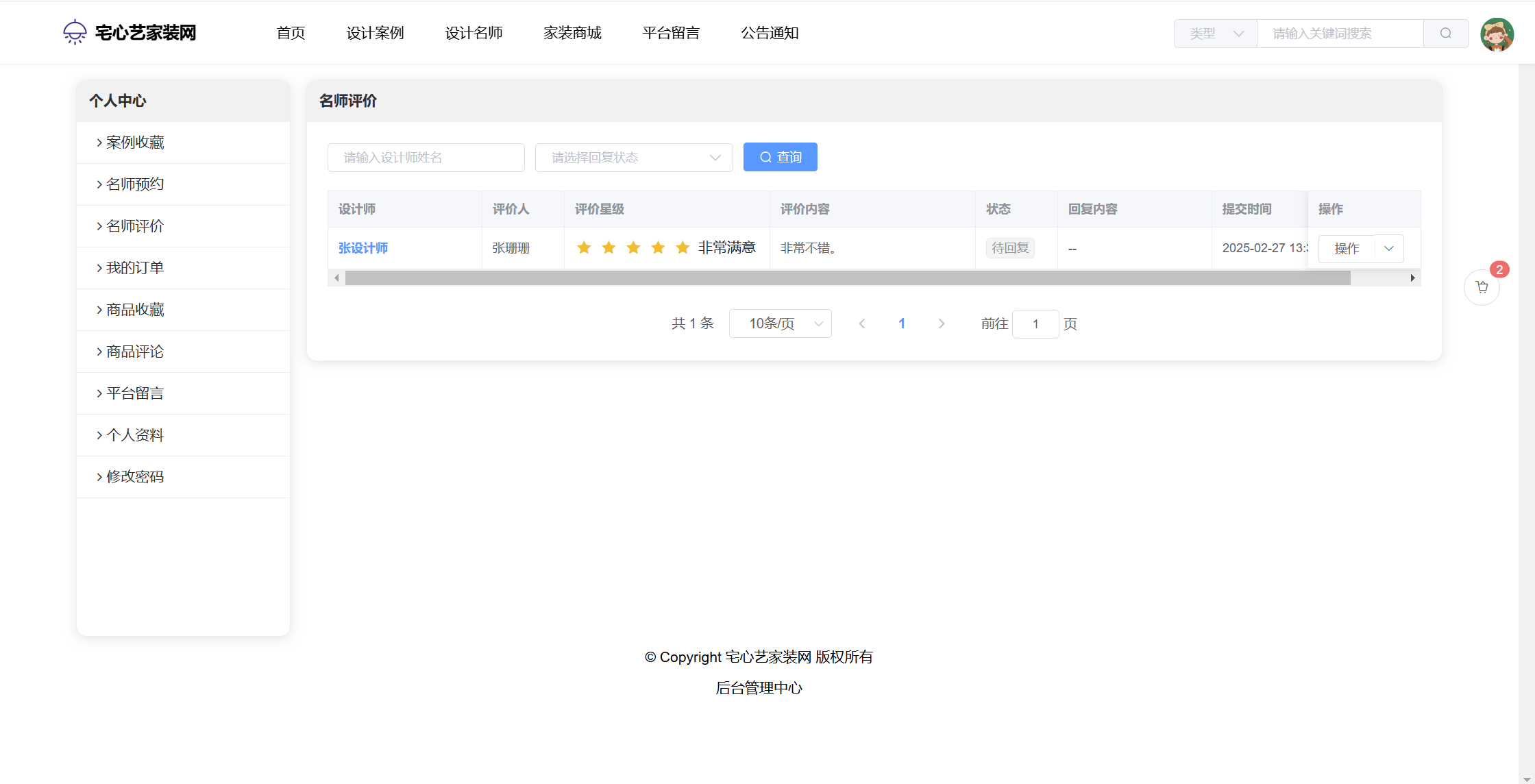管理员:首页统计(案例统计、预约统计);用户管理;设计名师;风格管理;设计案例;预约管理;评价管理;商品种类;商品管理;订单管理;评论管理;平台留言;公告信息;个人信息;密码修改。