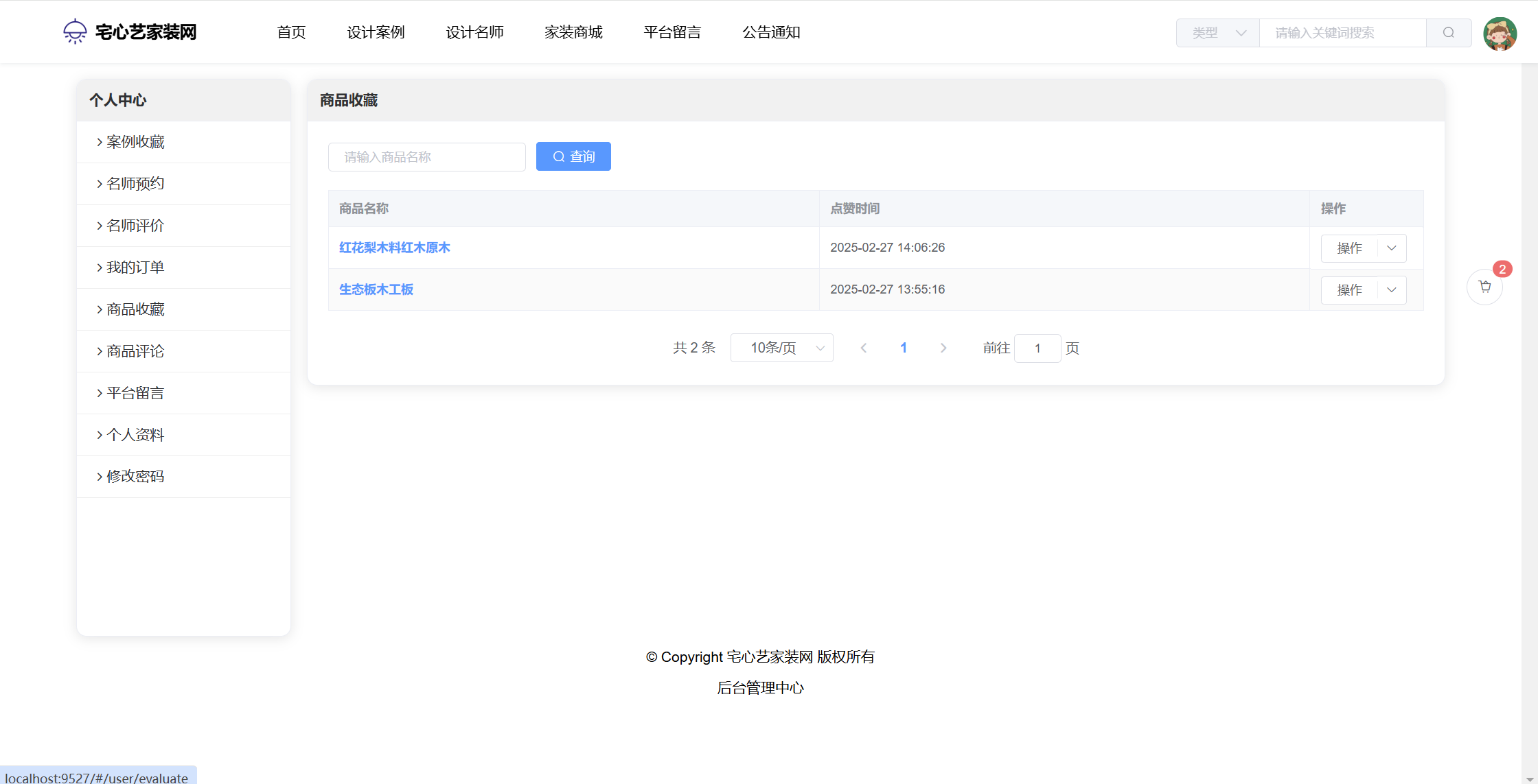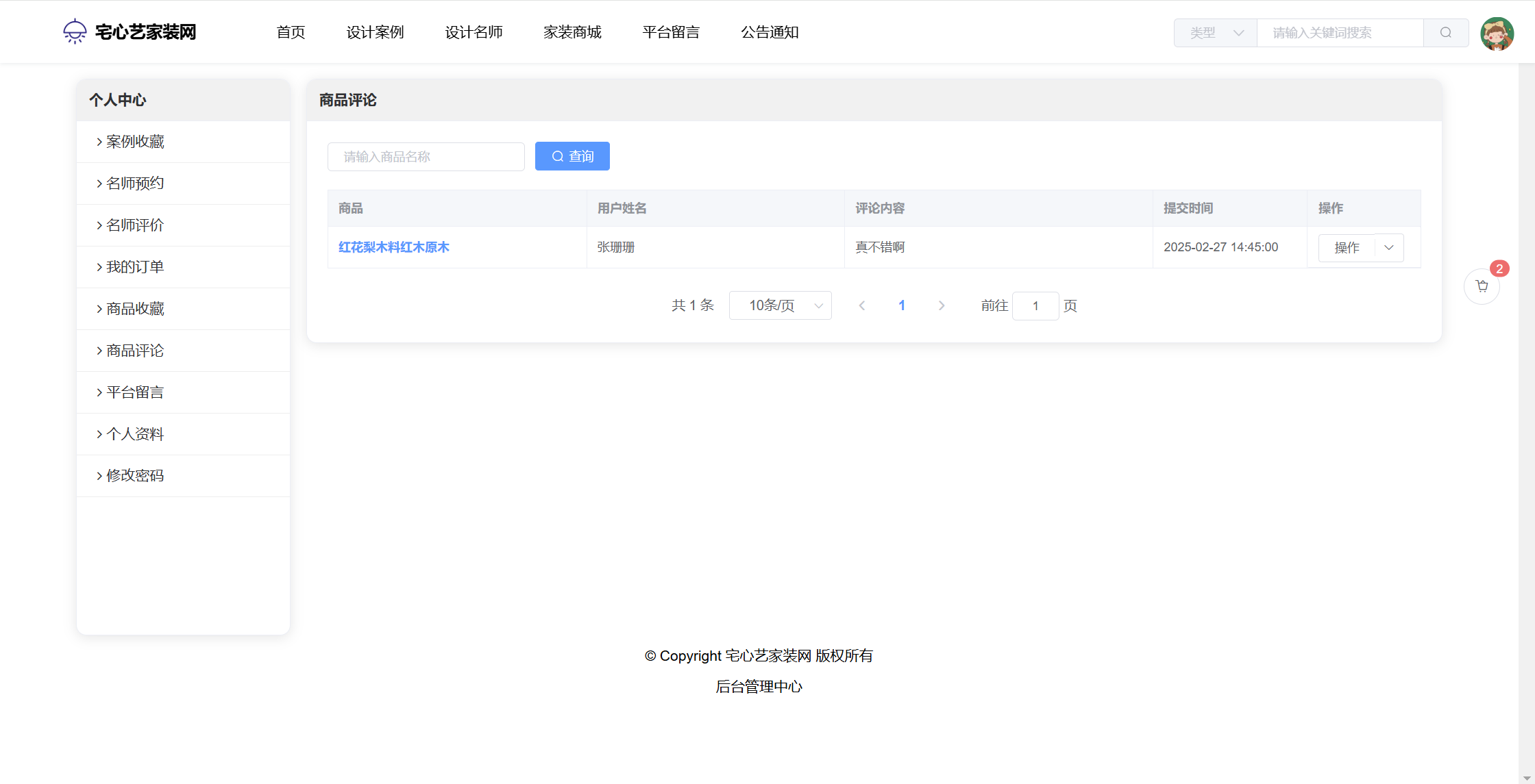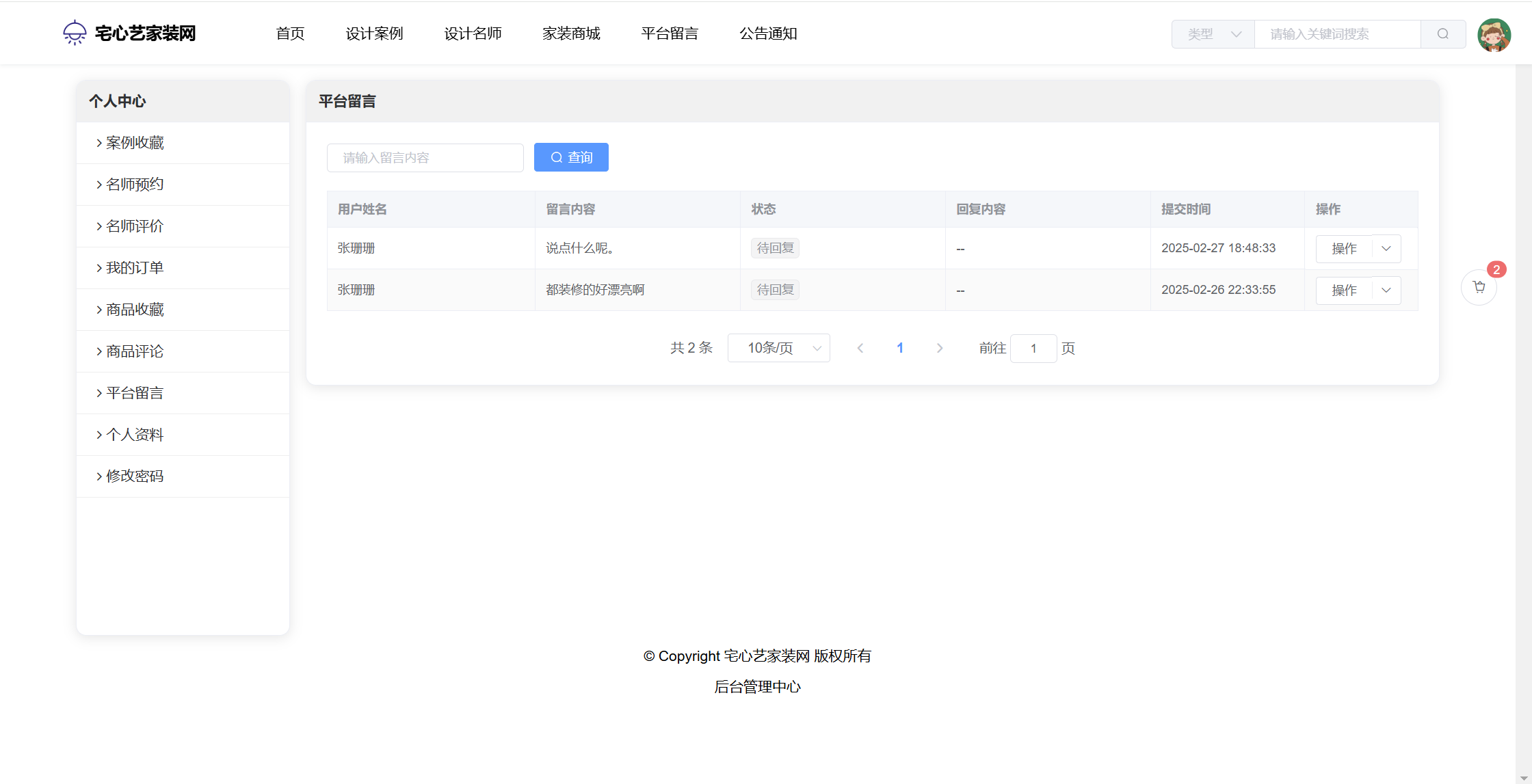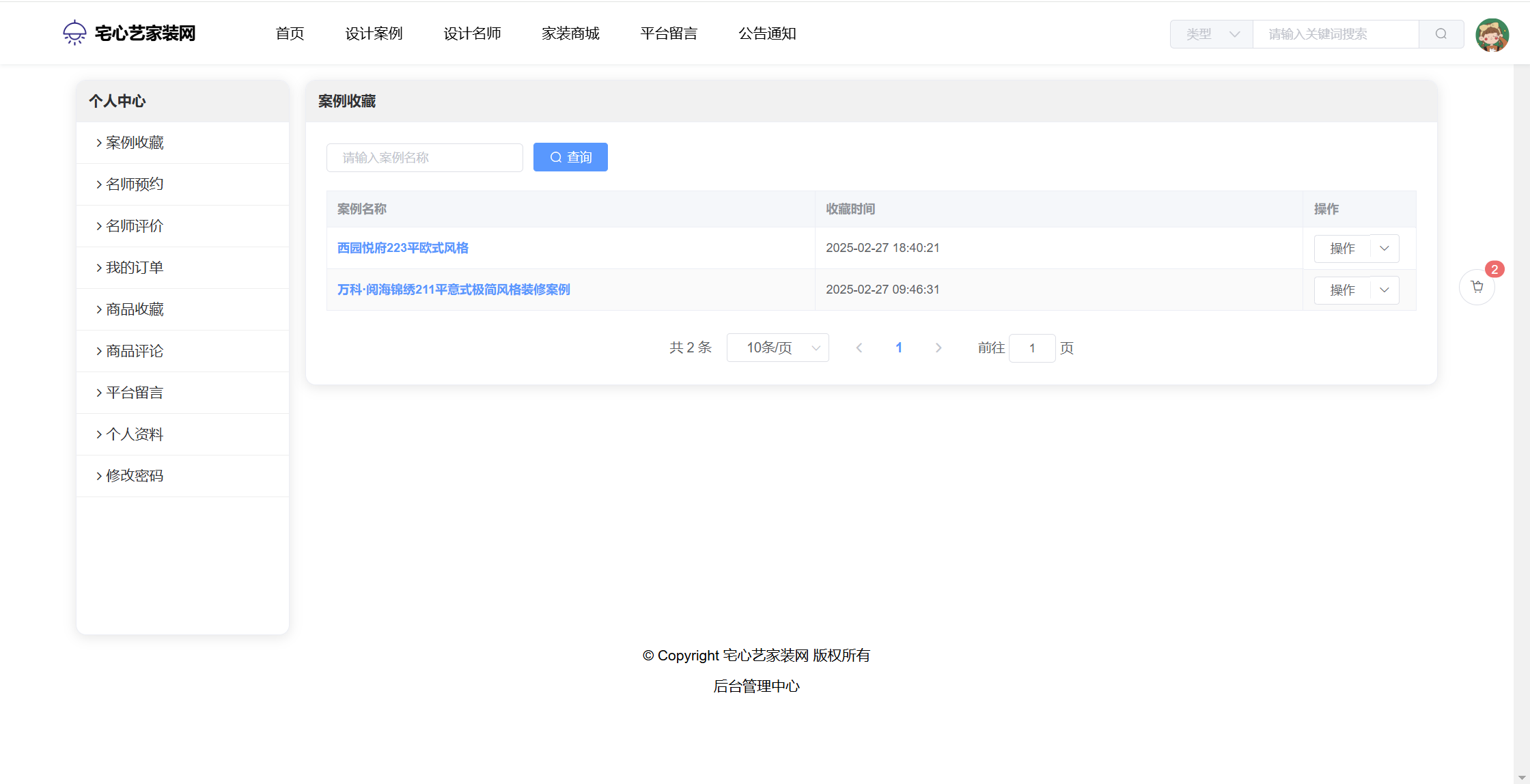 管理员:首页统计(案例统计、预约统计);用户管理;设计名师;风格管理;设计案例;预约管理;评价管理;商品种类;商品管理;订单管理;评论管理;平台留言;公告信息;个人信息;密码修改。