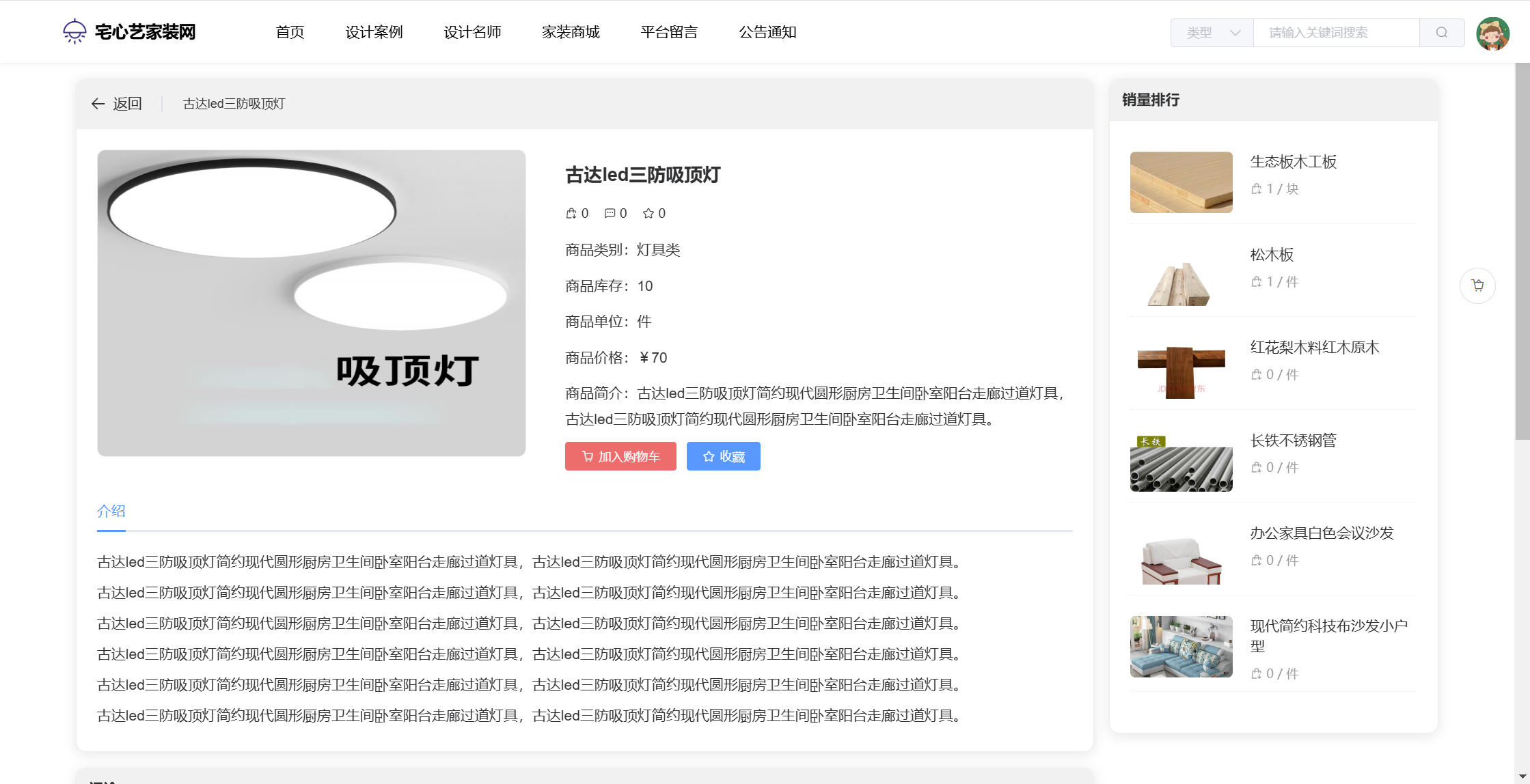 用户:注册、登录系统;首页;设计案例(详情、收藏);设计名师(详情、预约、评价);家装商城(详情、加入购物车、下单、评论);平台留言;系统通知。用户还具有个人中心功能,功能包括:案例收藏、名师预约、名师评价、我的订单、商品收藏、商品评论、平台留言、个人资料、修改密码。