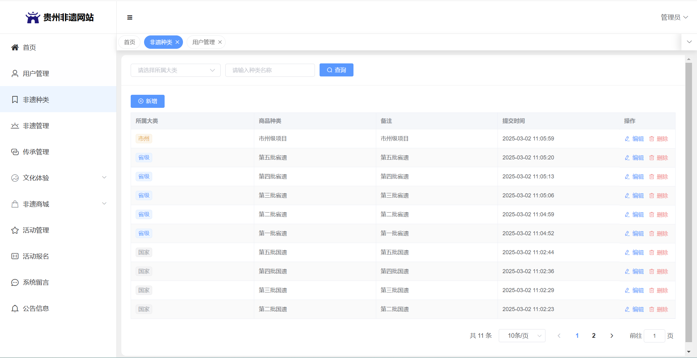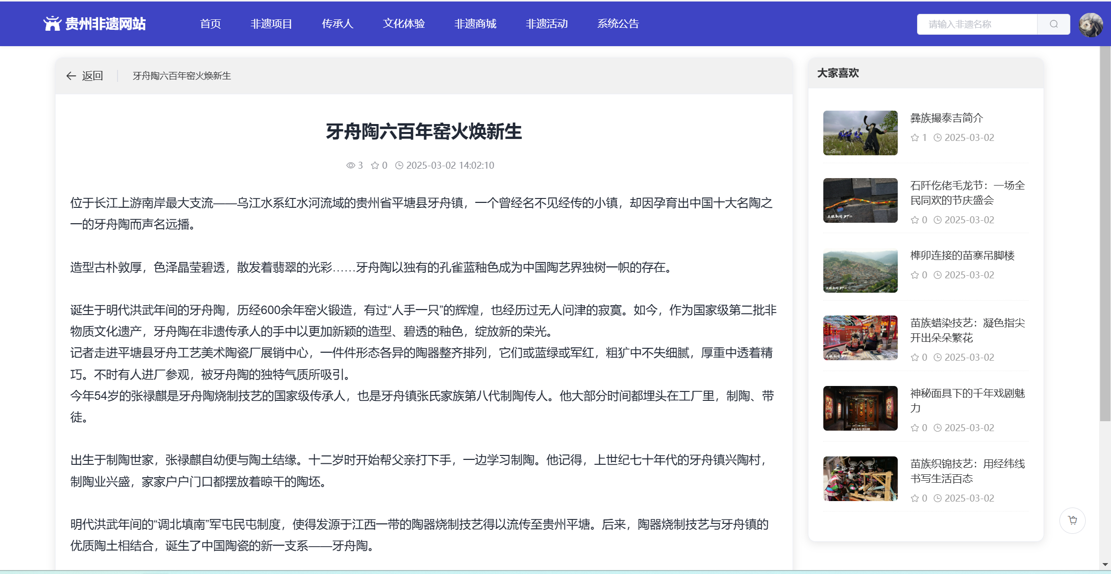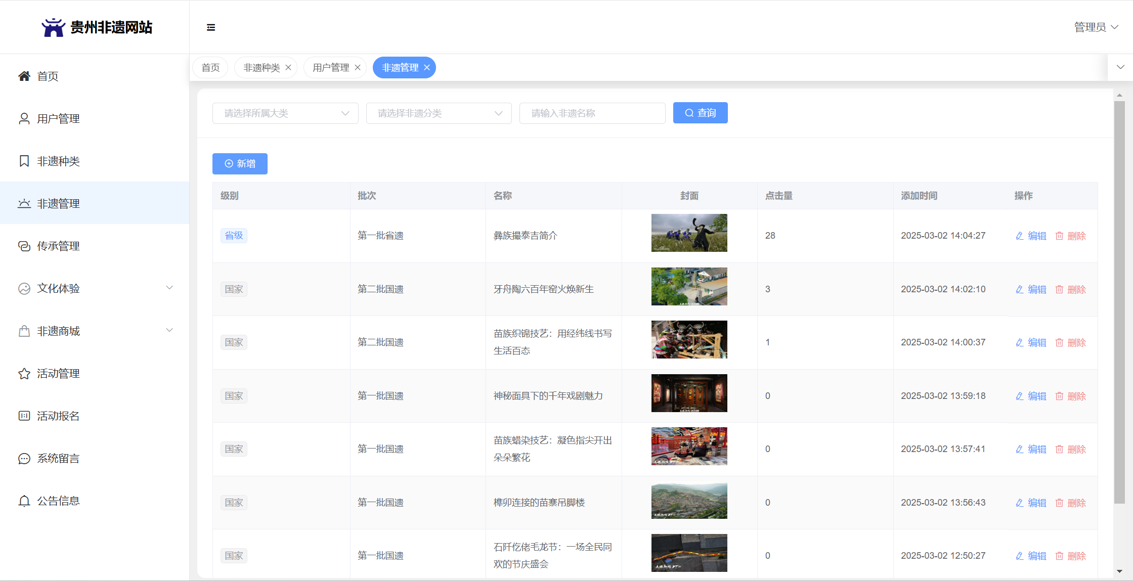 基于SpringBoot+Vue前后端分离的贵州非遗网站,系统包含管理员、用户角色,功能如下: