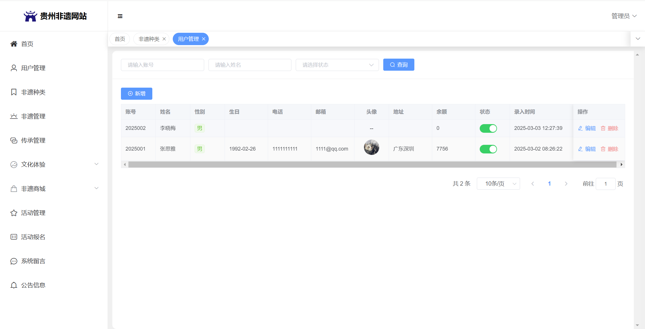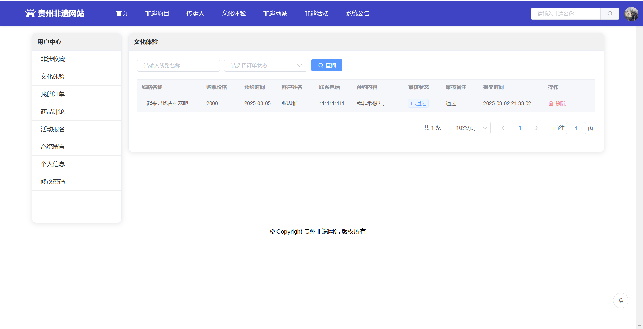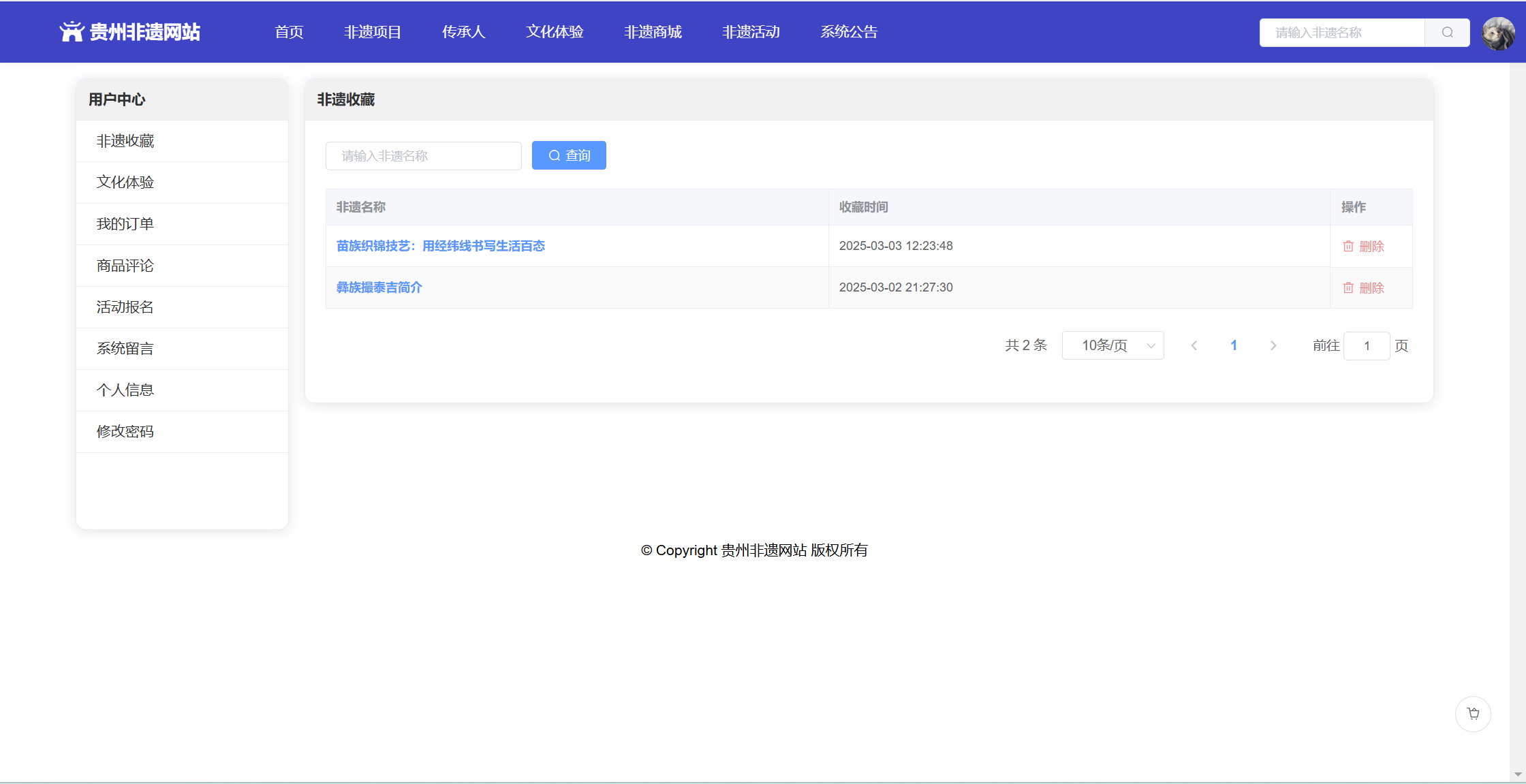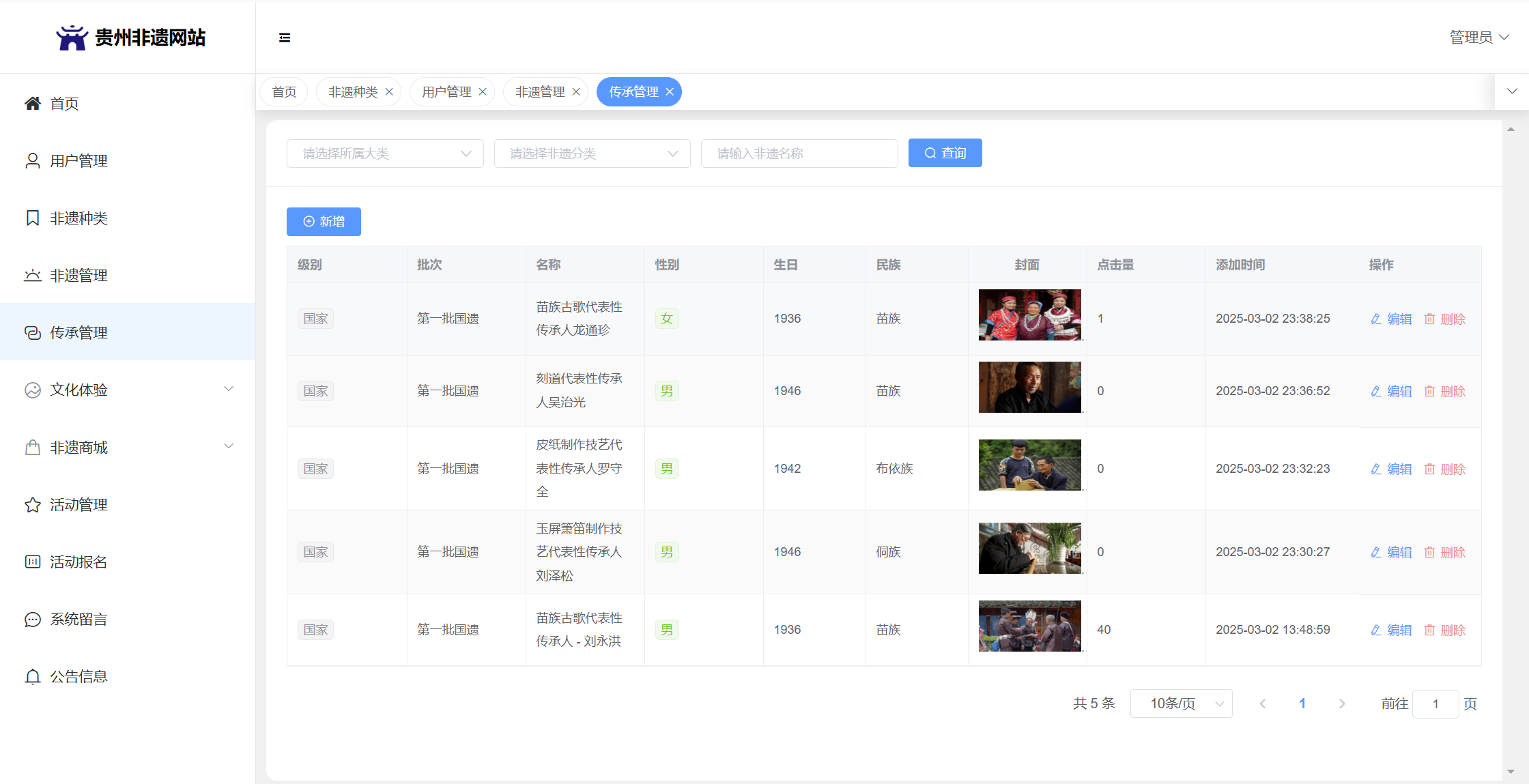 基于SpringBoot+Vue前后端分离的贵州非遗网站,系统包含管理员、用户角色,功能如下: