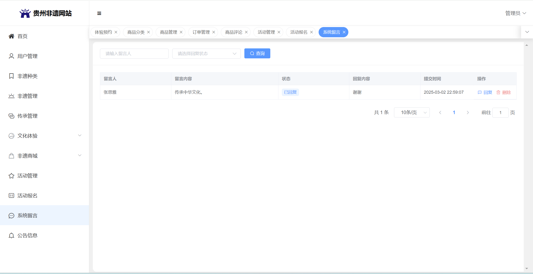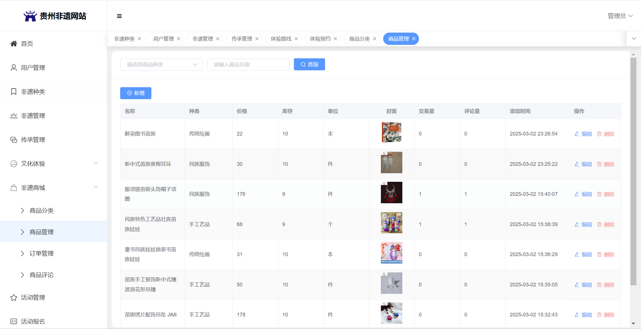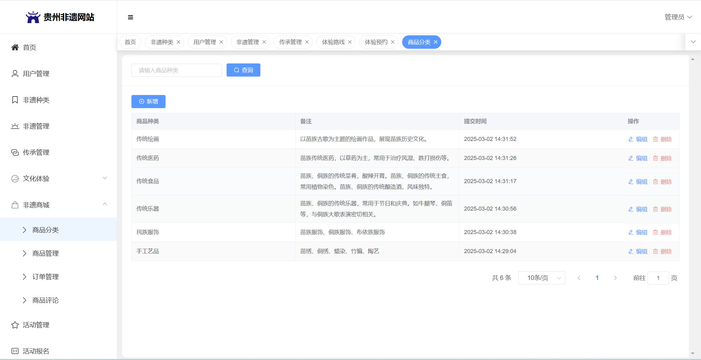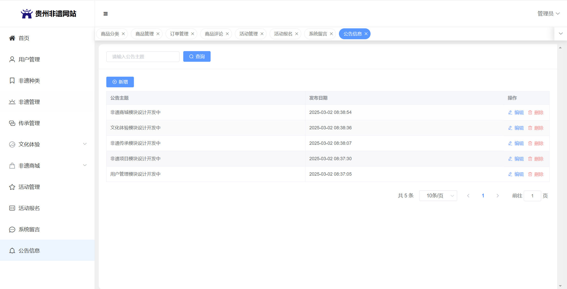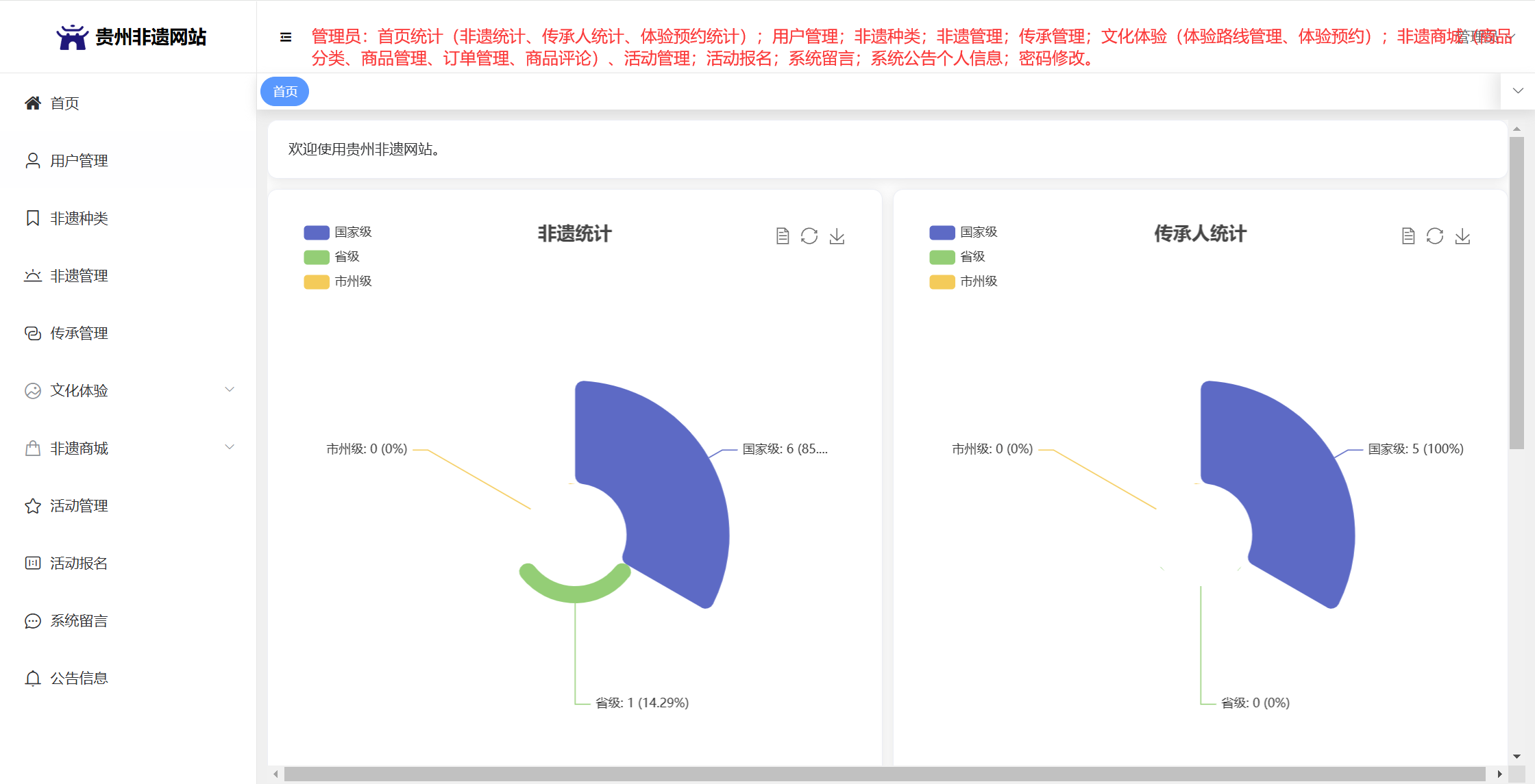 管理员:首页统计(非遗统计、传承人统计、体验预约统计);用户管理;非遗种类;非遗管理;传承管理;文化体验(体验路线管理、体验预约);非遗商城(商品分类、商品管理、订单管理、商品评论)、活动管理;活动报名;系统留言;系统公告个人信息;密码修改。