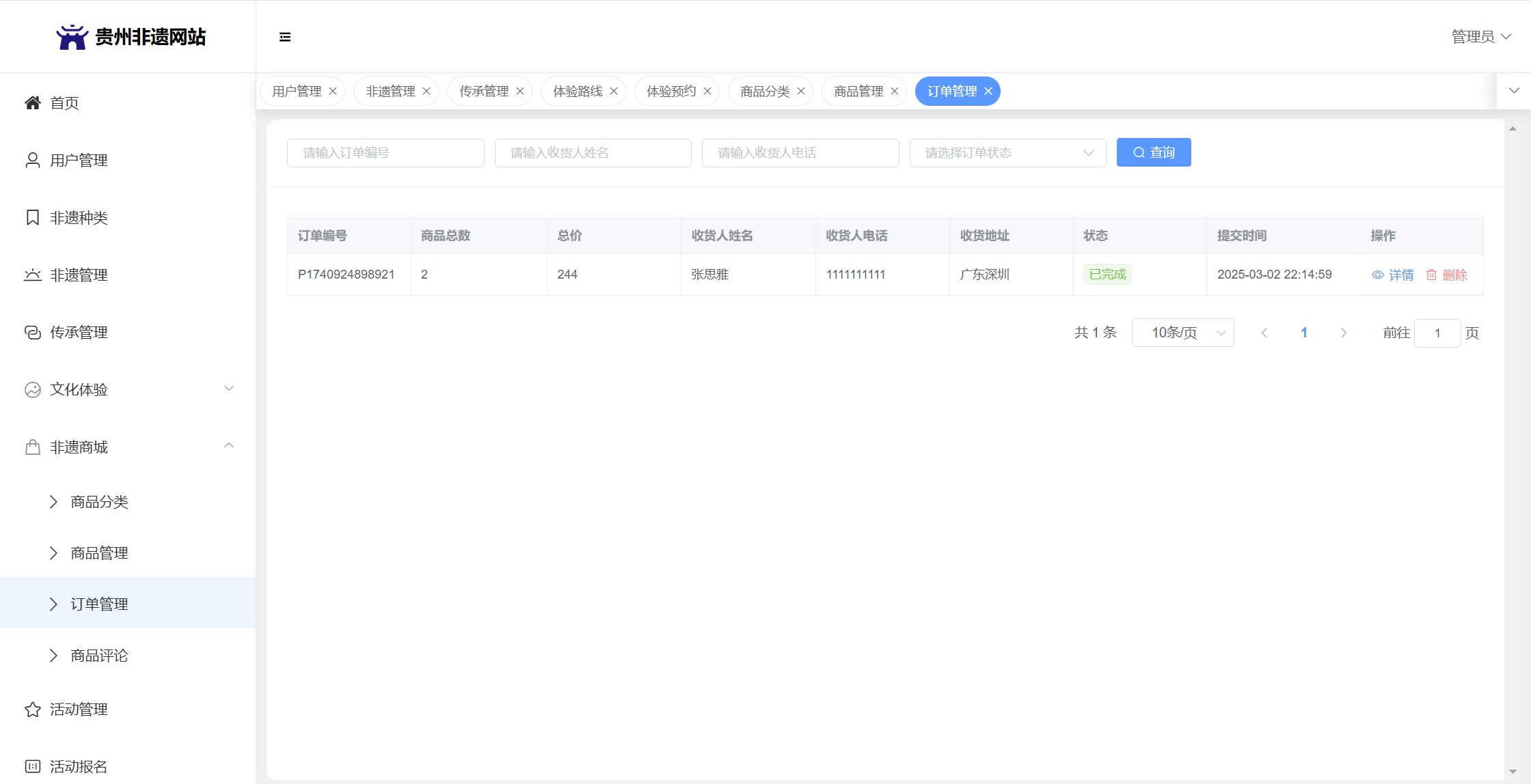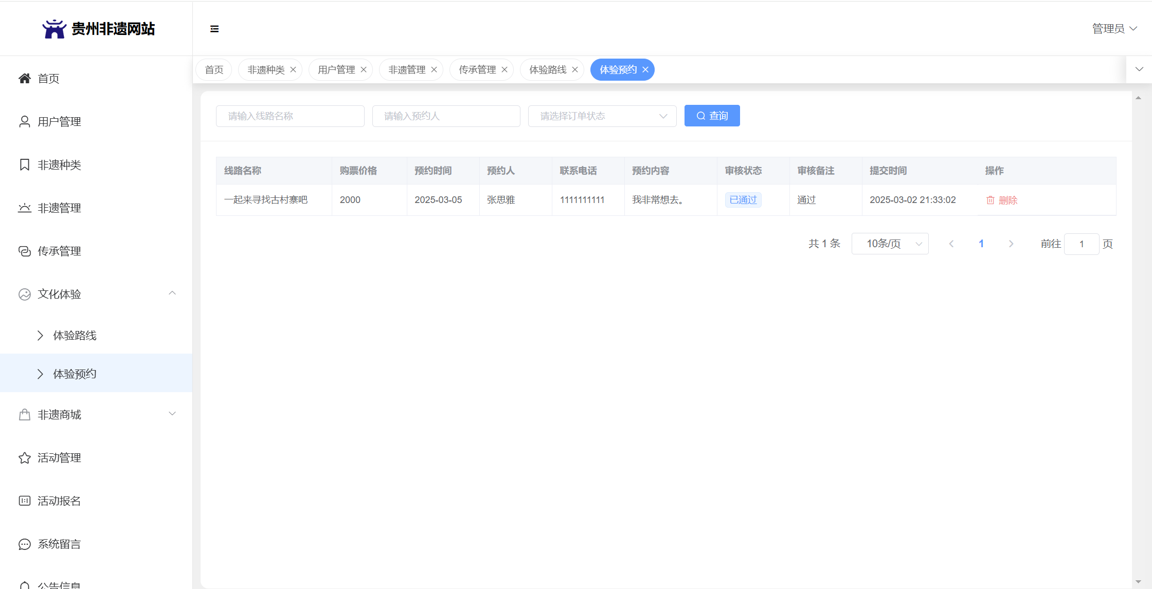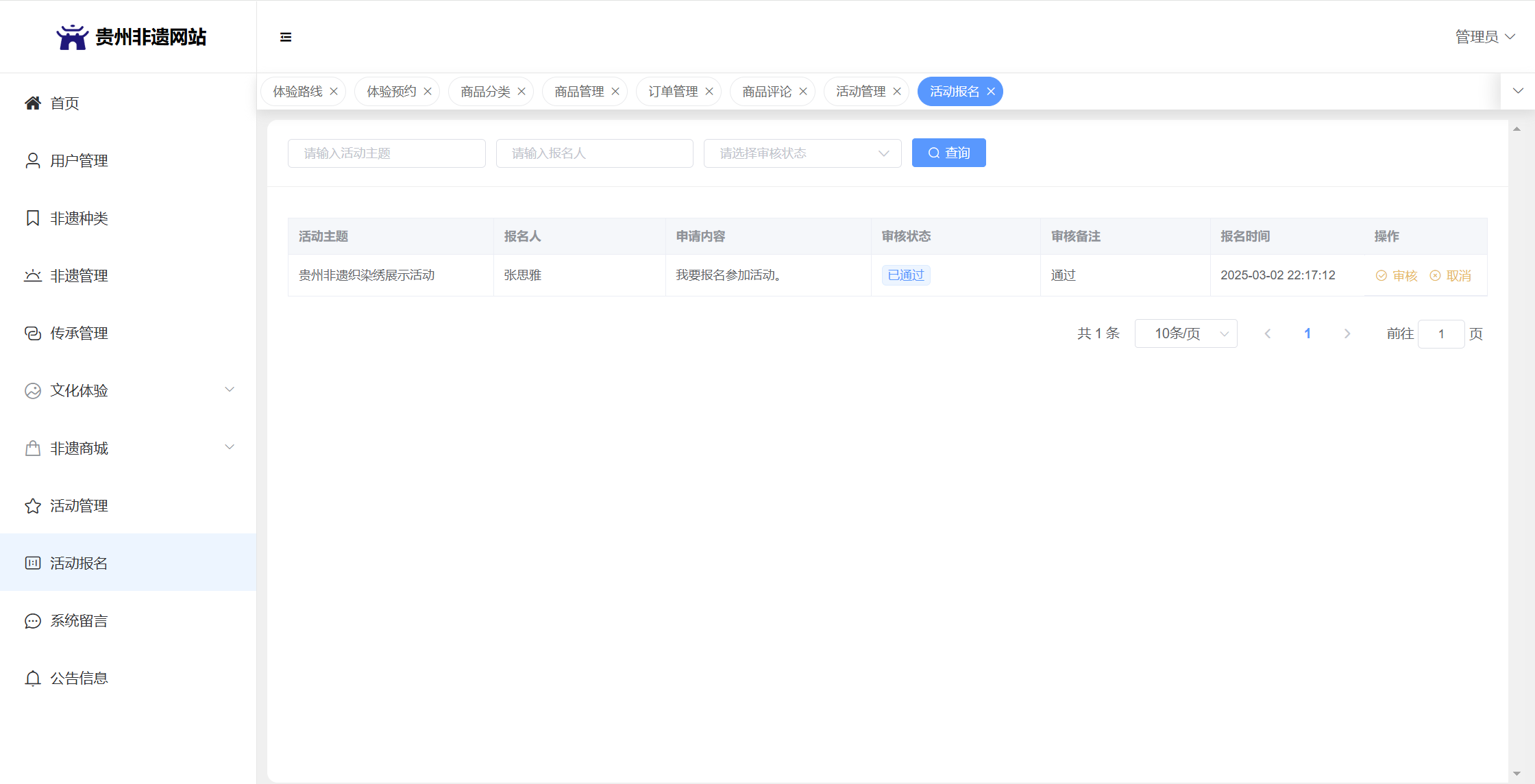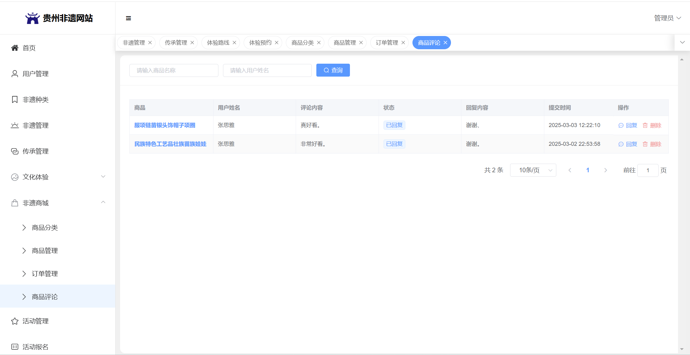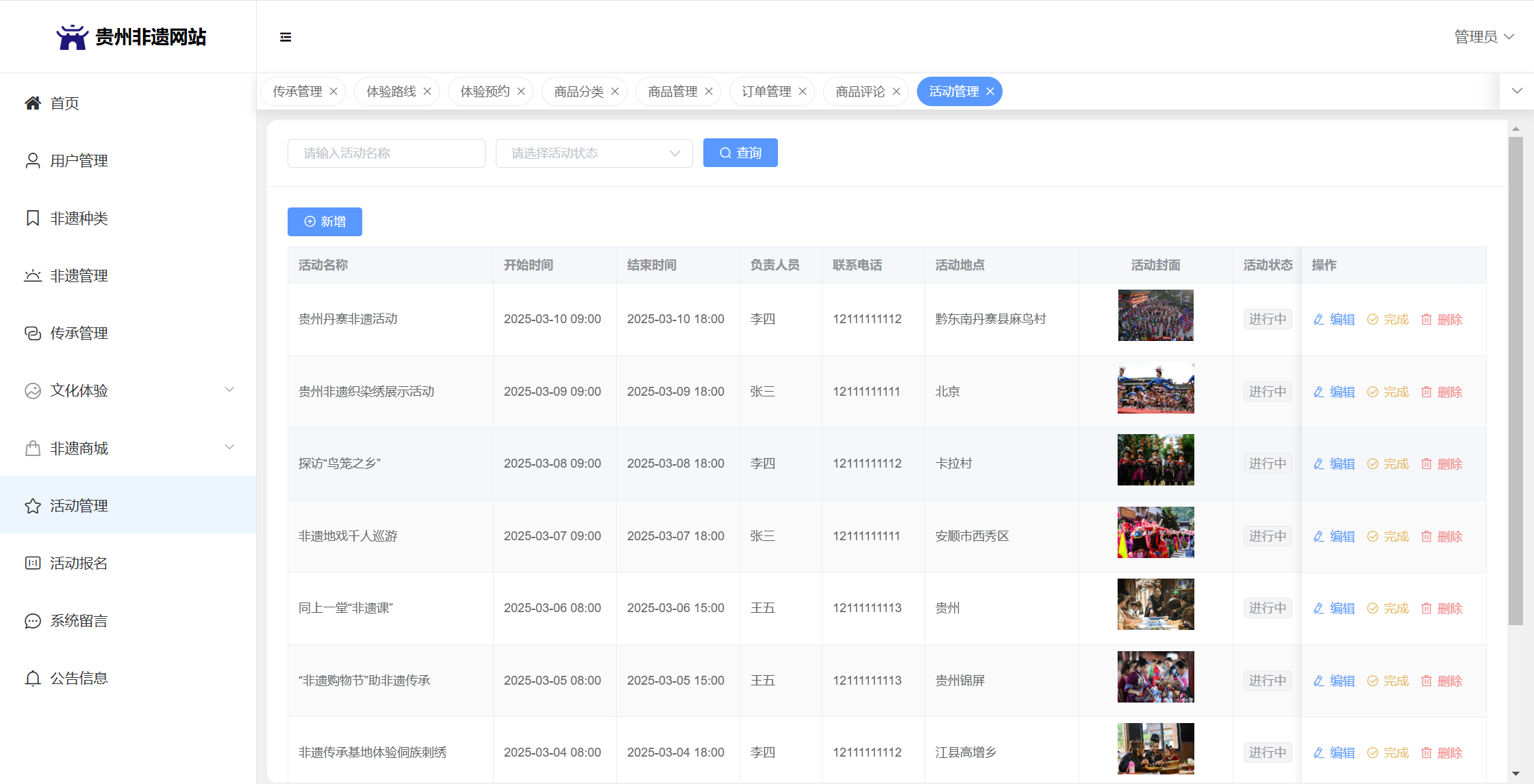 管理员:首页统计(非遗统计、传承人统计、体验预约统计);用户管理;非遗种类;非遗管理;传承管理;文化体验(体验路线管理、体验预约);非遗商城(商品分类、商品管理、订单管理、商品评论)、活动管理;活动报名;系统留言;系统公告个人信息;密码修改。