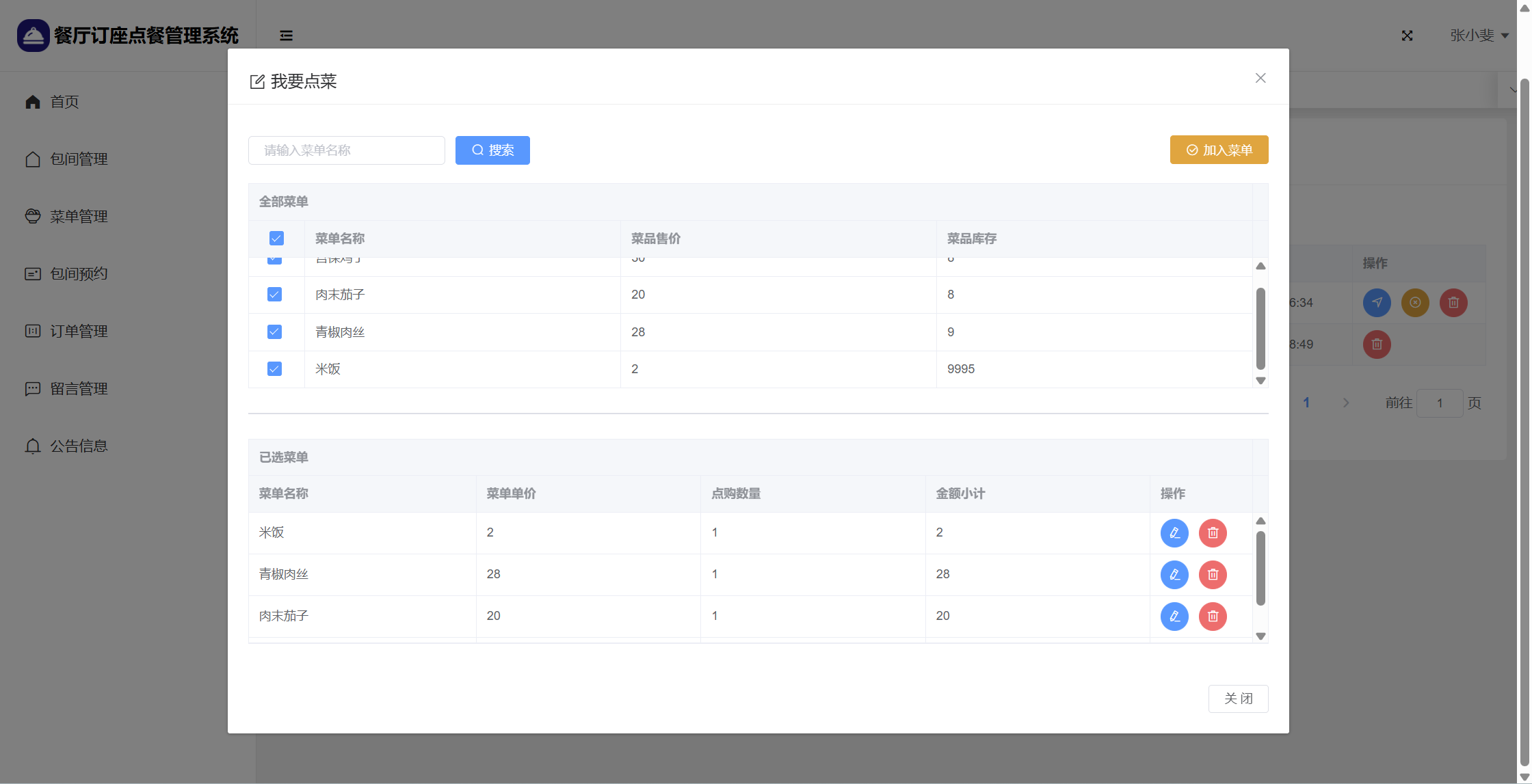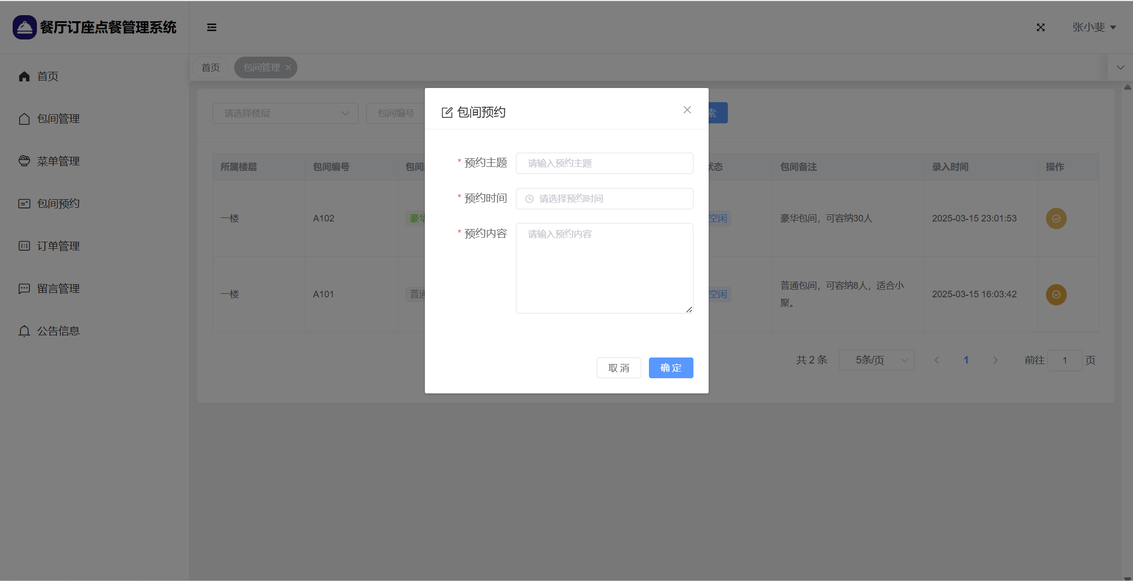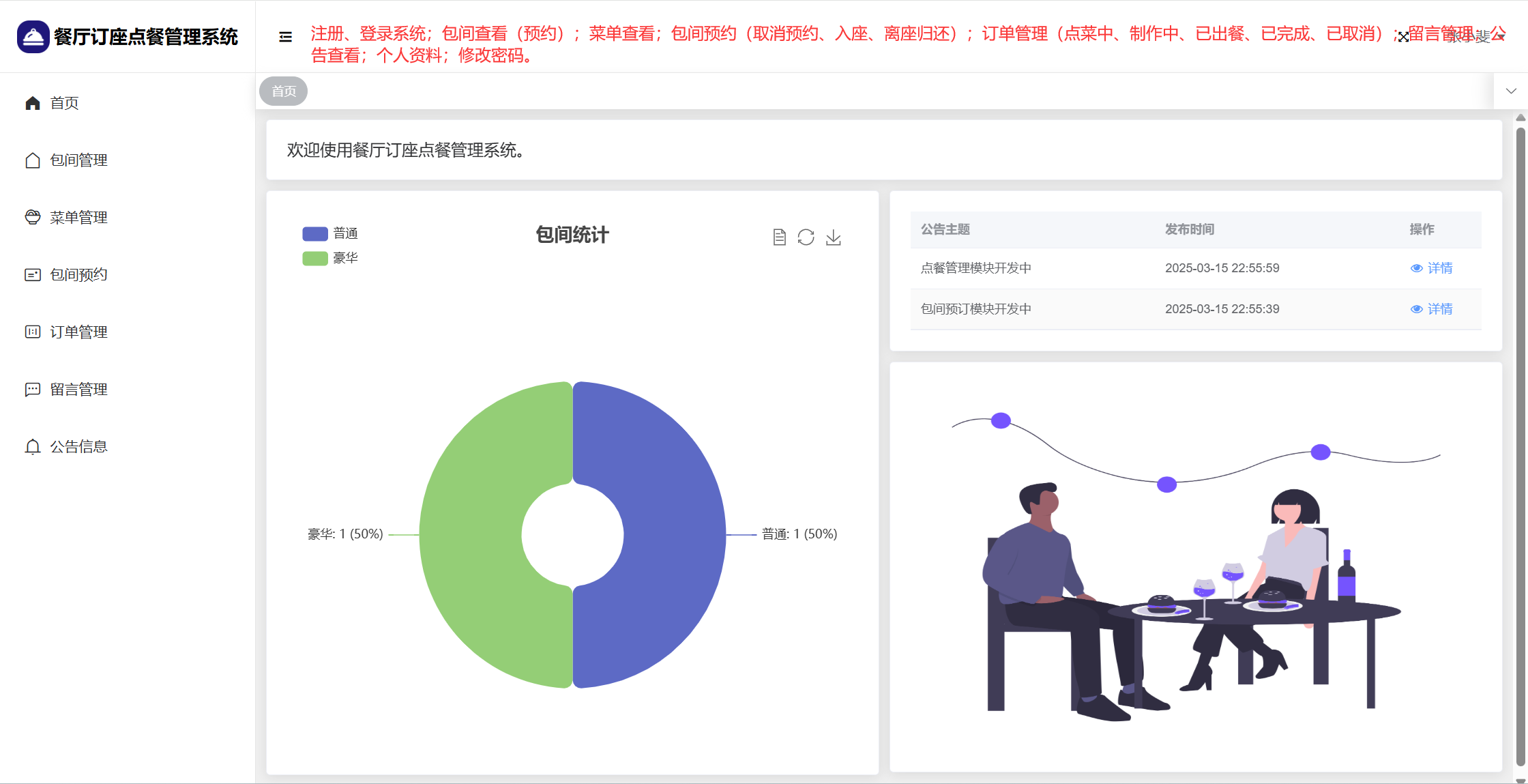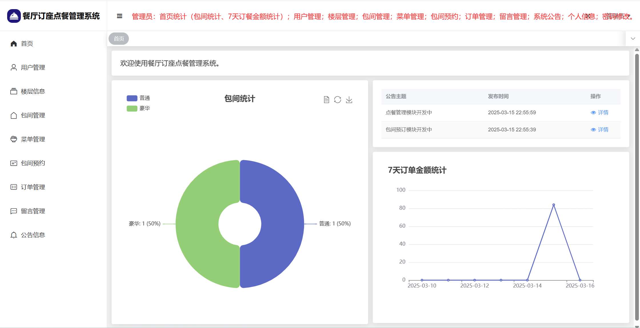 管理员:首页统计(包间统计、7天订餐金额统计);用户管理;楼层管理;包间管理;菜单管理;包间预约;订单管理;留言管理;系统公告;个人信息;密码修改。