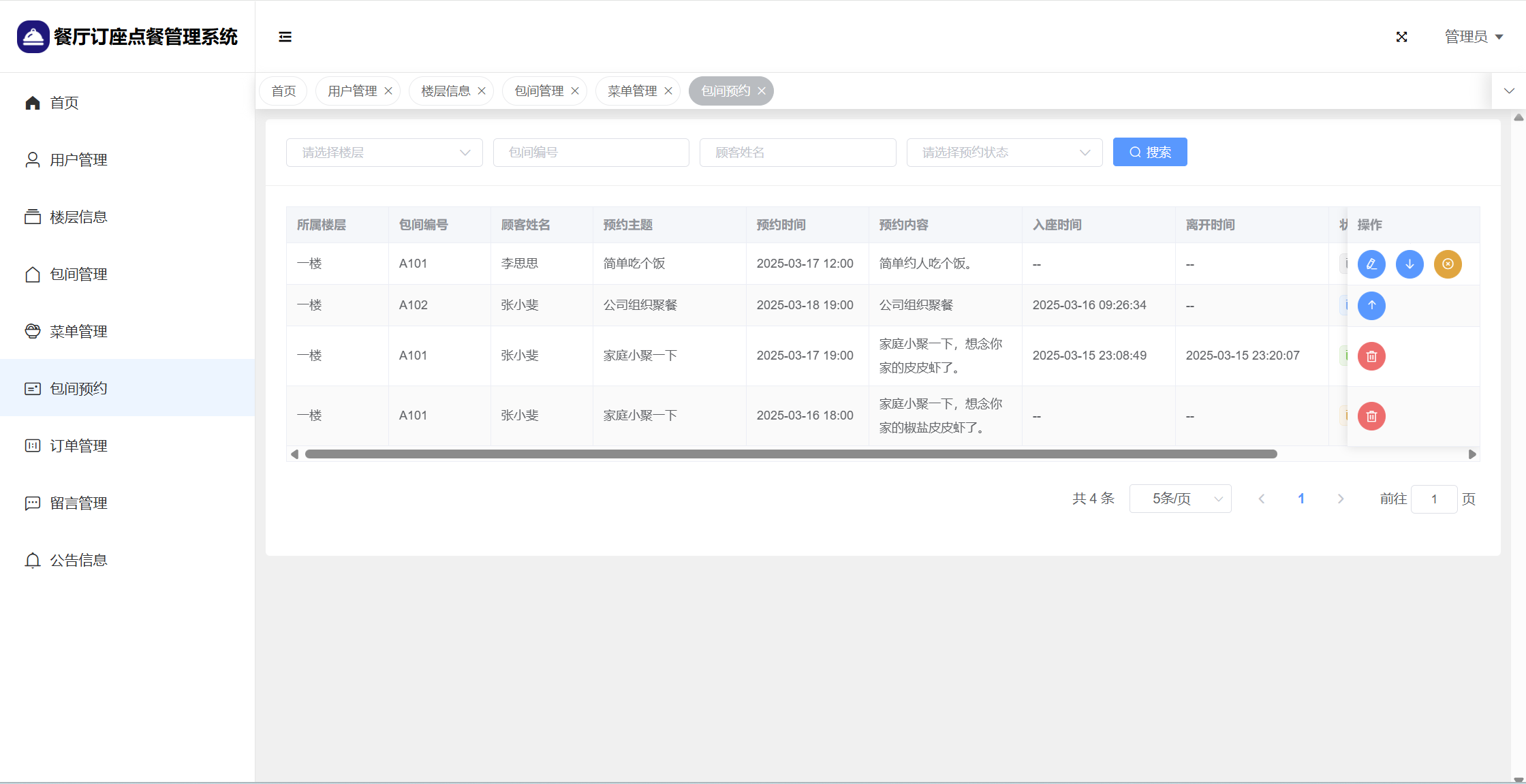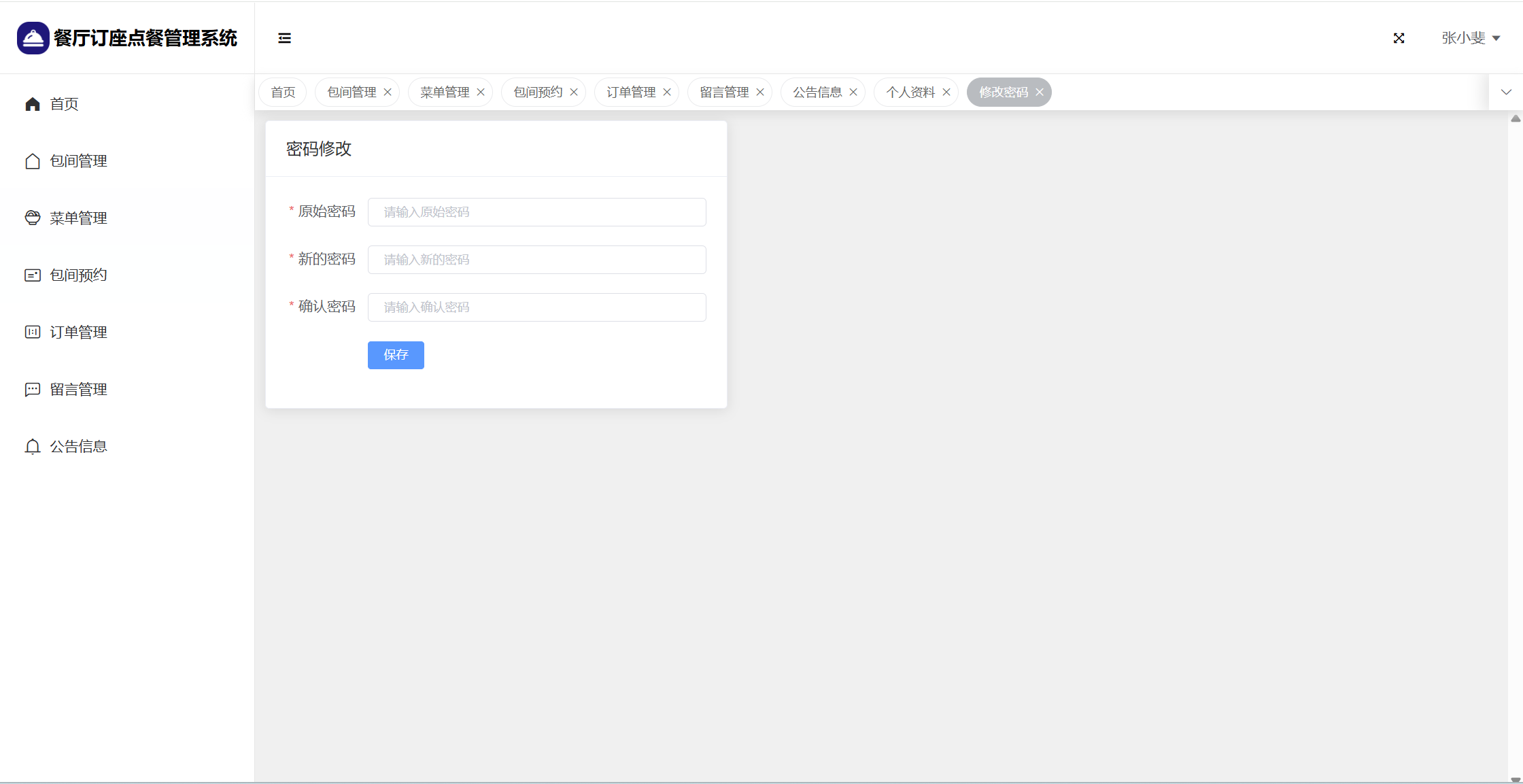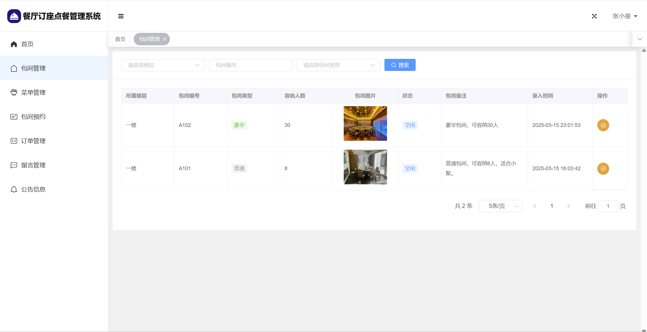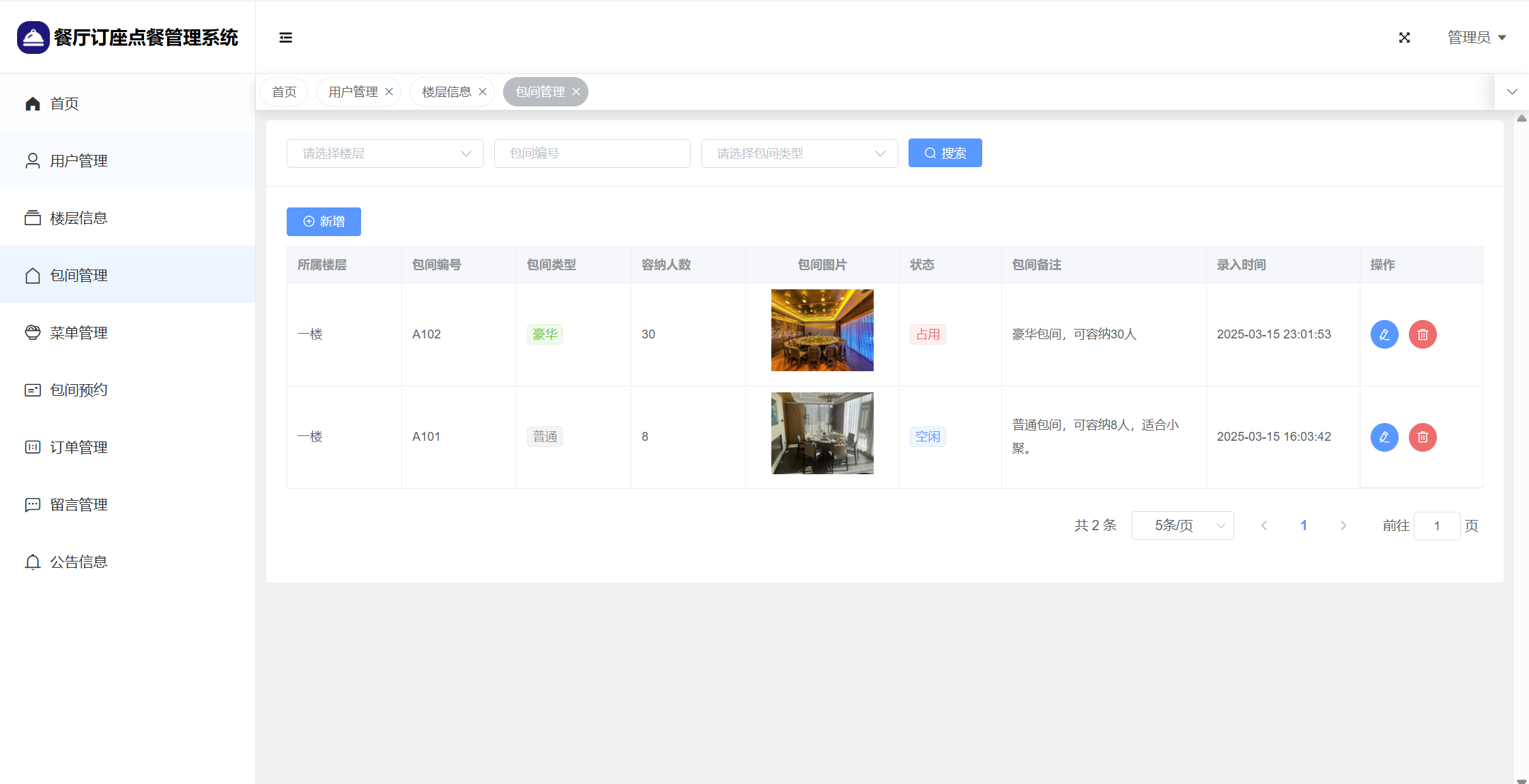 管理员:首页统计(包间统计、7天订餐金额统计);用户管理;楼层管理;包间管理;菜单管理;包间预约;订单管理;留言管理;系统公告;个人信息;密码修改。