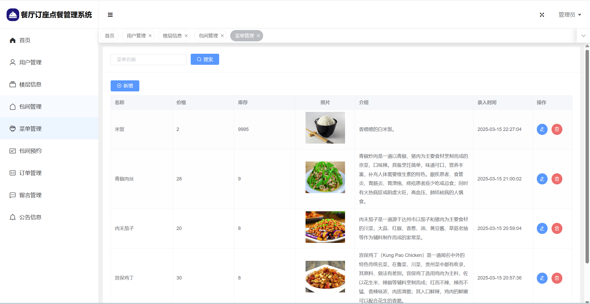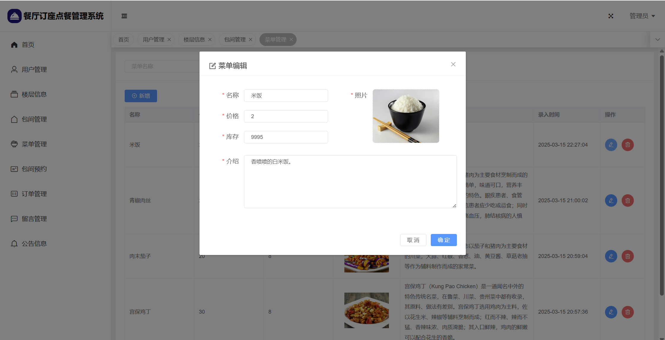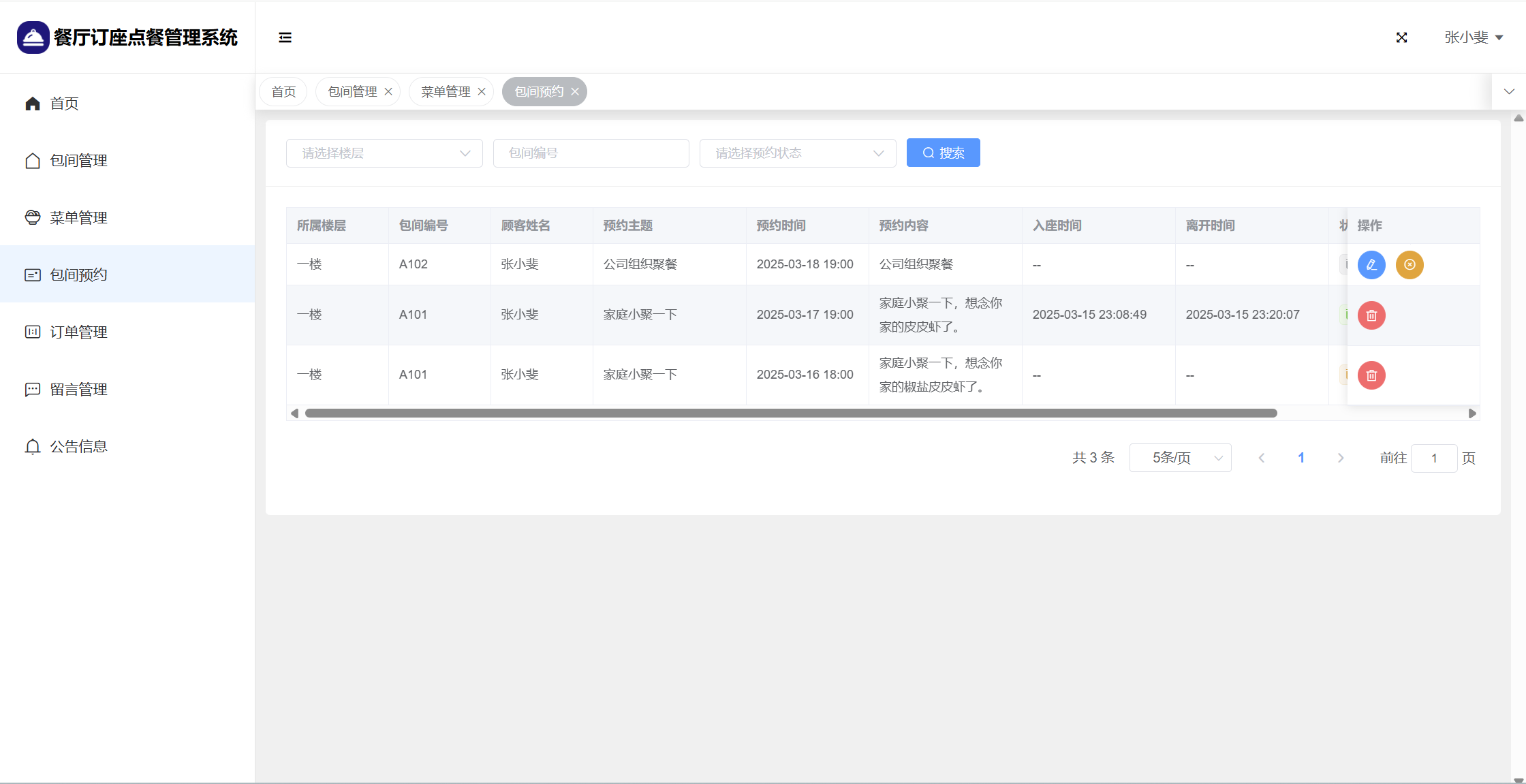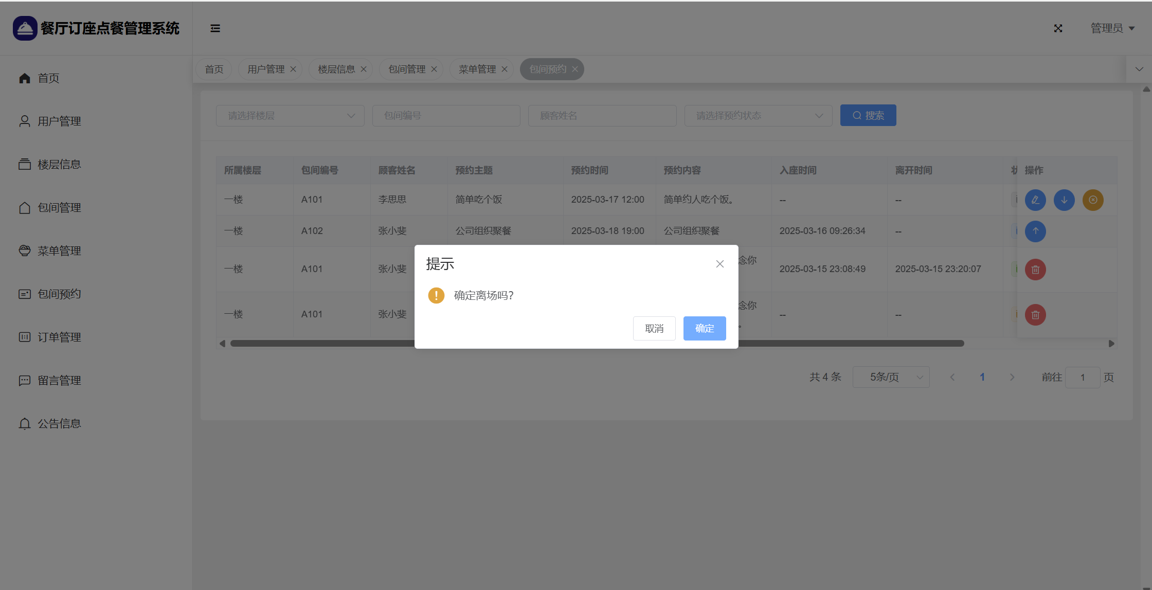 管理员:首页统计(包间统计、7天订餐金额统计);用户管理;楼层管理;包间管理;菜单管理;包间预约;订单管理;留言管理;系统公告;个人信息;密码修改。
