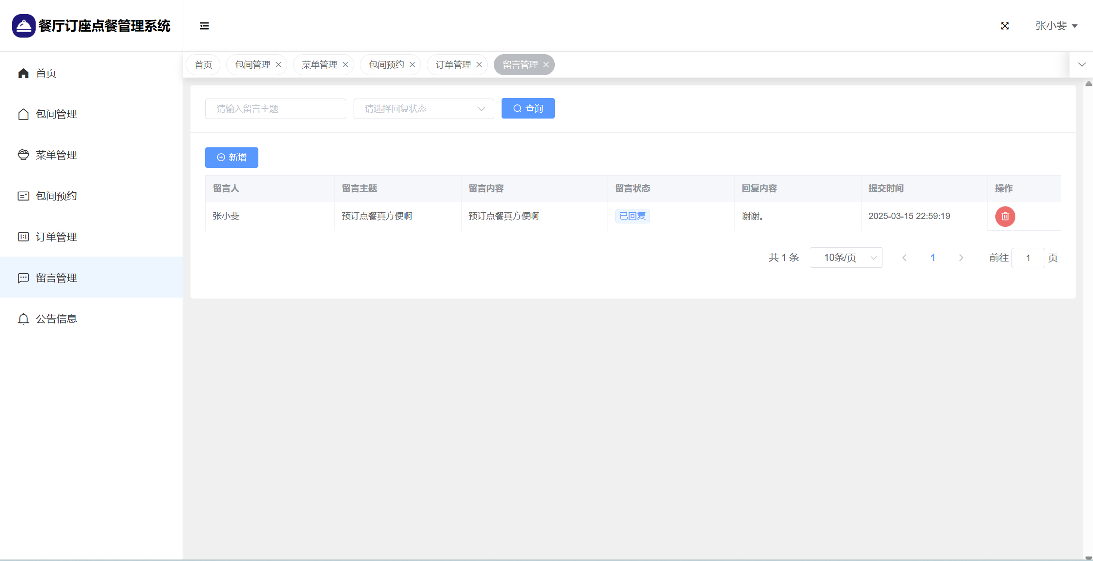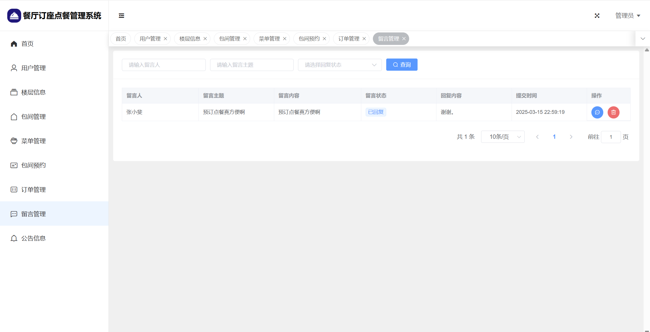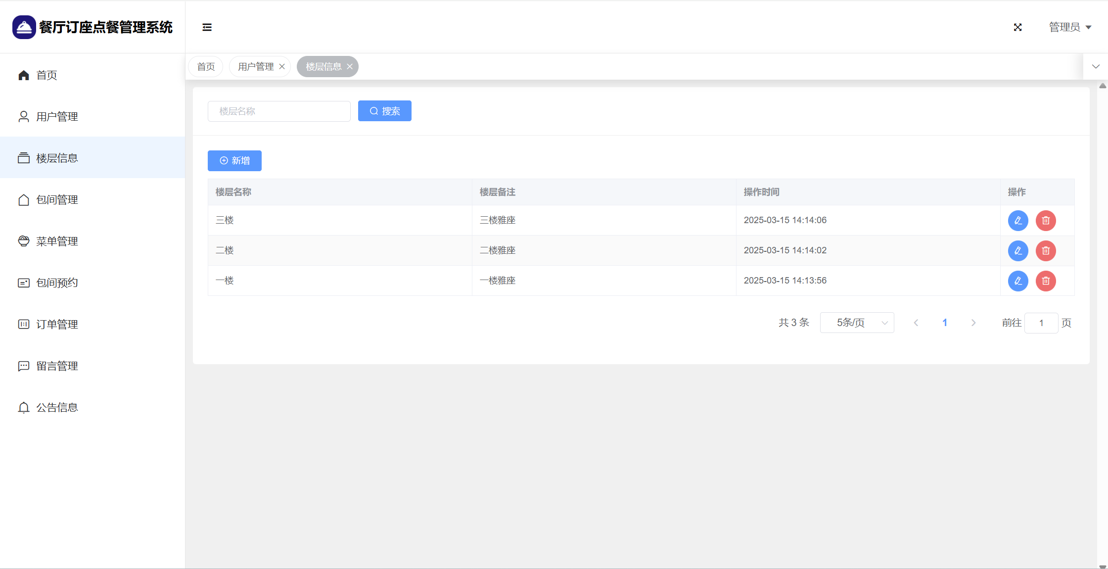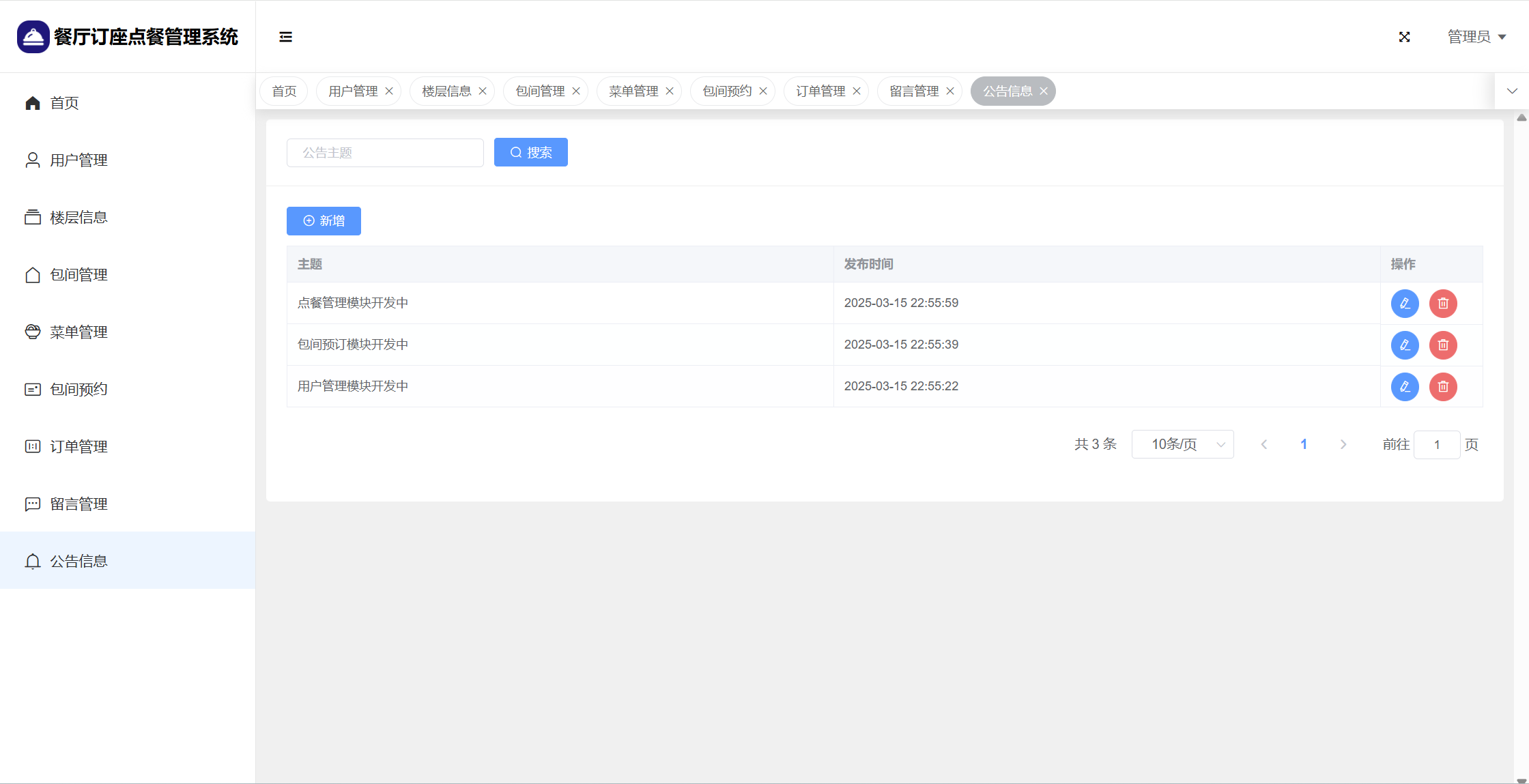 管理员:首页统计(包间统计、7天订餐金额统计);用户管理;楼层管理;包间管理;菜单管理;包间预约;订单管理;留言管理;系统公告;个人信息;密码修改。