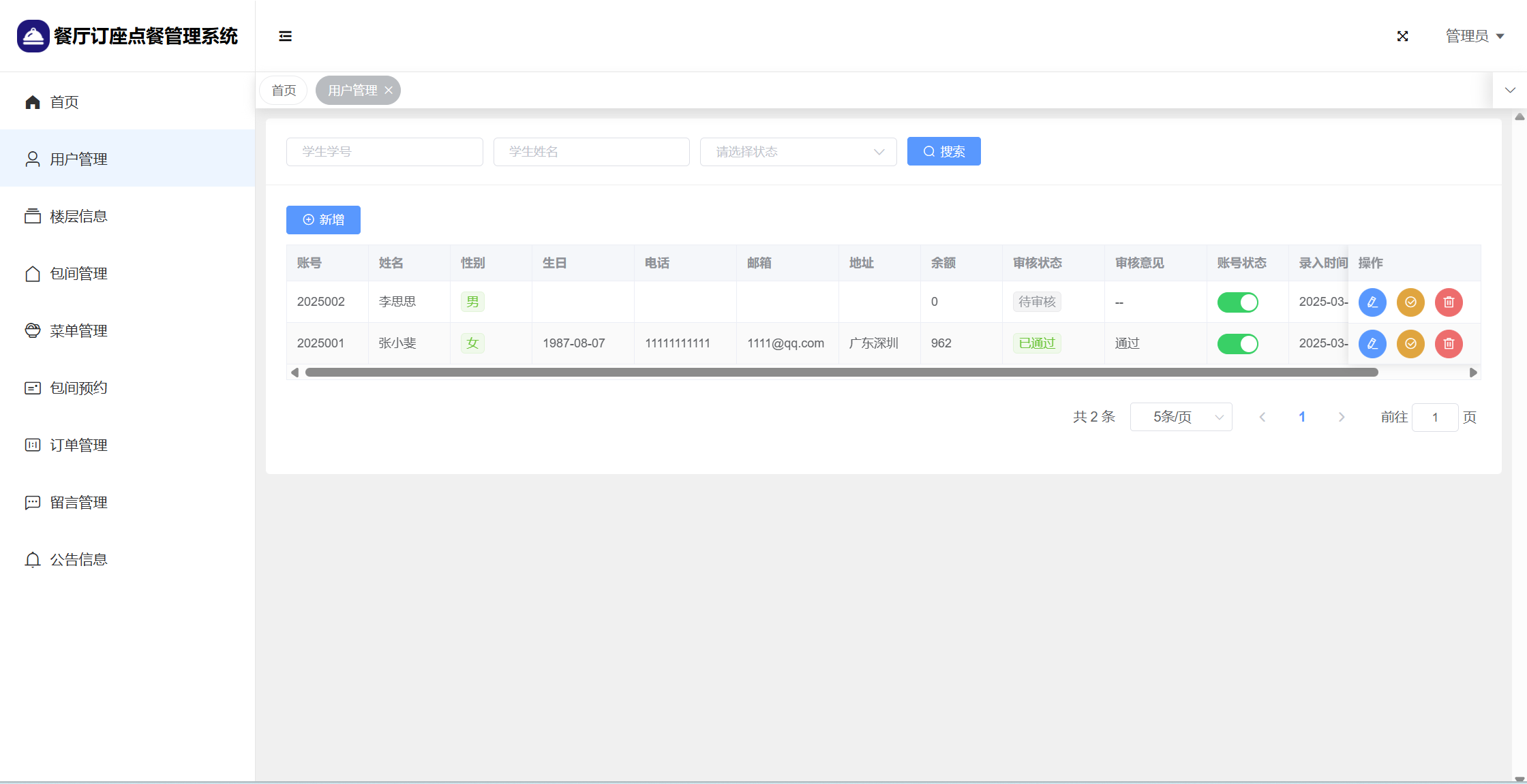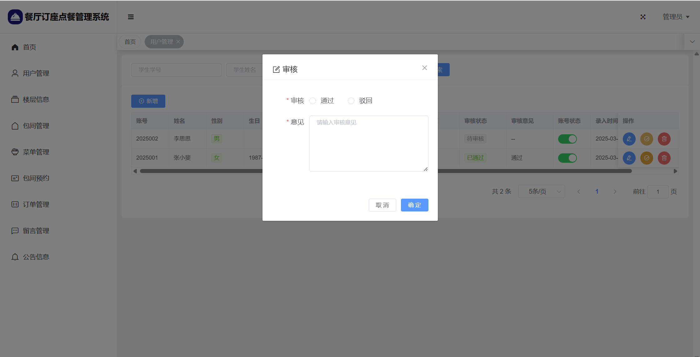 基于SpringBoot+Vue前后端分离的餐厅订座点餐管理系统,系统包含管理员、用户角色,功能如下: