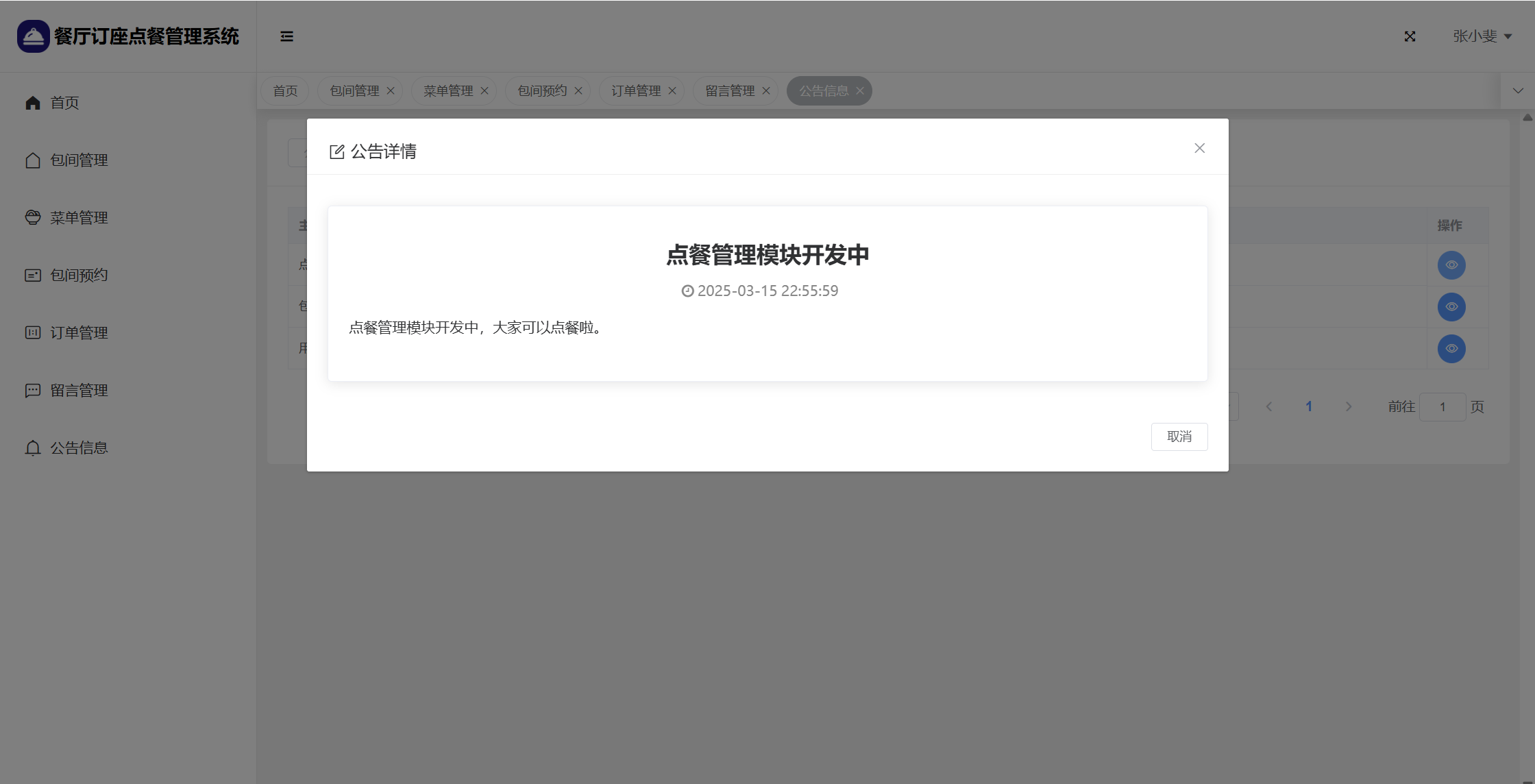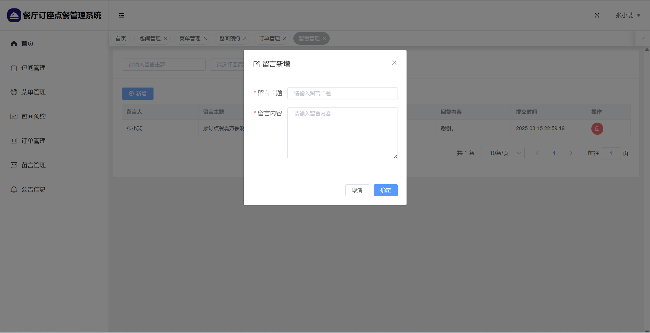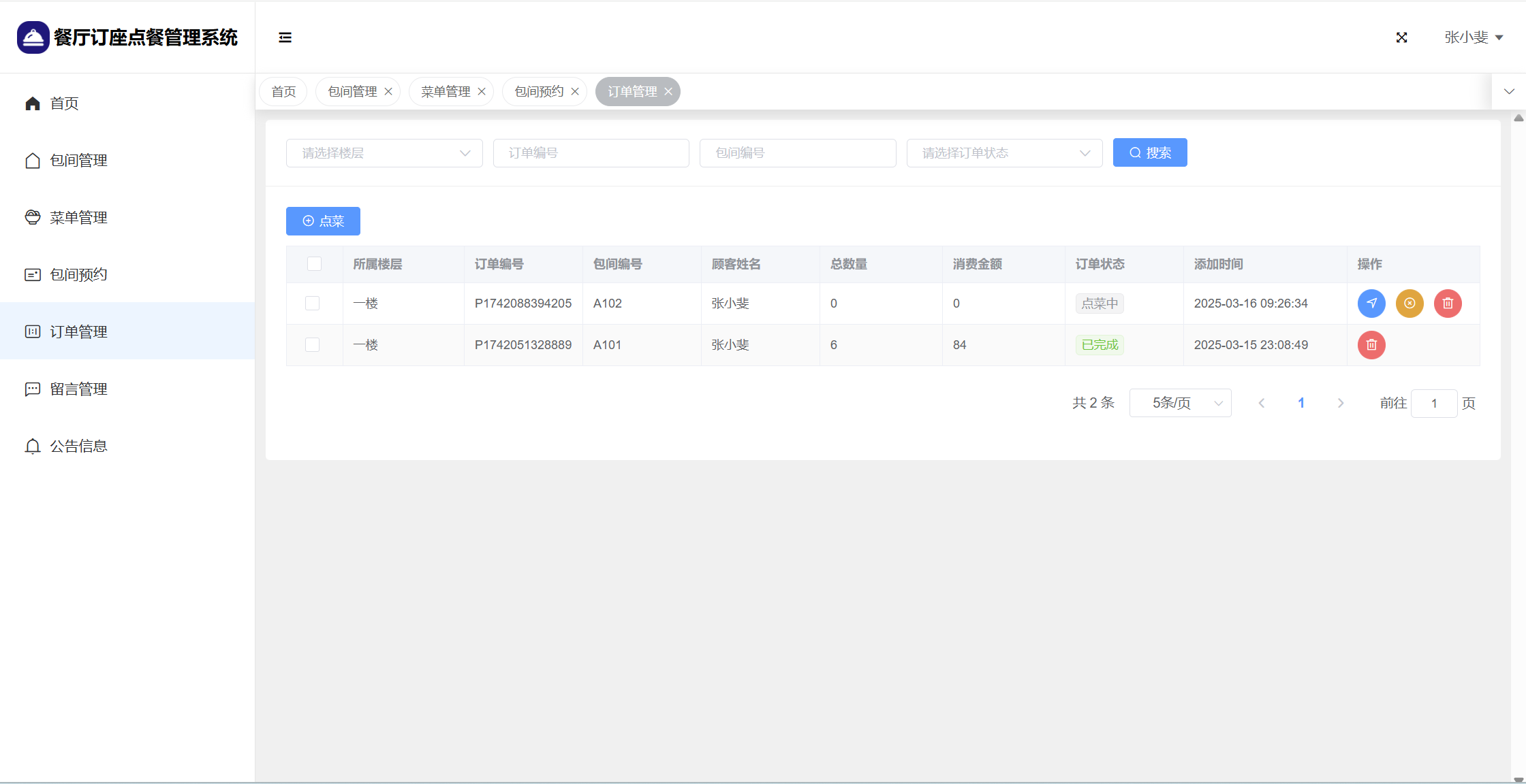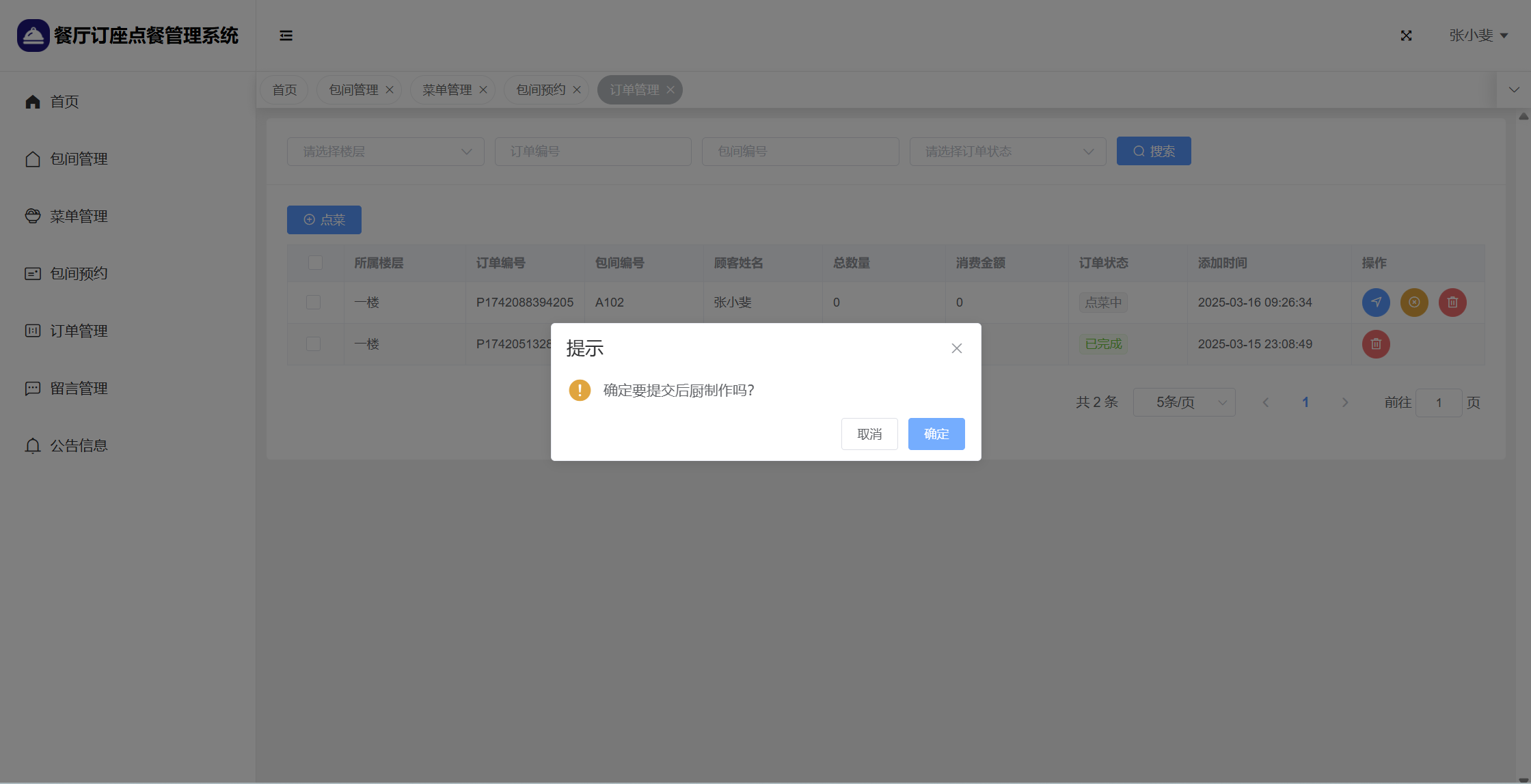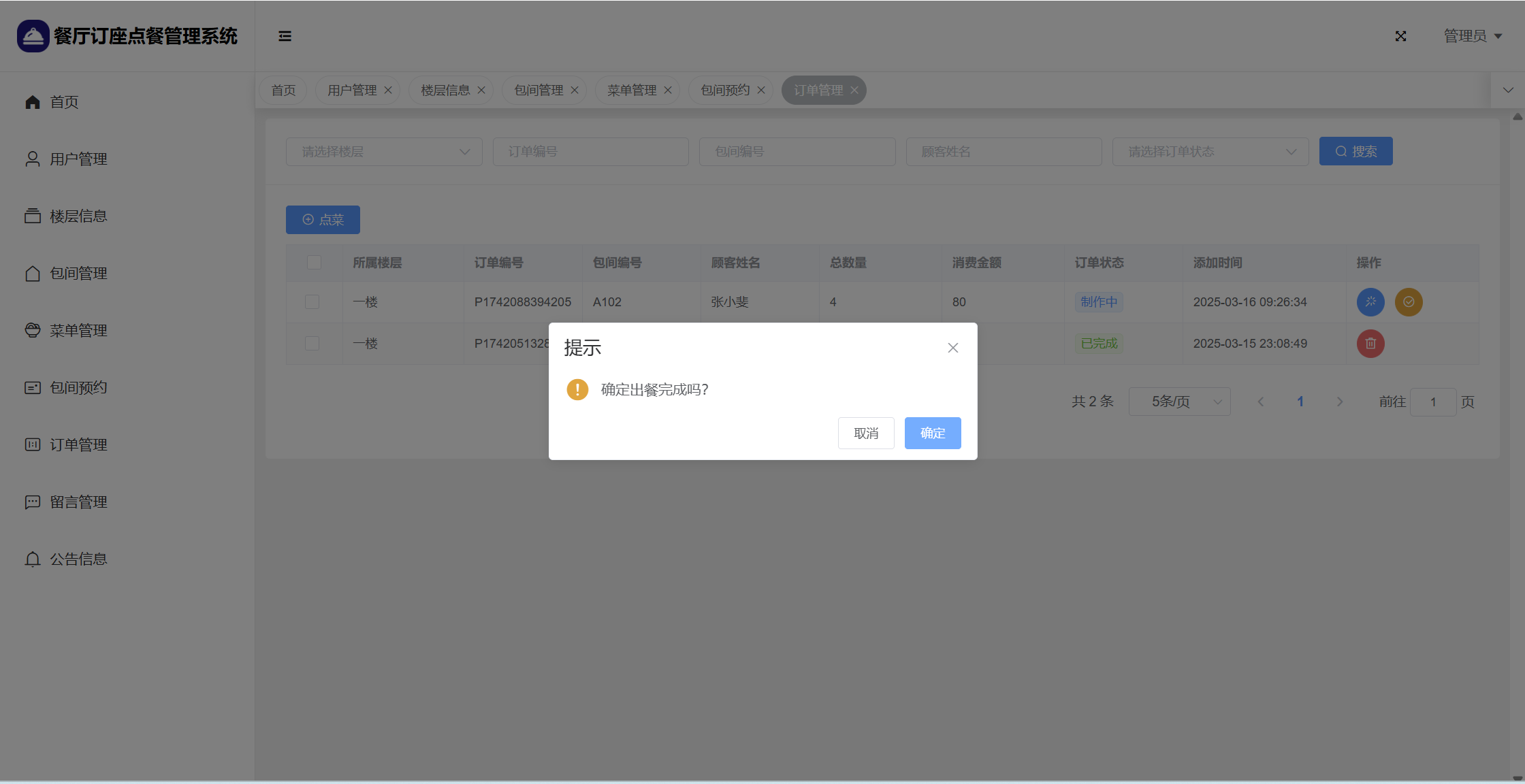 基于SpringBoot+Vue前后端分离的餐厅订座点餐管理系统,本人原创开发。
