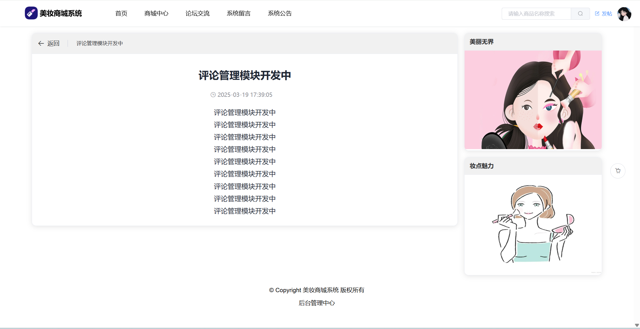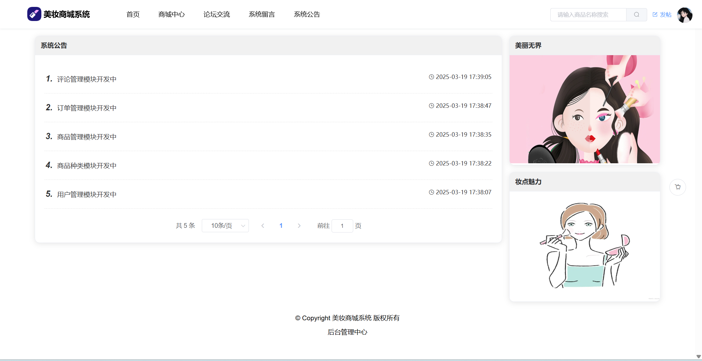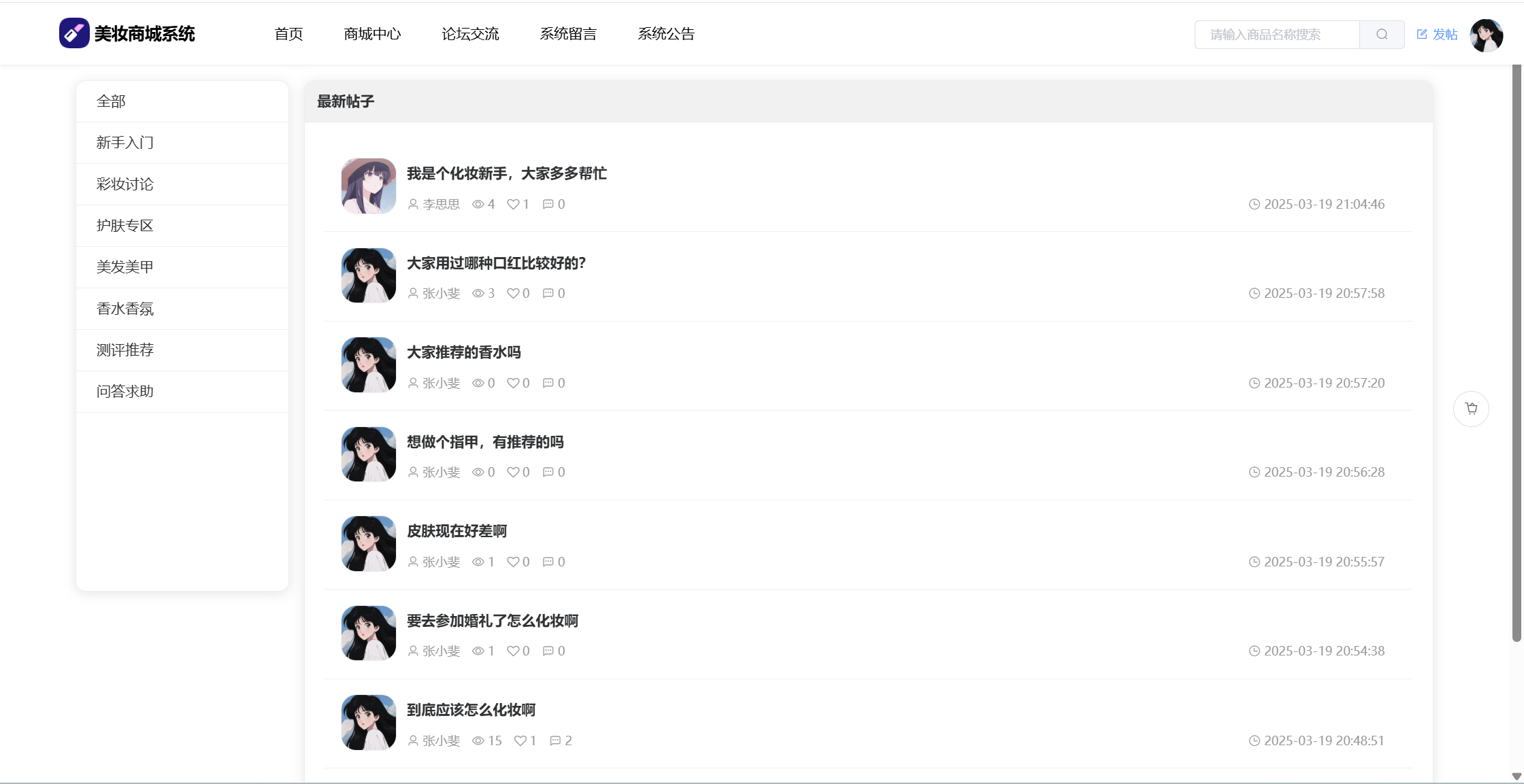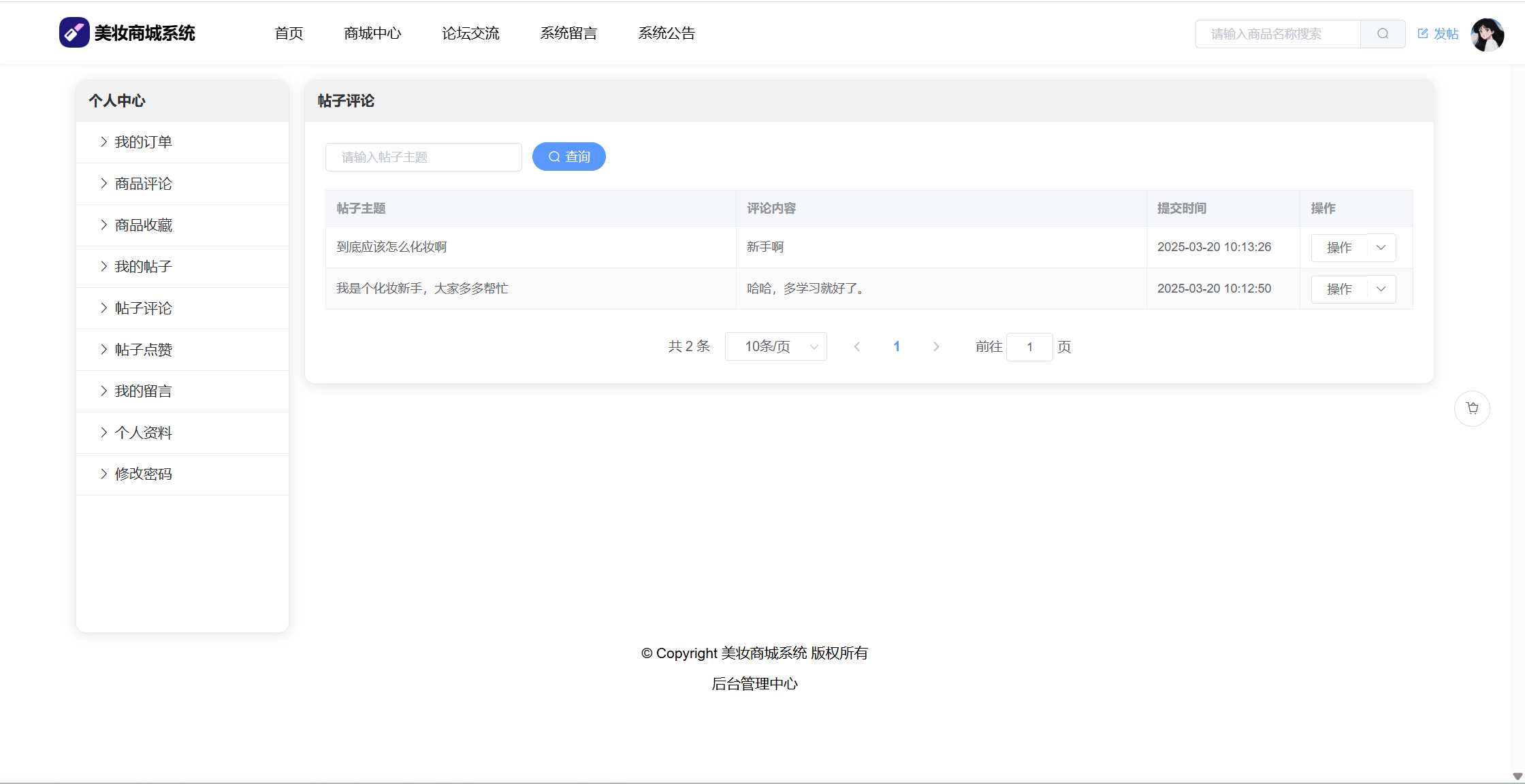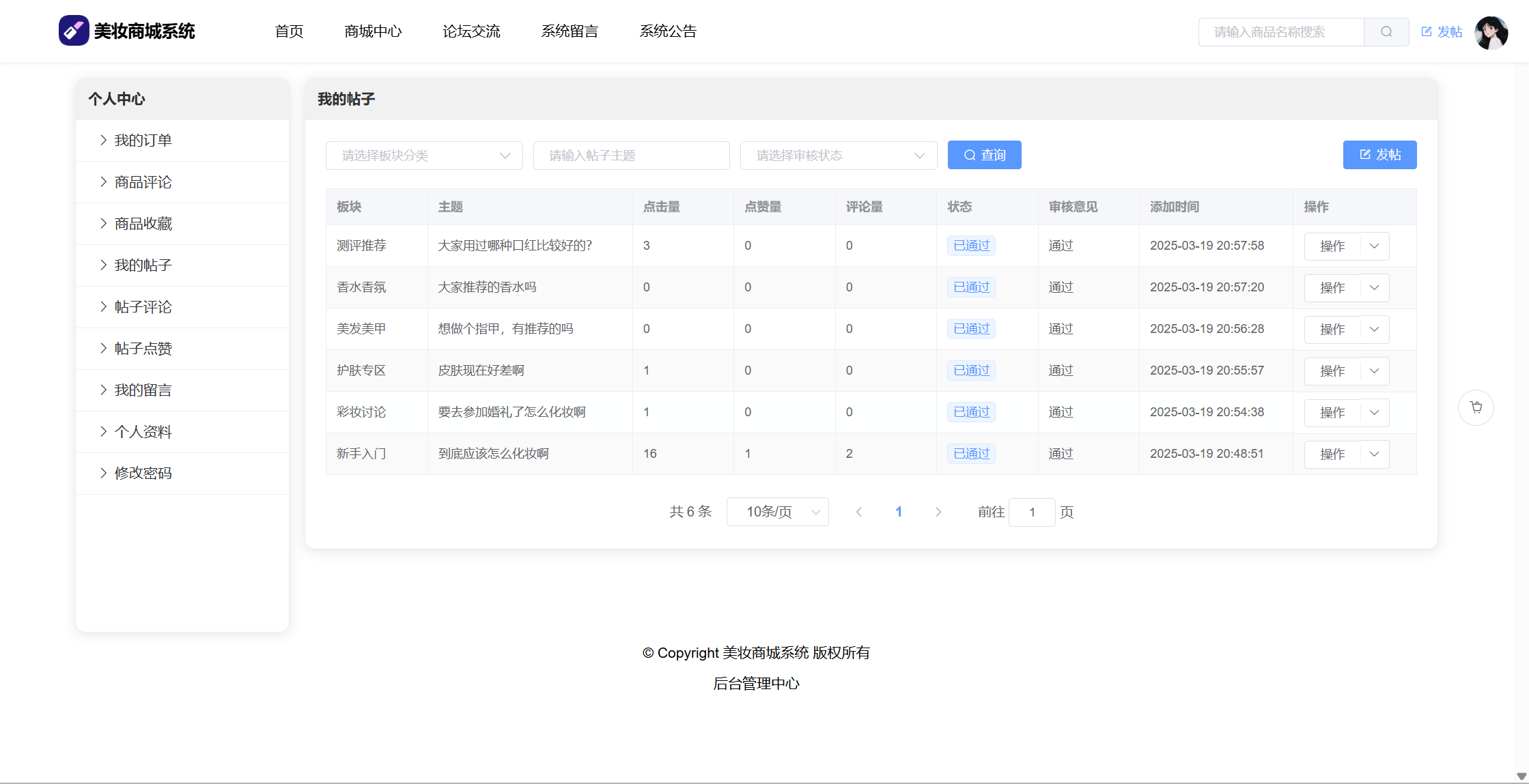 基于SpringBoot+Vue前后端分离的美妆商城论坛系统,本人原创开发。