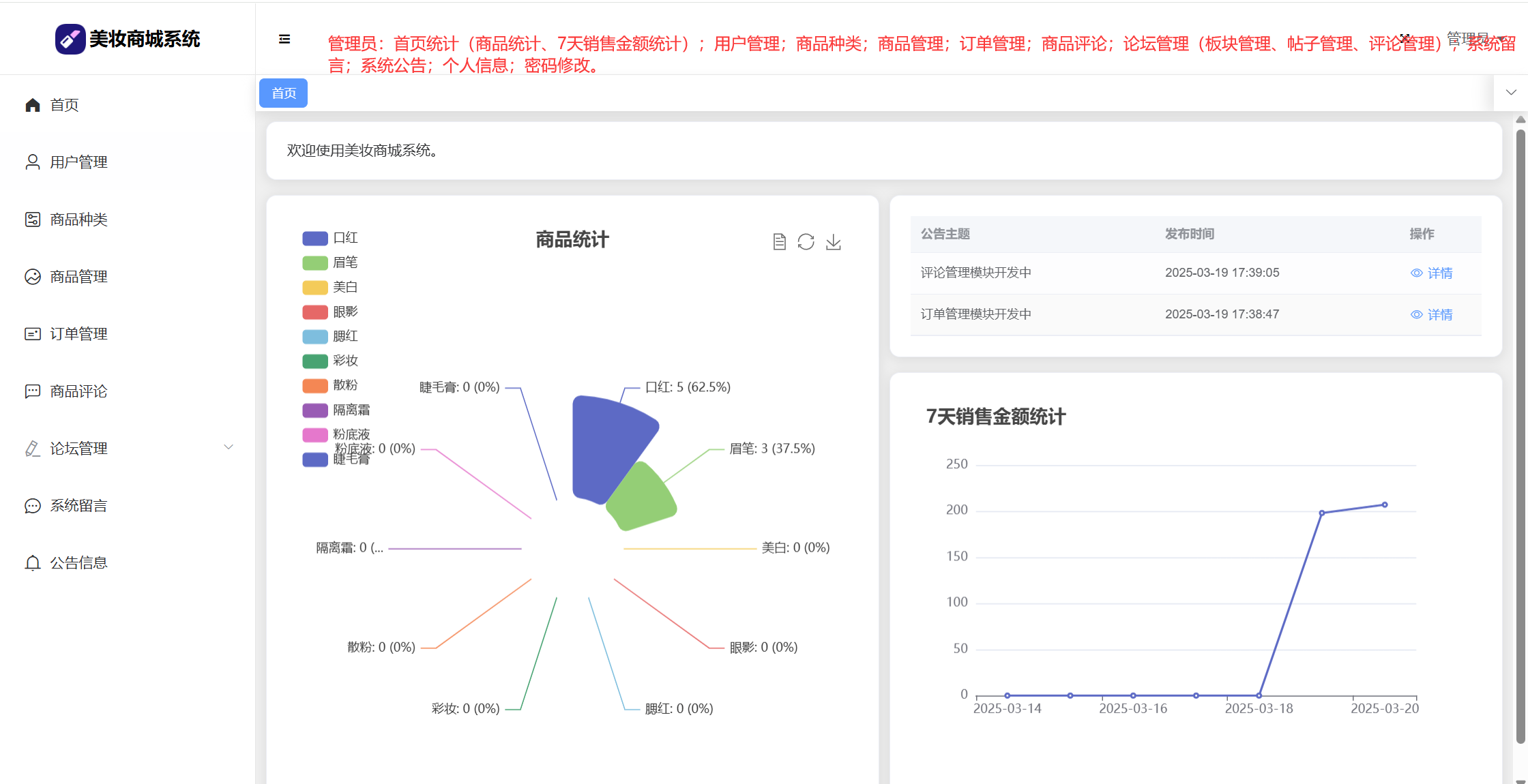管理员:首页统计(商品统计、7天销售金额统计);用户管理;商品种类;商品管理;订单管理;商品评论;论坛管理(板块管理、帖子管理、评论管理);系统留言;系统公告;个人信息;密码修改。