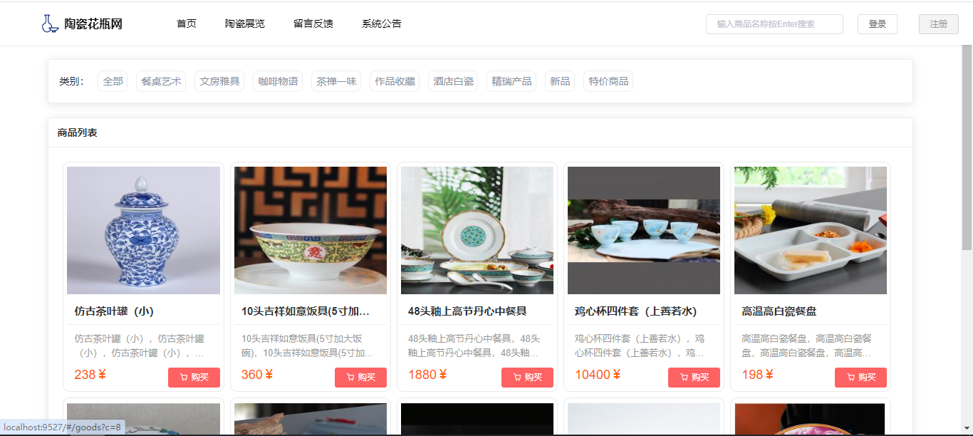 项目介绍:基于SpringBoot+Vue前后端分离的陶瓷商城网,本人原创开发。主要功能:基于SpringBoot+Vue前后端分离的陶瓷商城网,系统包含管理员、用户角色,功能如下:管理员:首页统计;用户信息;商品种类;商品管理;订单管理;评论信息;留言反馈;公告管理;个人信息;密码修改;用户:注册、登录系统;首页,陶瓷展览(商品分类、商品列表、商品详情、加入购物车、下单、评论、收藏);留言管理;公告查看;个人信息密码修改。用户个人中心:修改个人资料、我的订单、我的评论、我的收藏、我的留言、修改密码。系统界面美观大方,功能丰富,使用了SpringBoot、Vue、ElementUI、Echarts等技术栈,适合作为毕业设计、课程设计,有需要可提供指导。开发技术:服务器端:SpringBoot2、Mybatis、Mysql前端:Vue2、ElementUI、Axios、VueRouter、Echarts开发工具:服务器端:JDK1.8、IDEA2023以上、Mysql5.6以上前端:VSCode、Nodejs14以上包含项目:源码、数据库、远程安装、数据库表结构设计文档部分截图: -