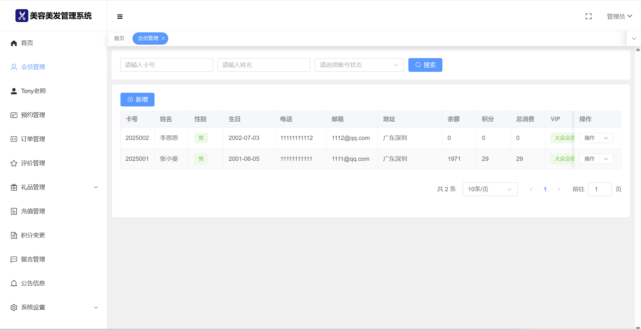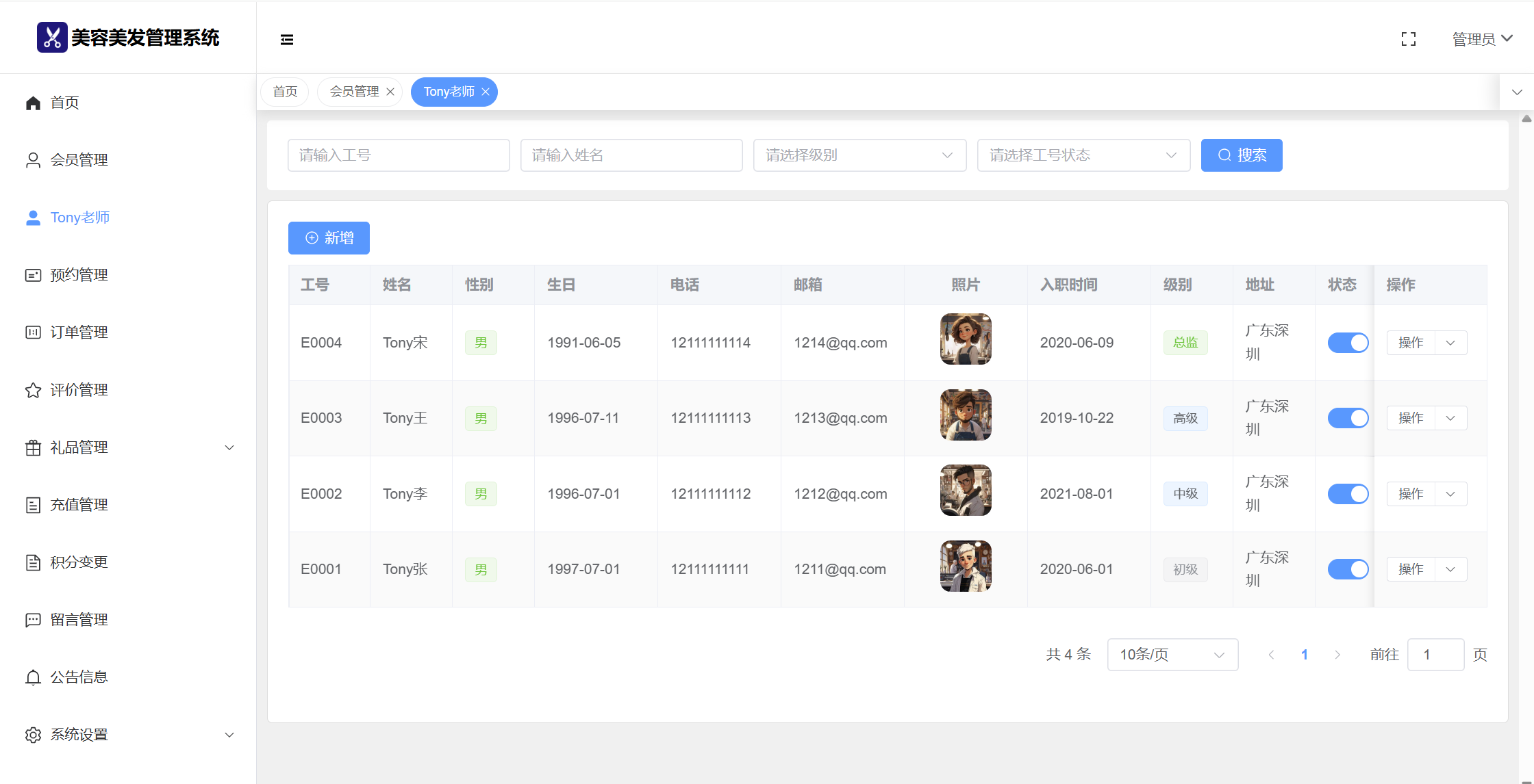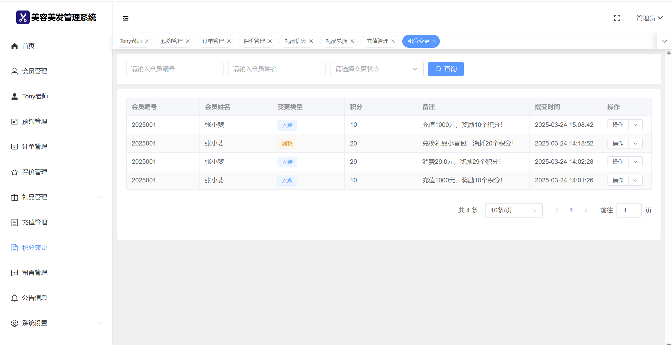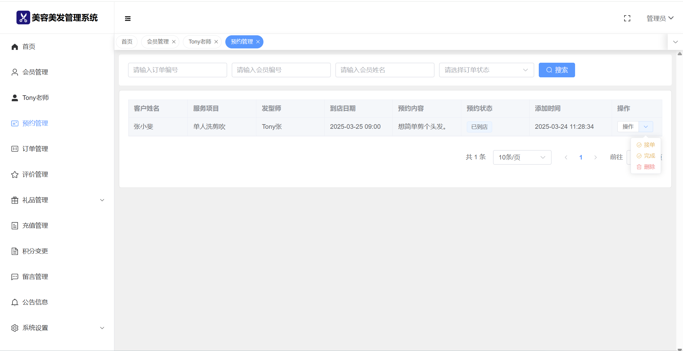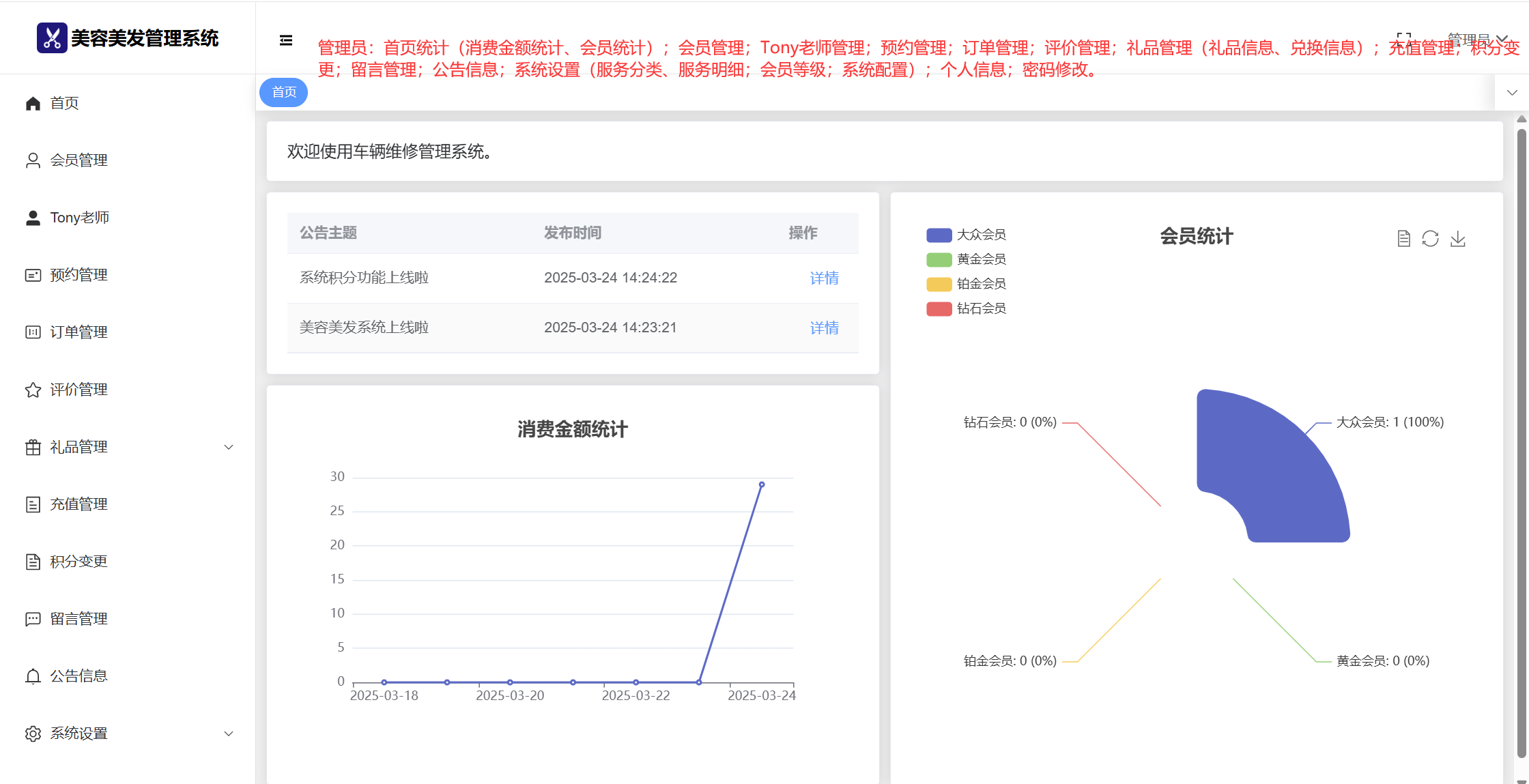 管理员:首页统计(消费金额统计、会员统计);会员管理;Tony老师管理;预约管理;订单管理;评价管理;礼品管理(礼品信息、兑换信息);充值管理;积分变更;留言管理;公告信息;系统设置(服务分类、服务明细;会员等级;系统配置);个人信息;密码修改。