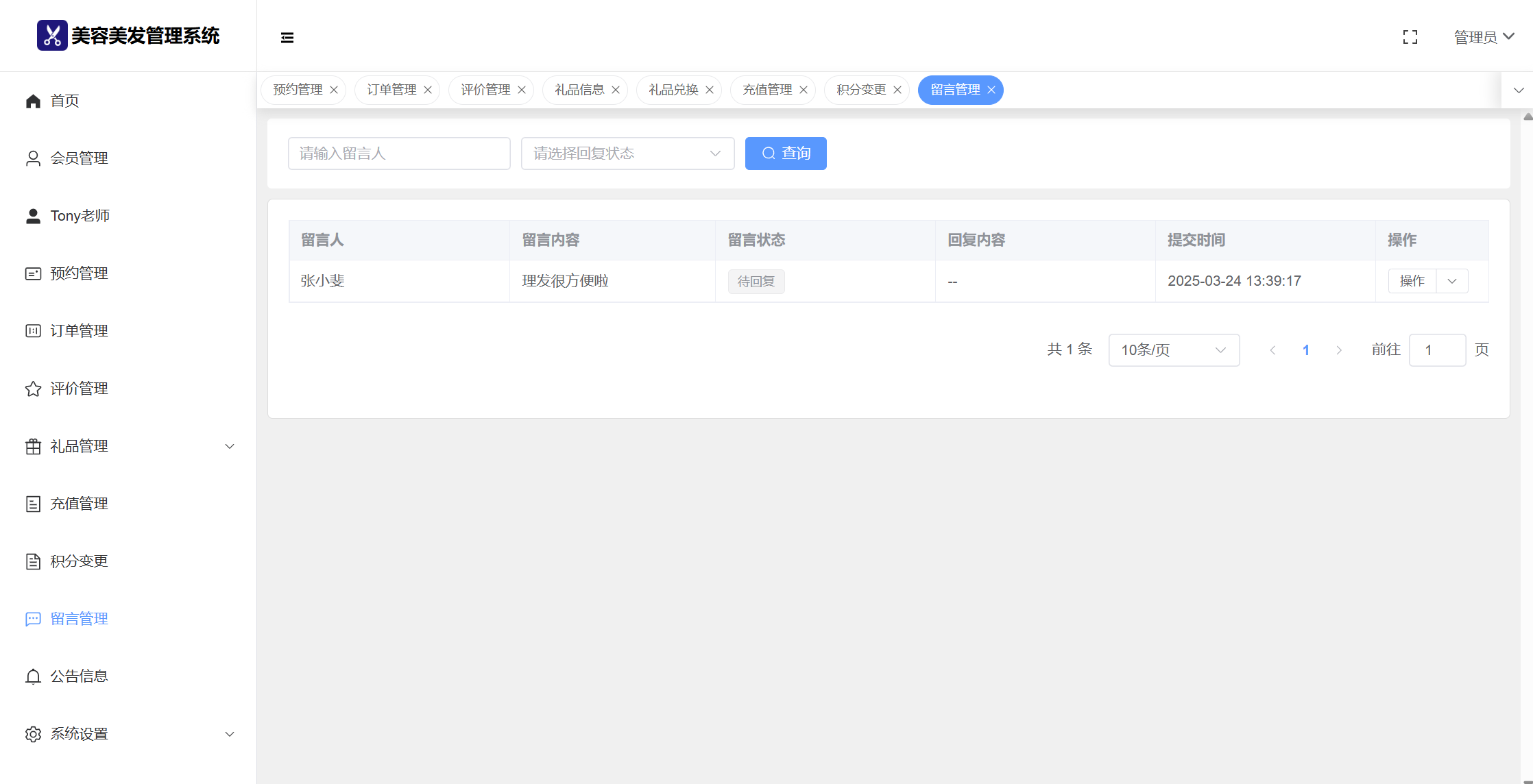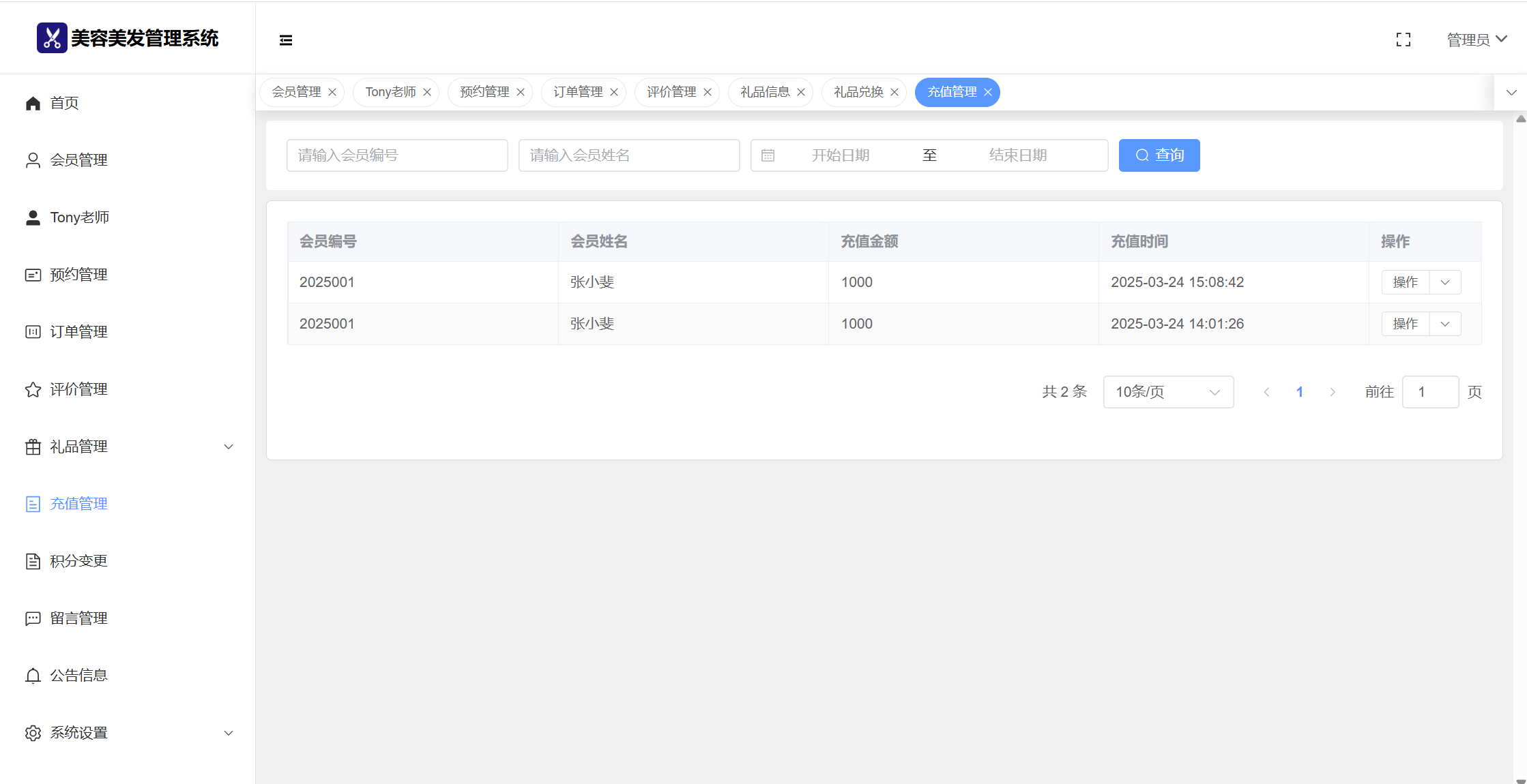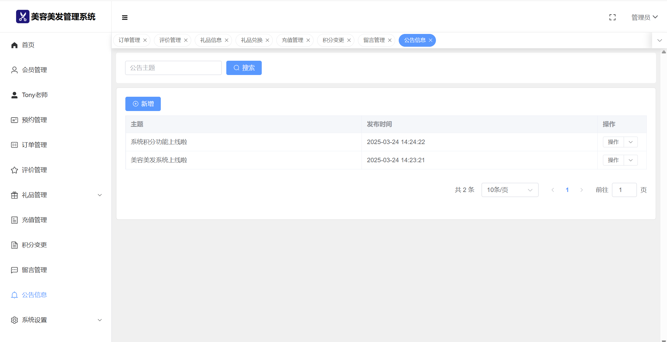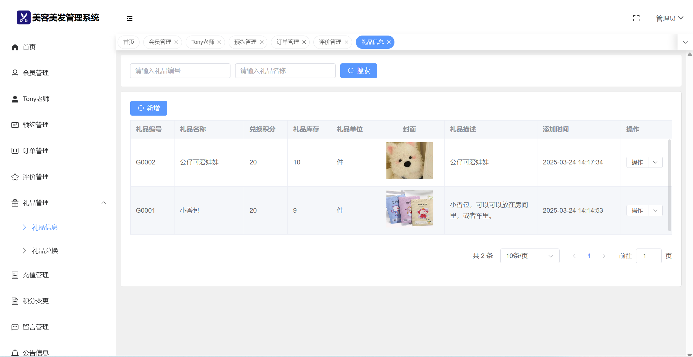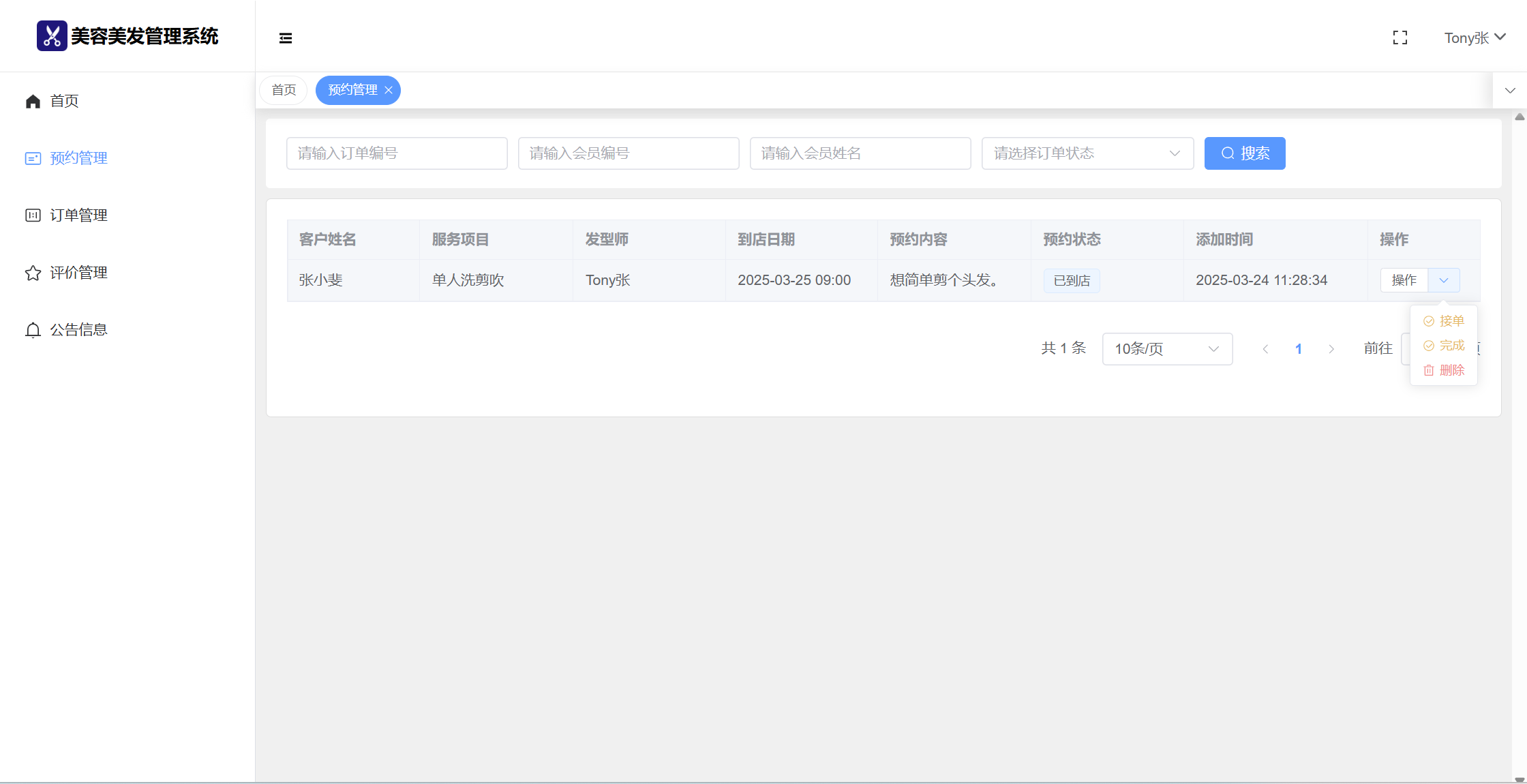 管理员:首页统计(消费金额统计、会员统计);会员管理;Tony老师管理;预约管理;订单管理;评价管理;礼品管理(礼品信息、兑换信息);充值管理;积分变更;留言管理;公告信息;系统设置(服务分类、服务明细;会员等级;系统配置);个人信息;密码修改。