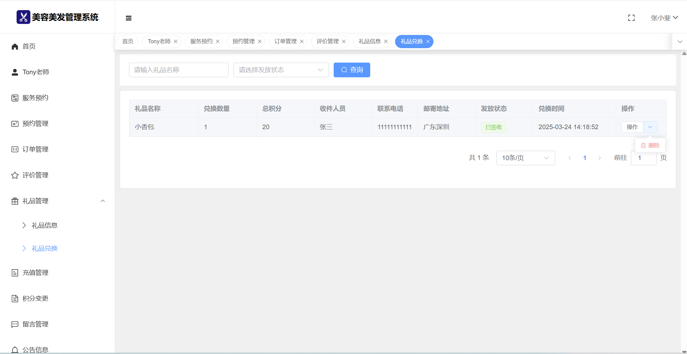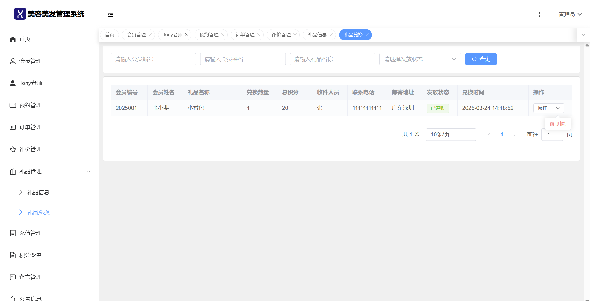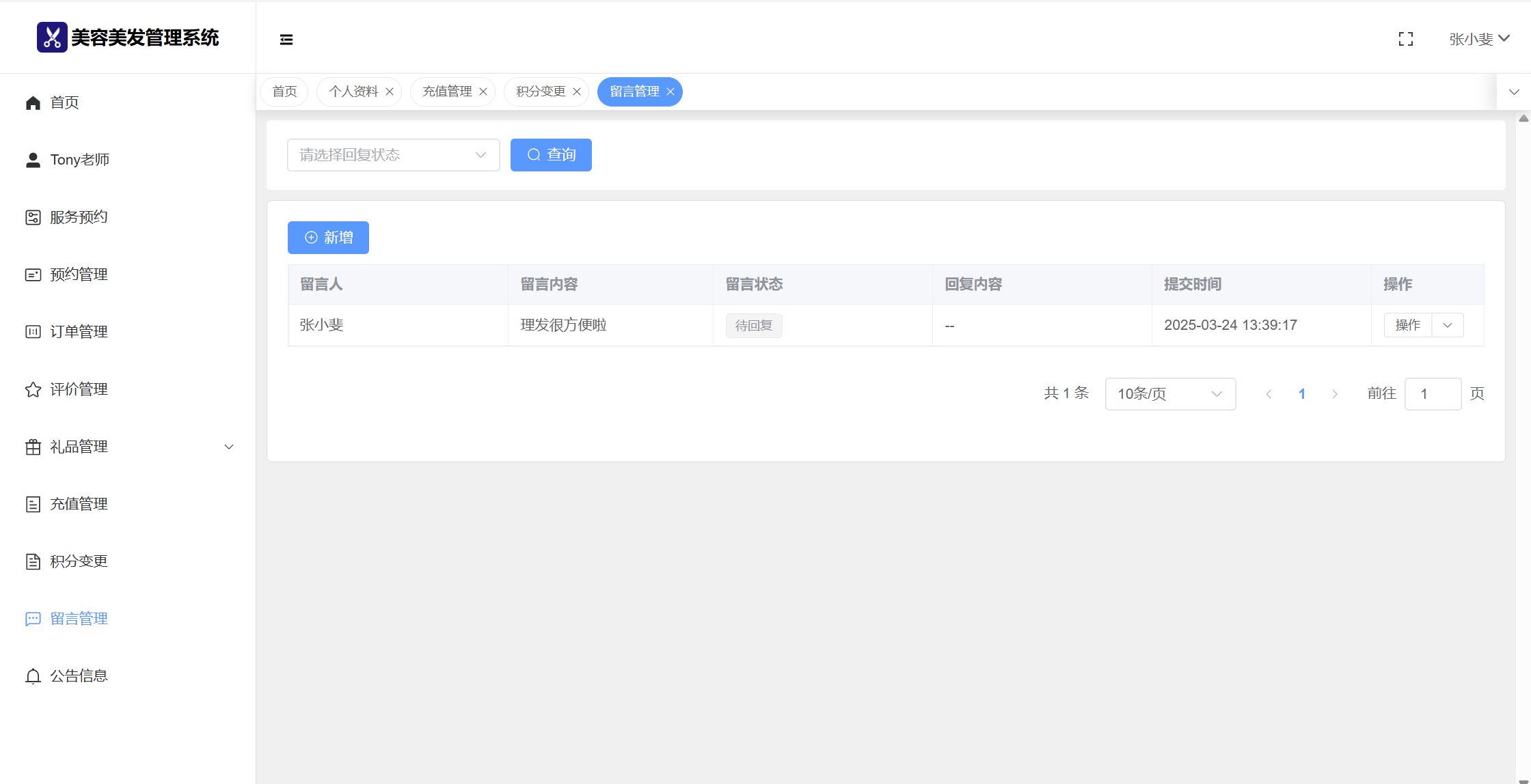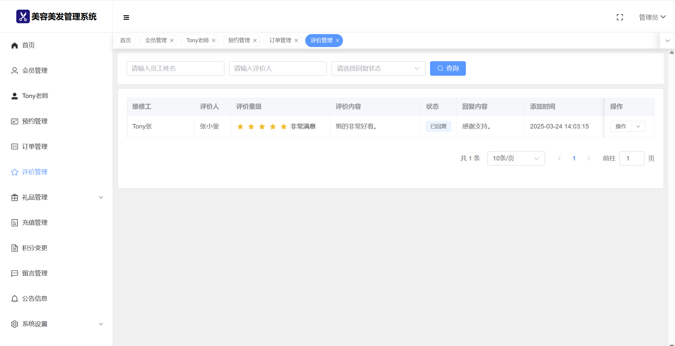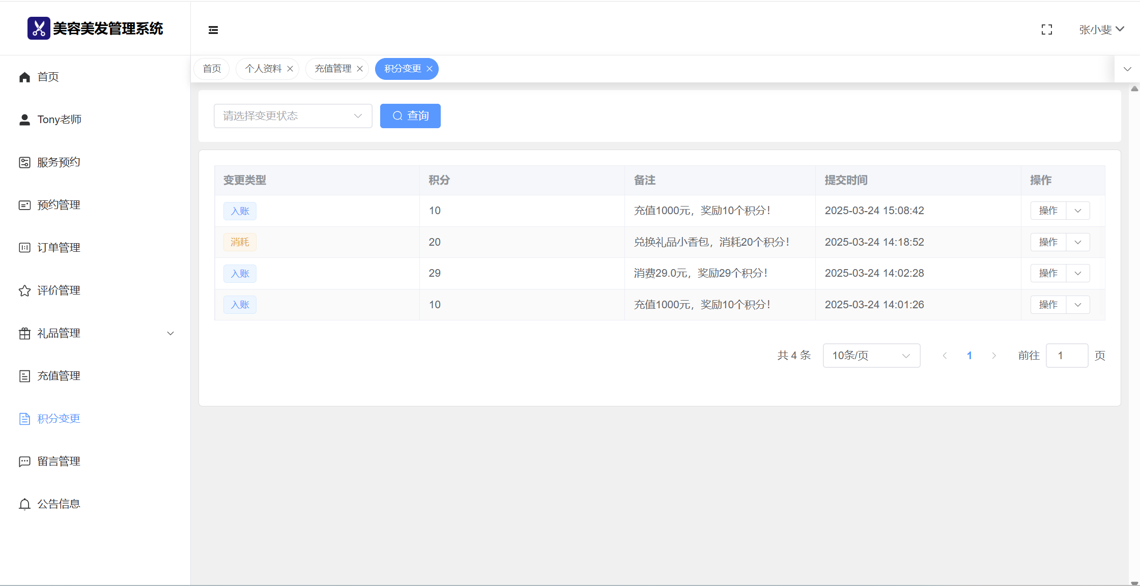 管理员:首页统计(消费金额统计、会员统计);会员管理;Tony老师管理;预约管理;订单管理;评价管理;礼品管理(礼品信息、兑换信息);充值管理;积分变更;留言管理;公告信息;系统设置(服务分类、服务明细;会员等级;系统配置);个人信息;密码修改。