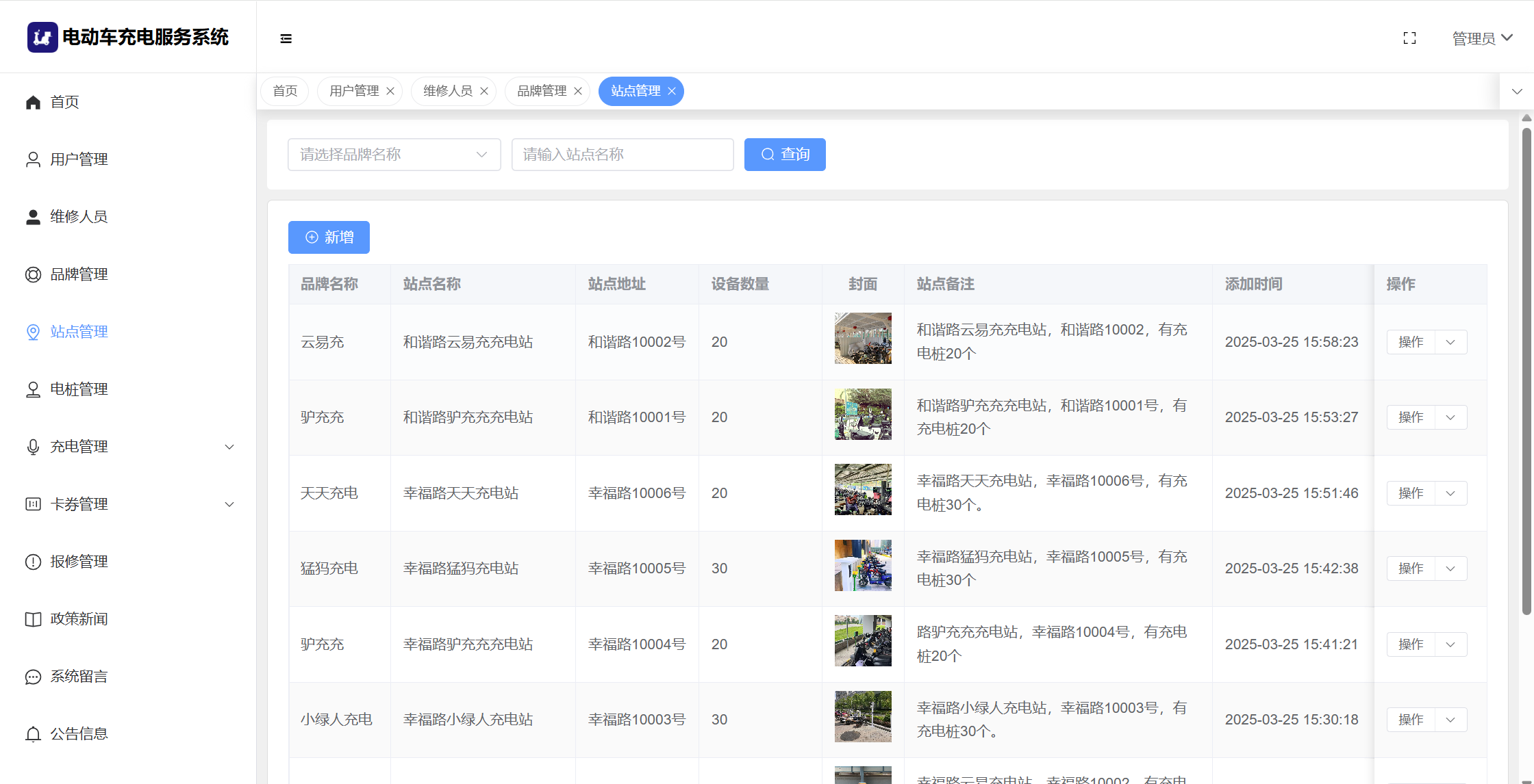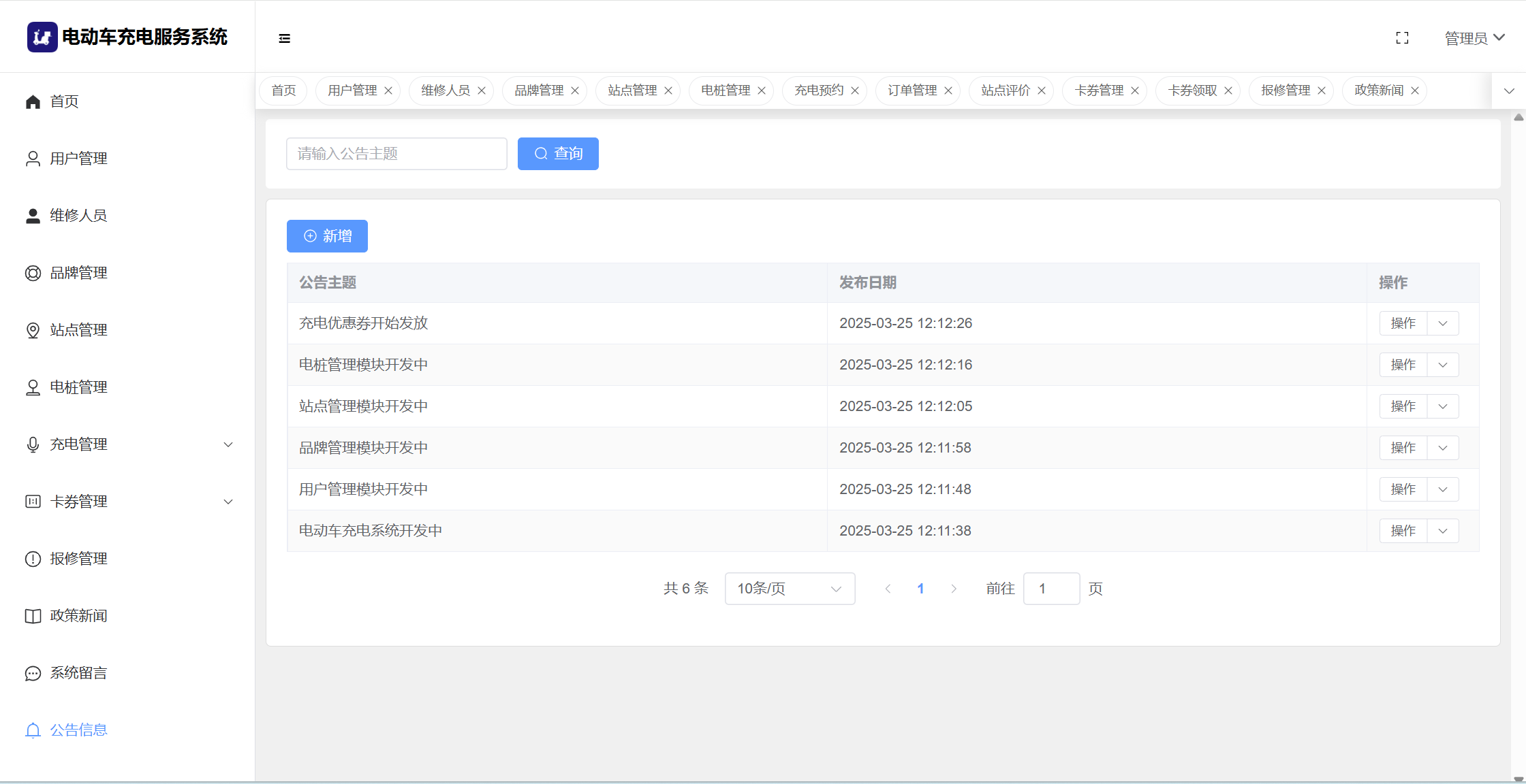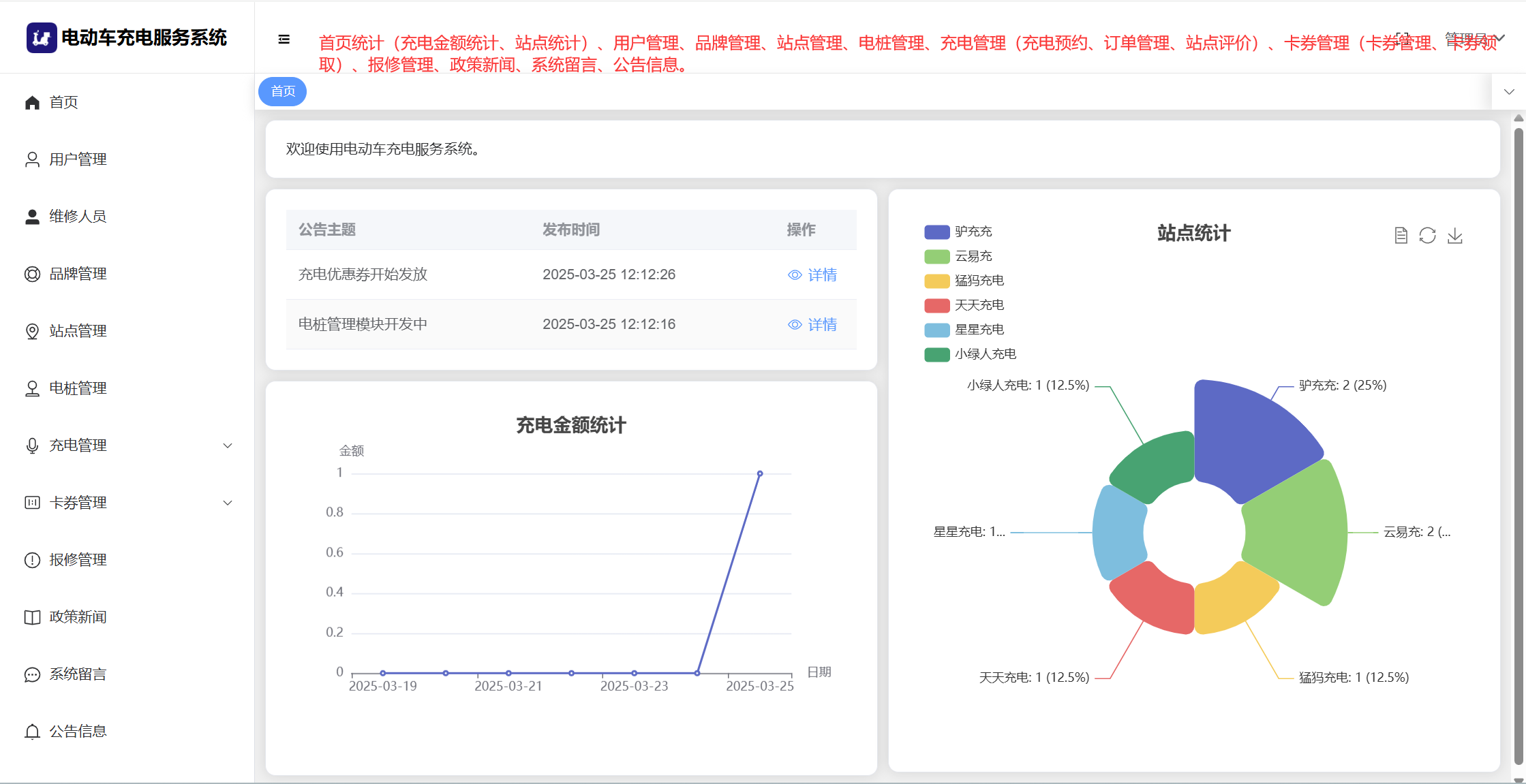 管理员:首页统计(充电金额统计、站点统计)、用户管理、品牌管理、站点管理、电桩管理、充电管理(充电预约、订单管理、站点评价)、卡券管理(卡券管理、卡券领取)、报修管理、政策新闻、系统留言、公告信息。
