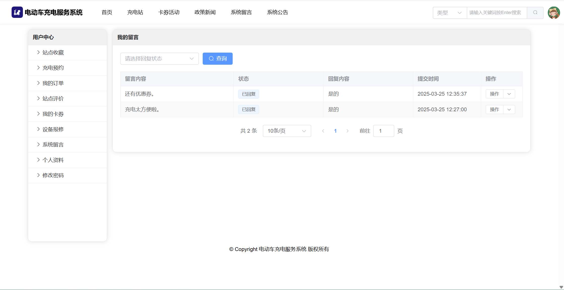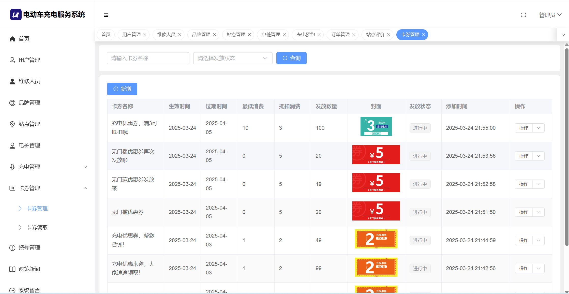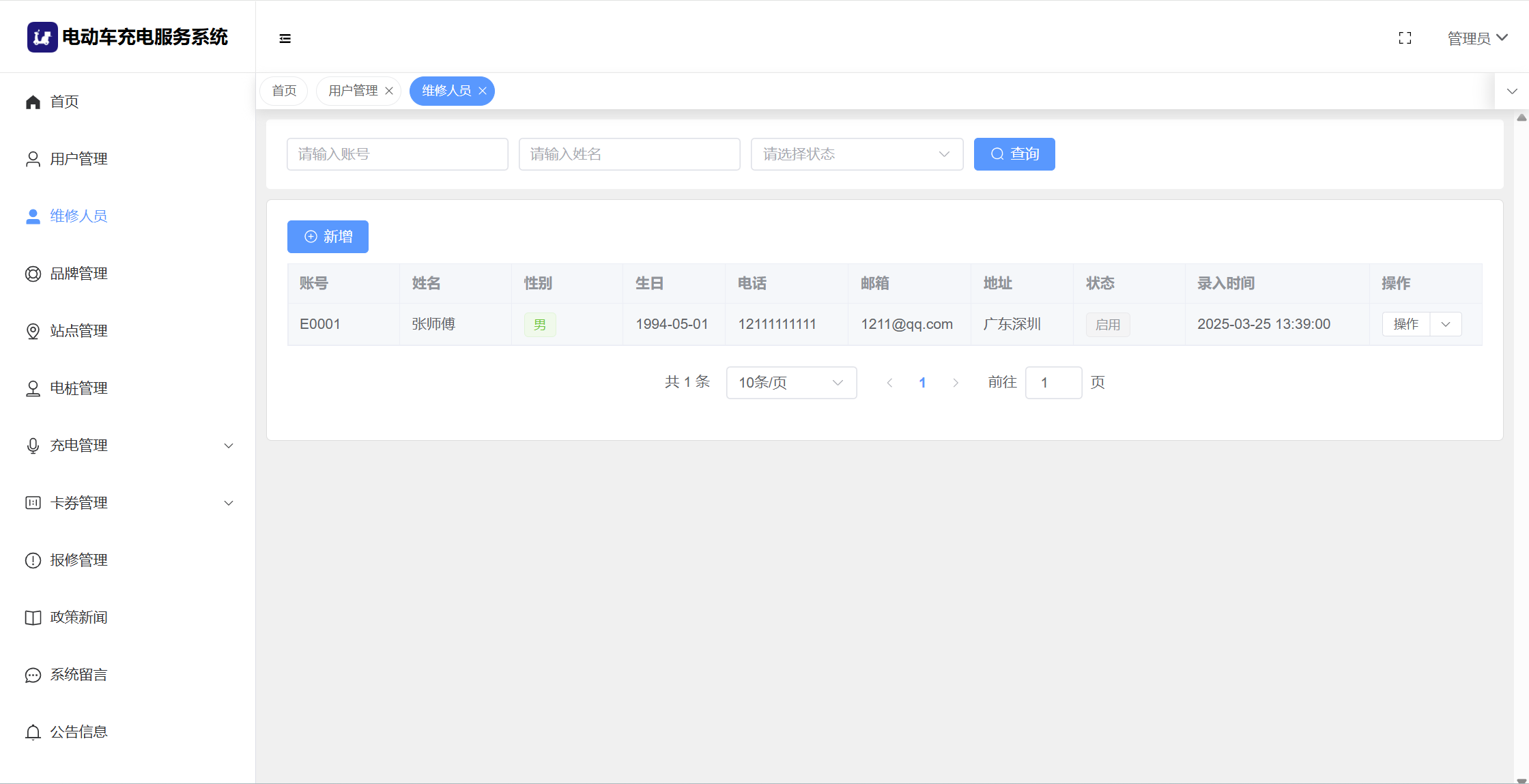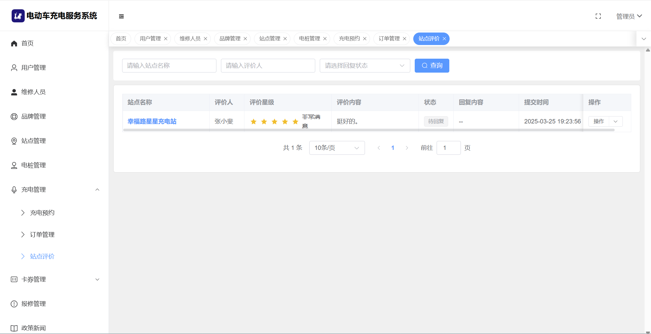 管理员:首页统计(充电金额统计、站点统计)、用户管理、品牌管理、站点管理、电桩管理、充电管理(充电预约、订单管理、站点评价)、卡券管理(卡券管理、卡券领取)、报修管理、政策新闻、系统留言、公告信息。