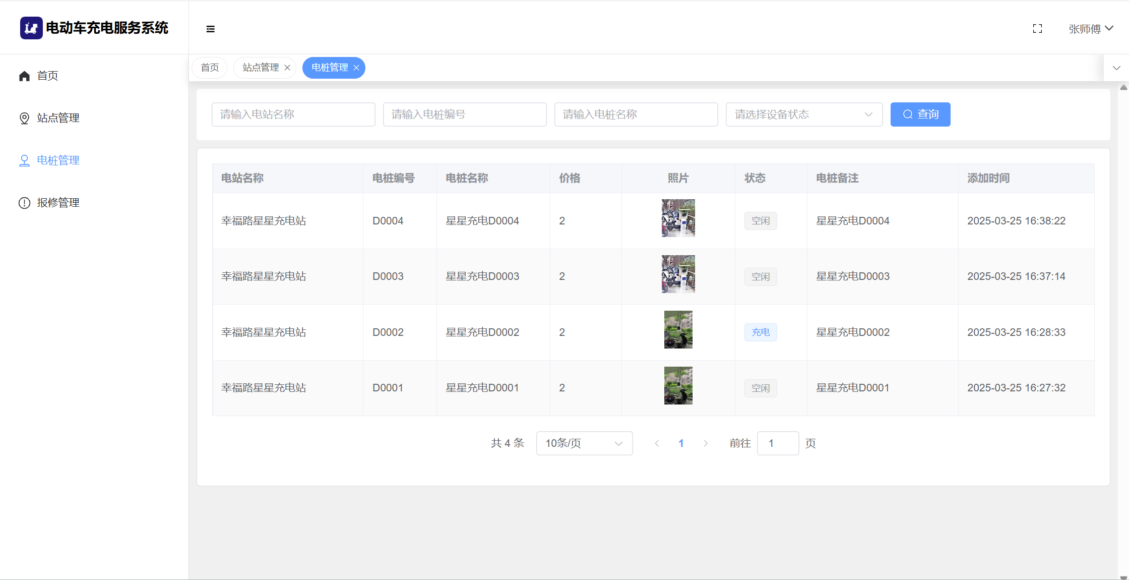 维修员:站点查看;电桩查看;报修管理(处理结束);个人信息修改;密码修改。