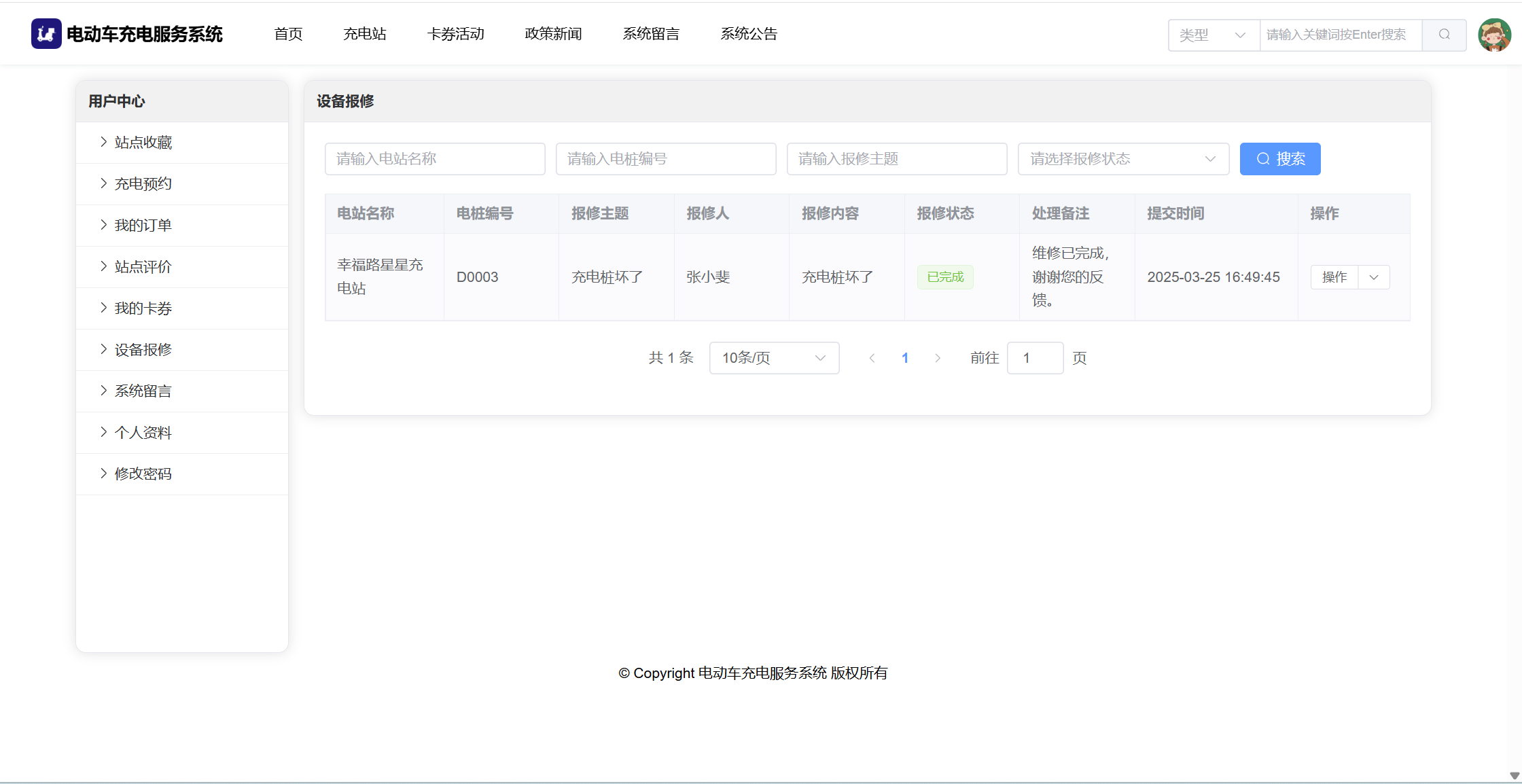 基于SpringBoot3+Vue3前后端分离的电动车充电服务网站,系统包含管理员、维修员、用户角色,功能如下: