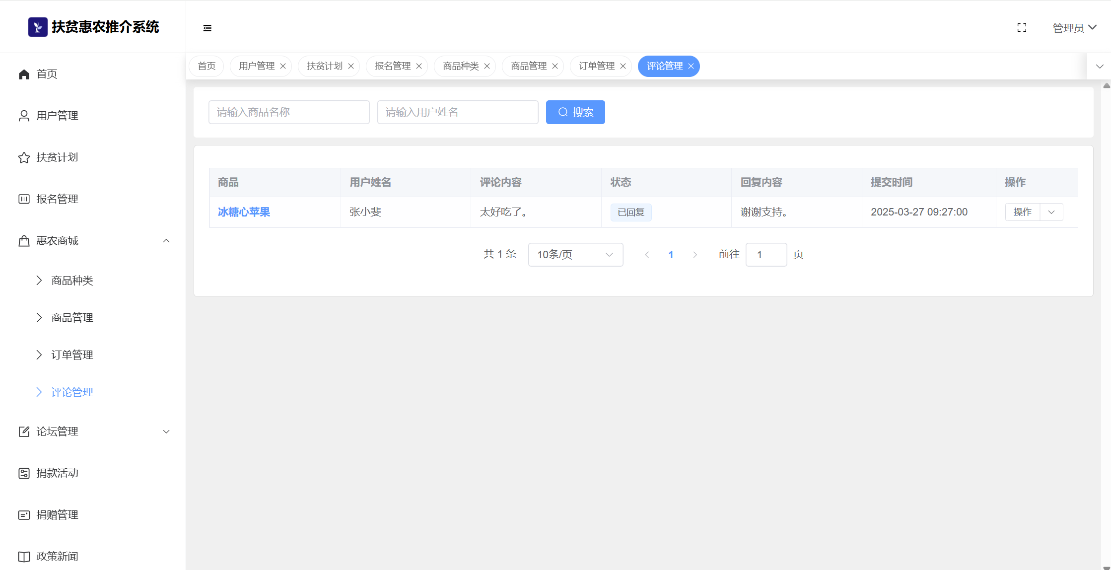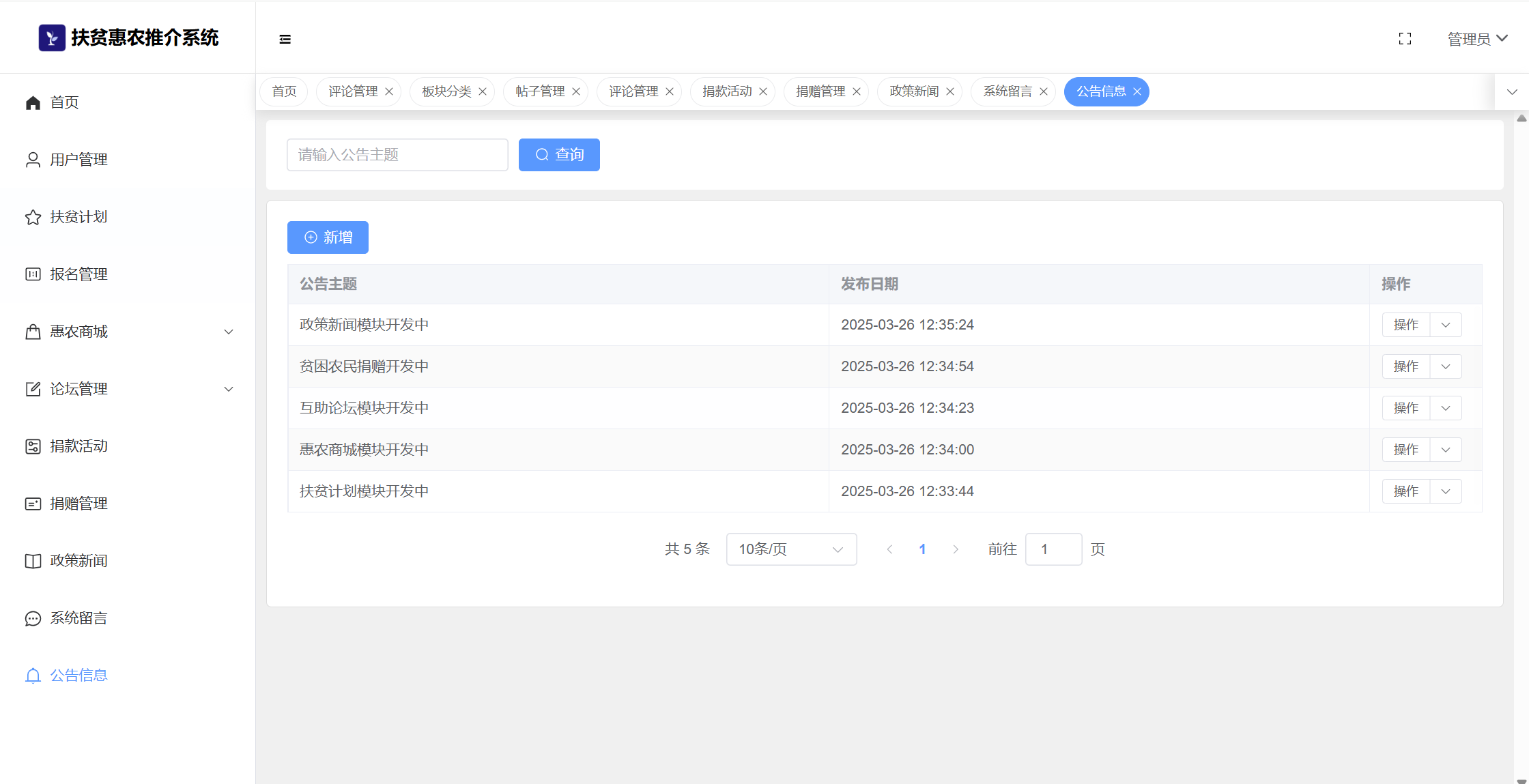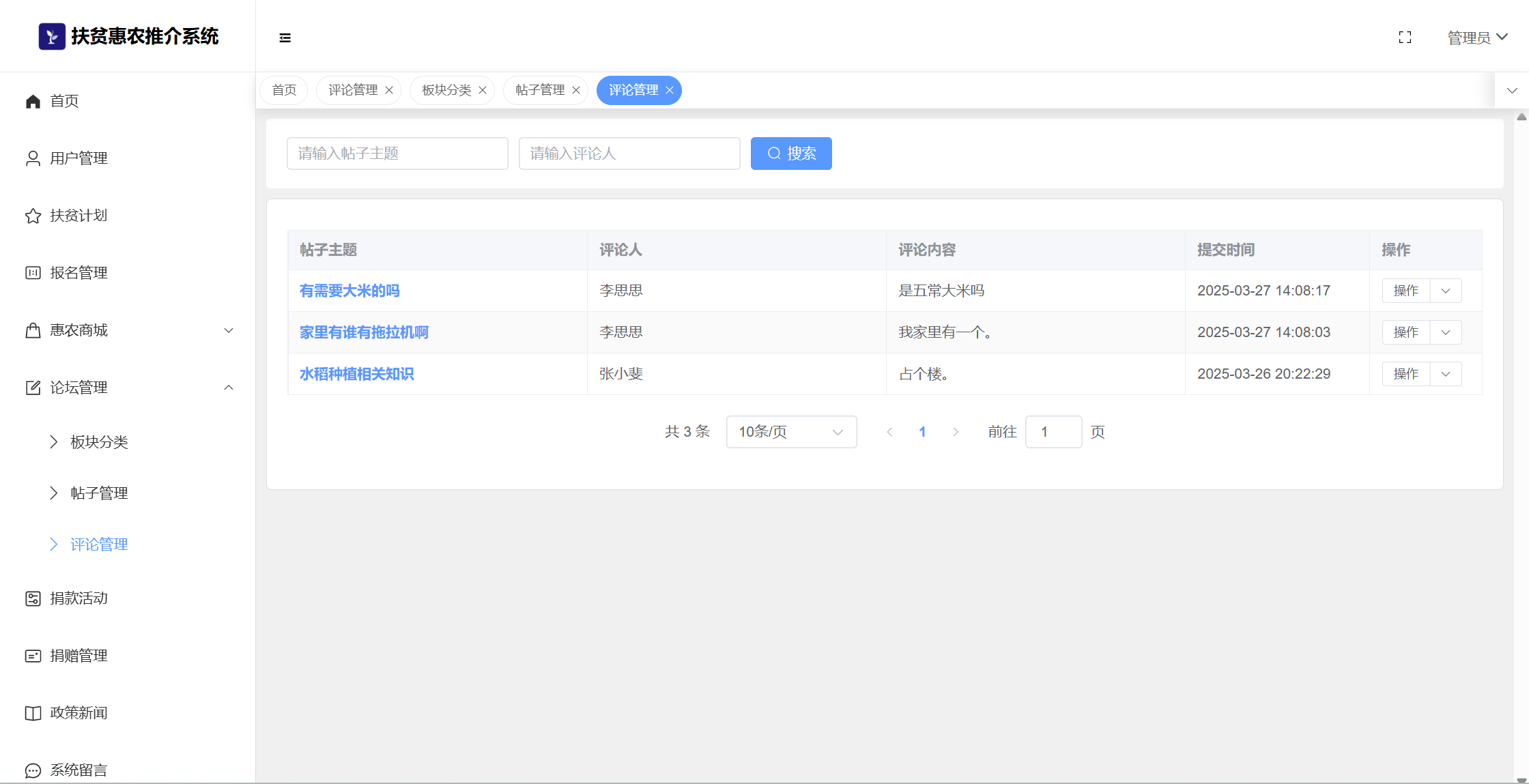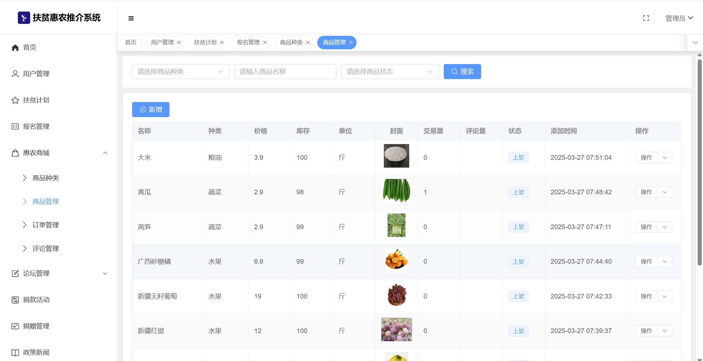 基于SpringBoot3+Vue3前后端分离的扶贫惠农推介系统,系统包含管理员、用户角色,功能如下: