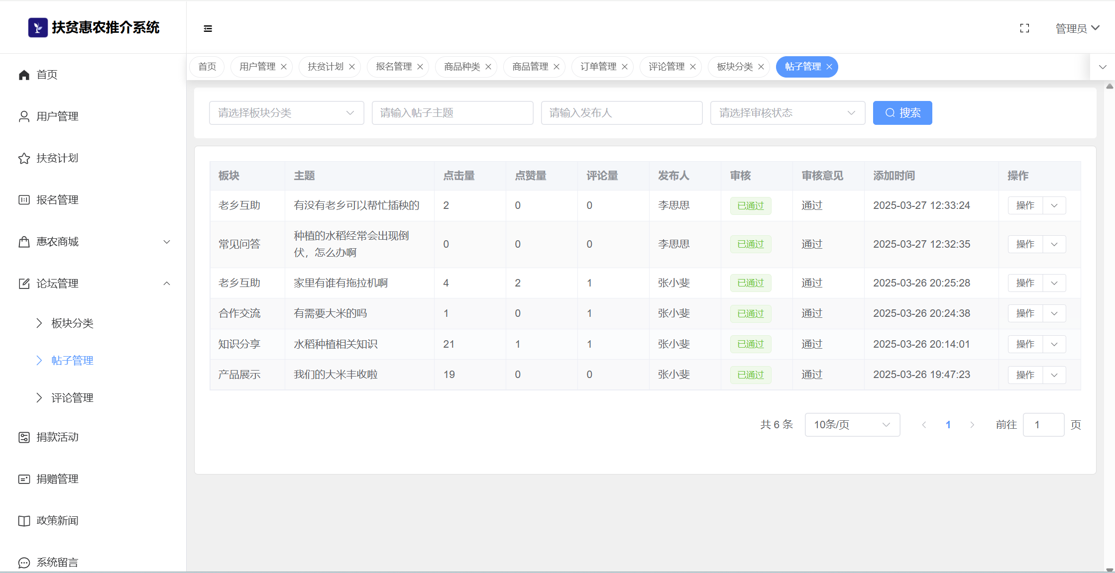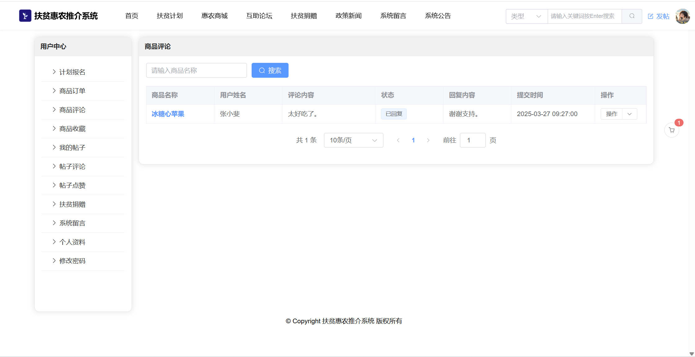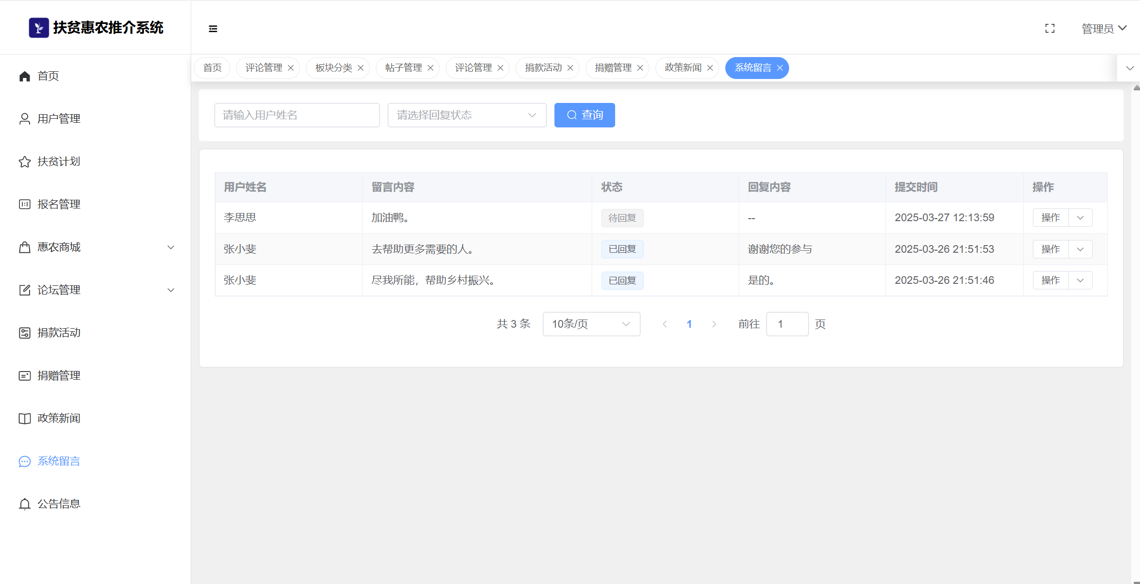基于SpringBoot3+Vue3前后端分离的扶贫惠农推介系统,系统包含管理员、用户角色,功能如下: