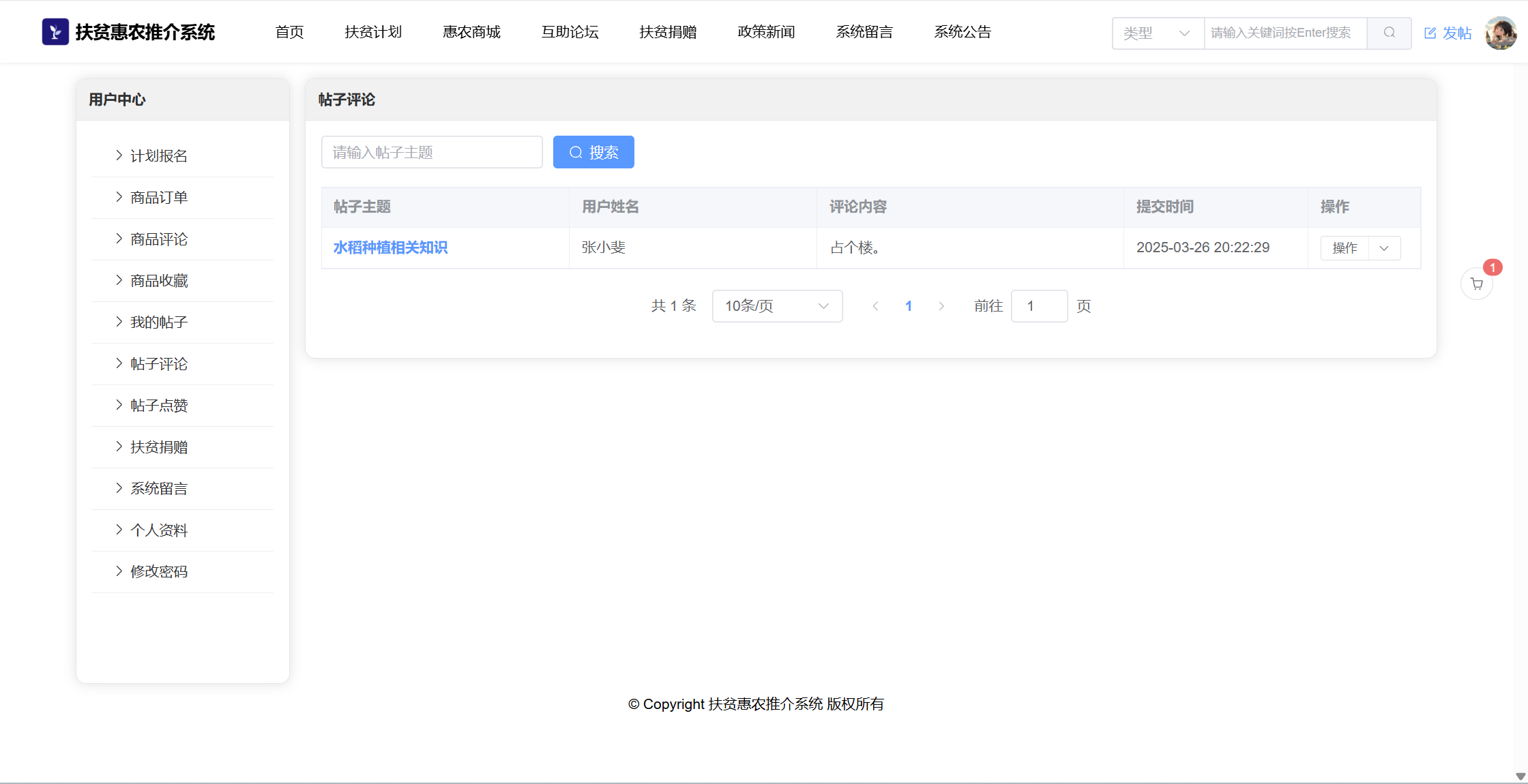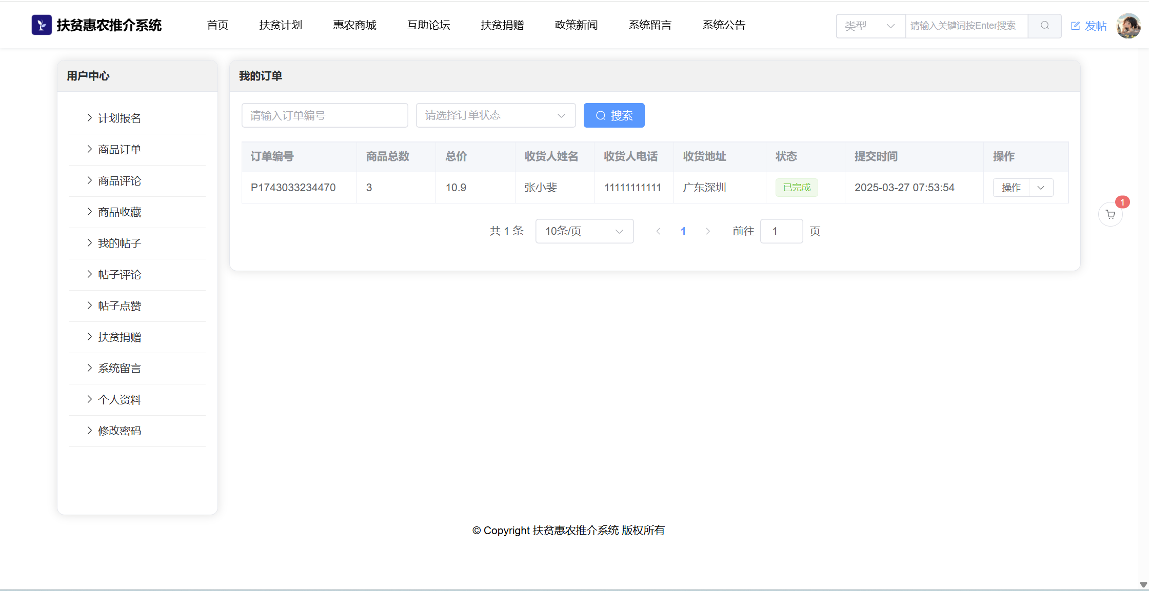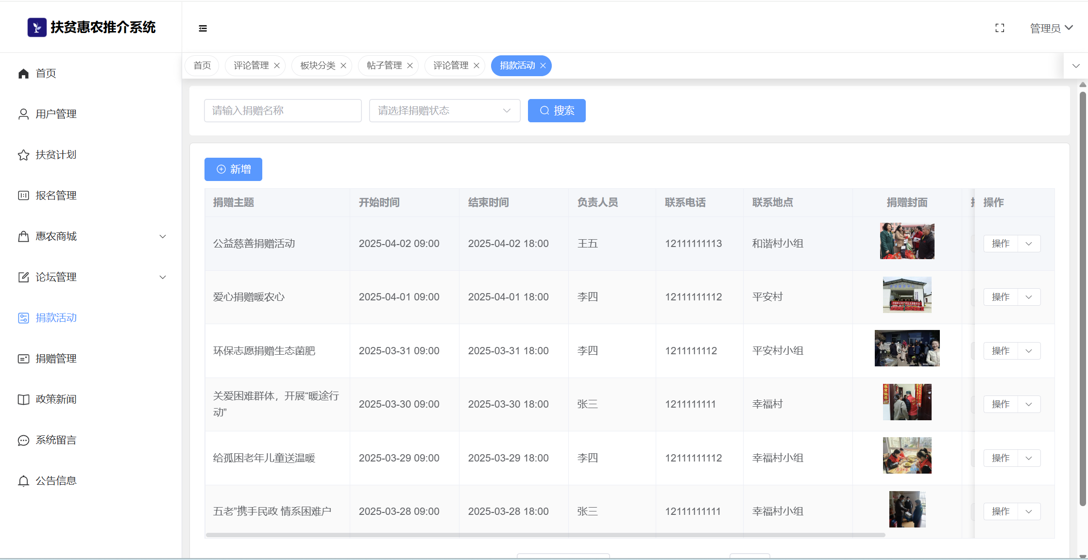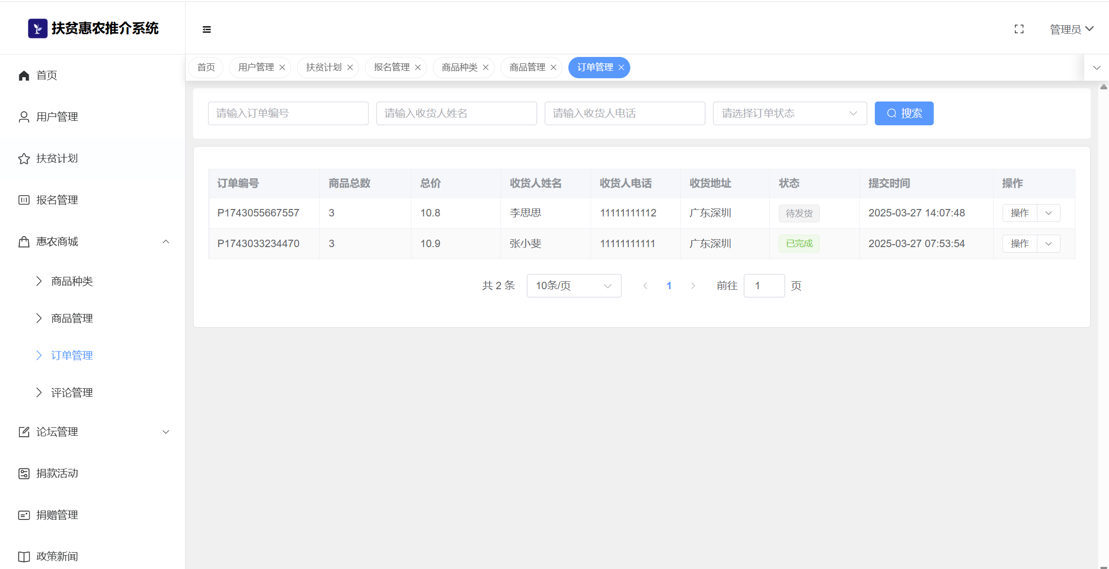 基于SpringBoot3+Vue3前后端分离的扶贫惠农推介系统,系统包含管理员、用户角色,功能如下:
