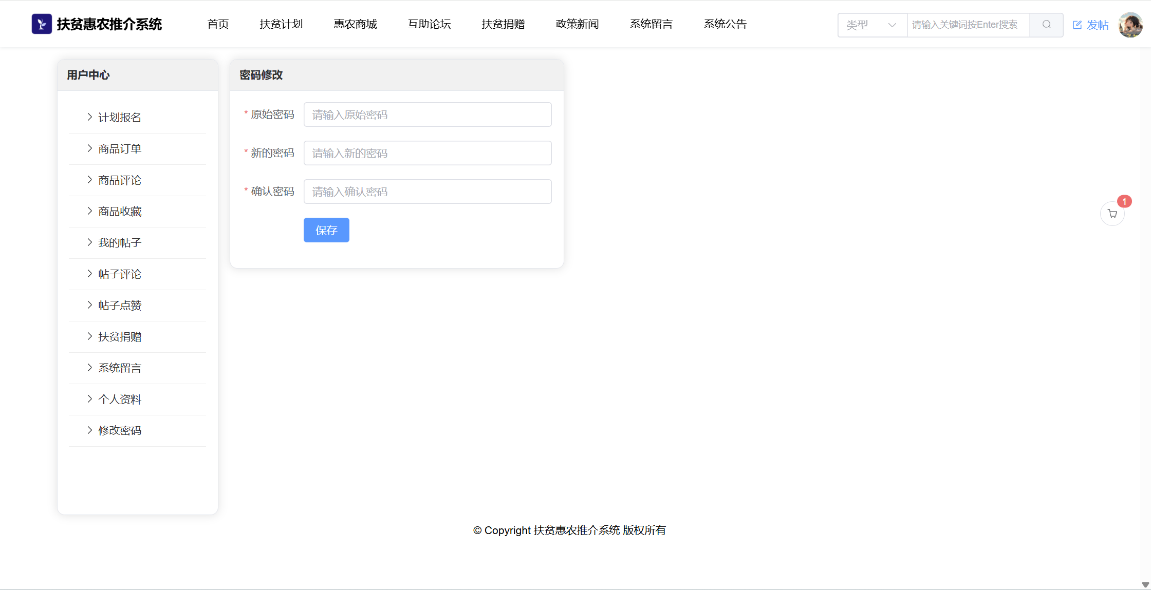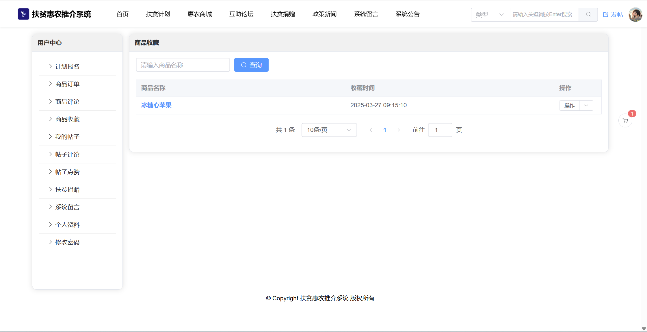 用户:注册;登录;首页;扶贫计划(计划详情、报名、报名名单);惠农商城(分类、商品列表、商品详情、购物车、收藏、下单、评论);互助论坛(版块、帖子列表、帖子详情、点赞、评论);扶贫捐赠(详情、捐赠、捐赠名单);政策新闻;系统留言、个人信息、修改密码。用户还具有个人中心,功能包括:计划报名、商品订单、商品评论、商品收藏、我的帖子、帖子评论、帖子点赞、扶贫捐赠、系统留言、个人资料、修改密码。