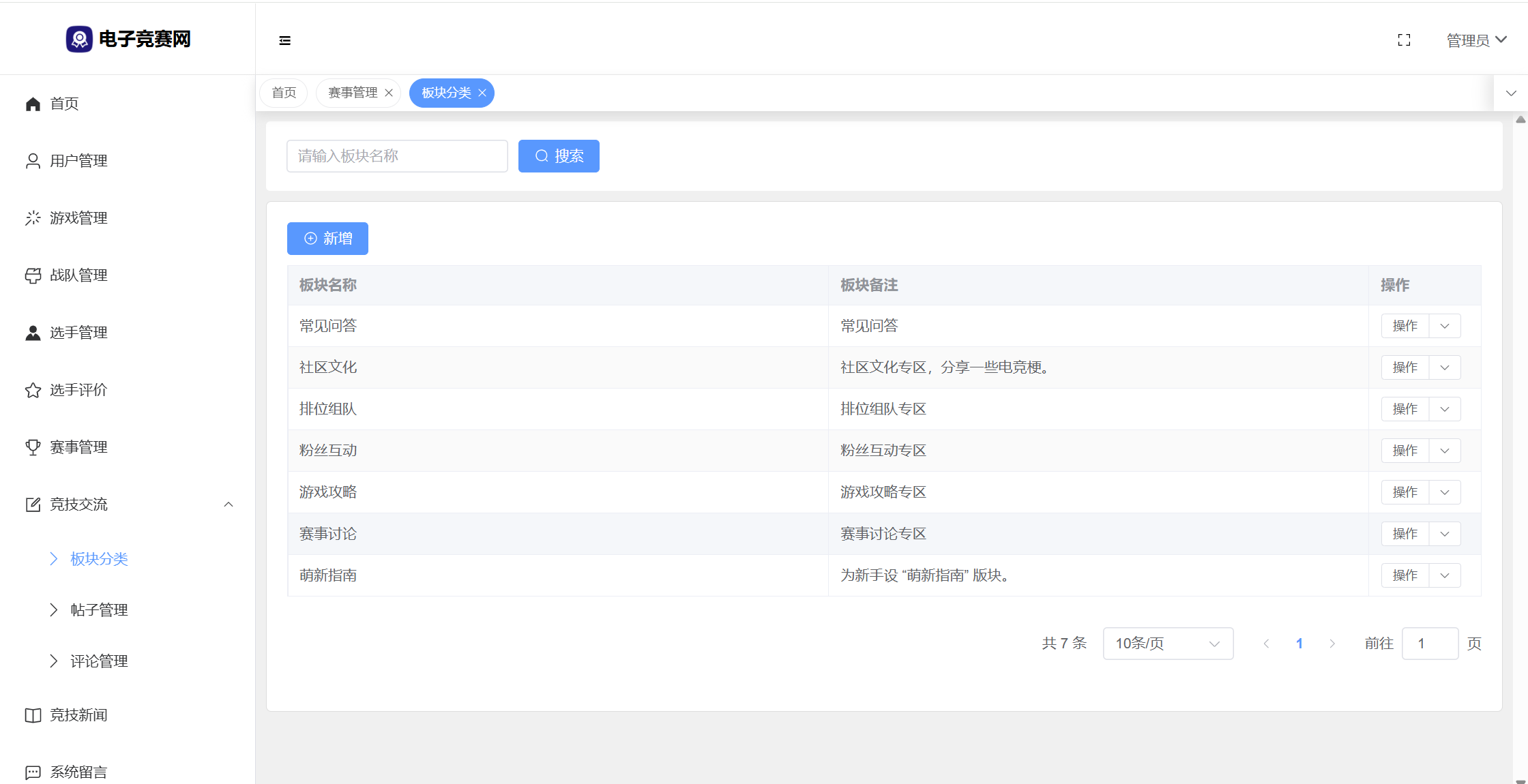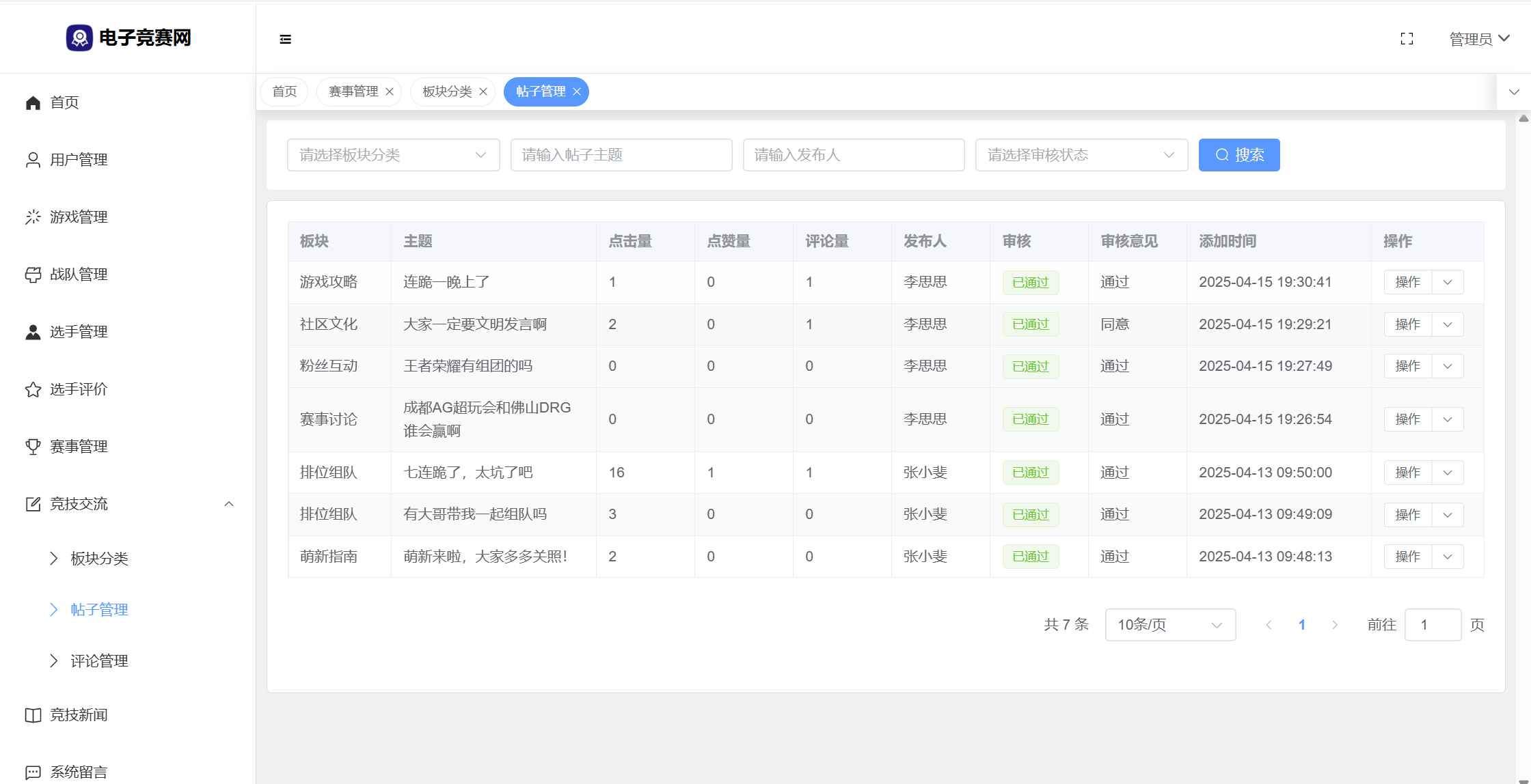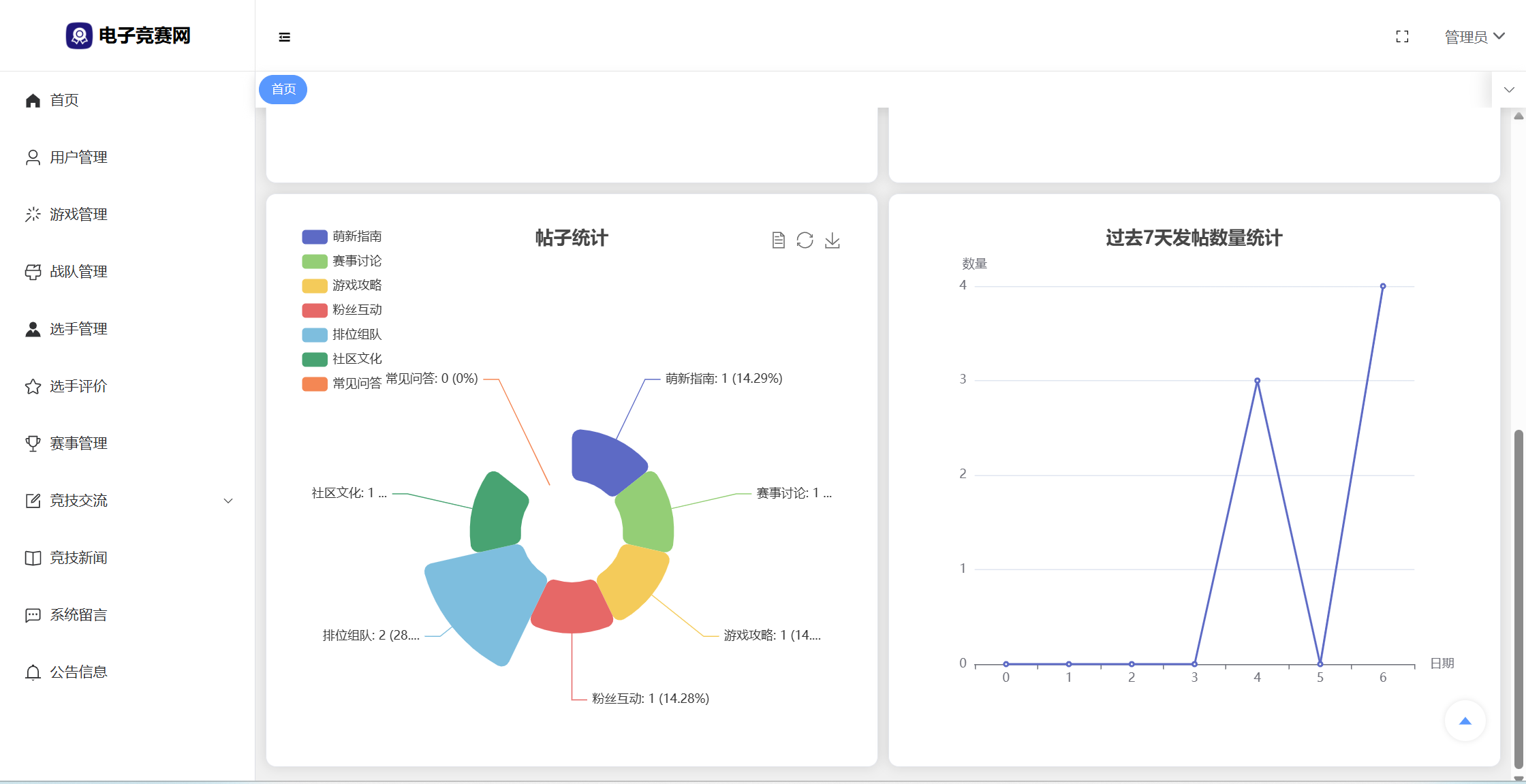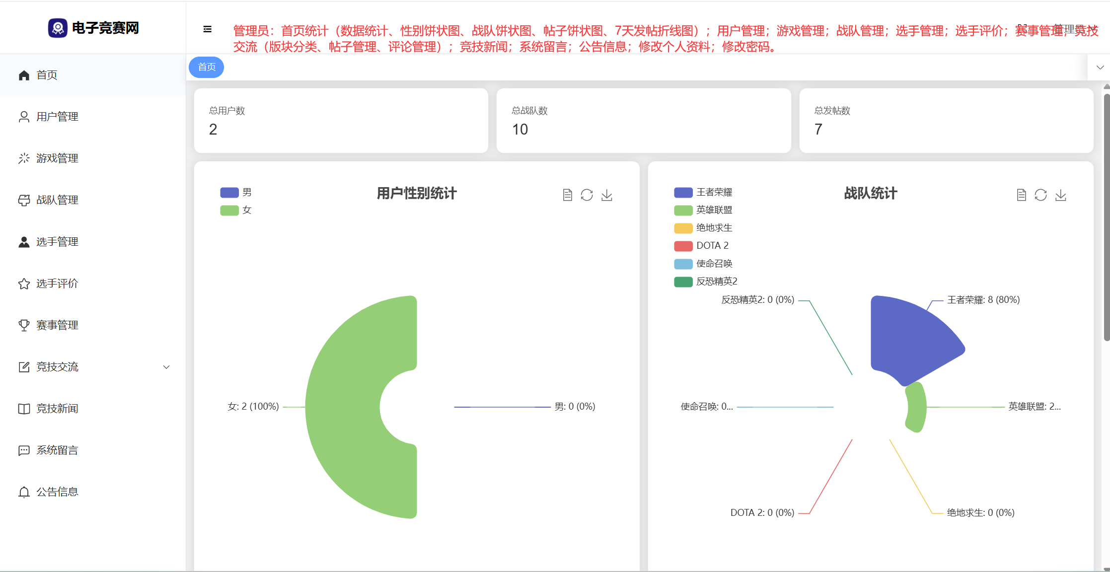 管理员:首页统计(数据统计、性别饼状图、战队饼状图、帖子饼状图、7天发帖折线图);用户管理;游戏管理;战队管理;选手管理;选手评价;赛事管理;竞技交流(版块分类、帖子管理、评论管理);竞技新闻;系统留言;公告信息;修改个人资料;修改密码。