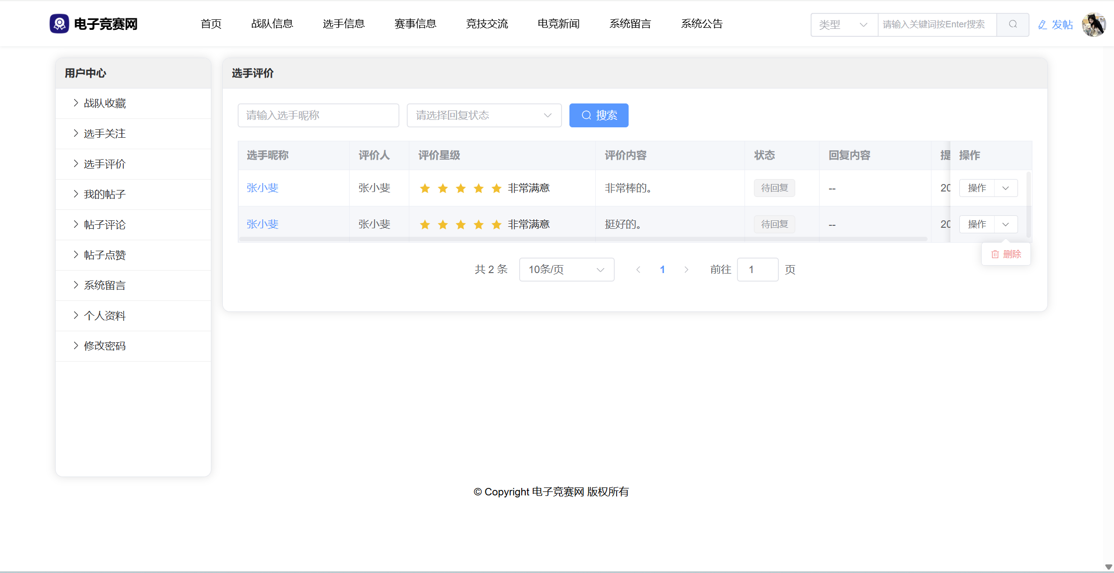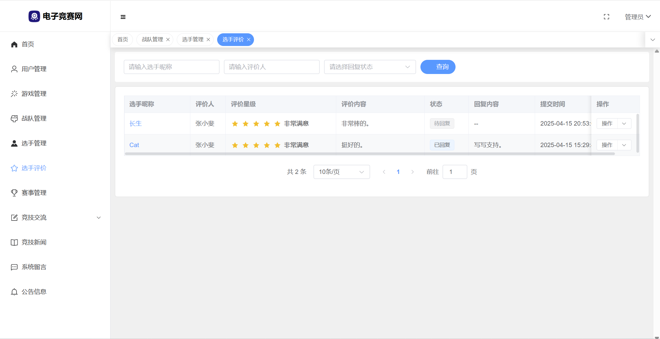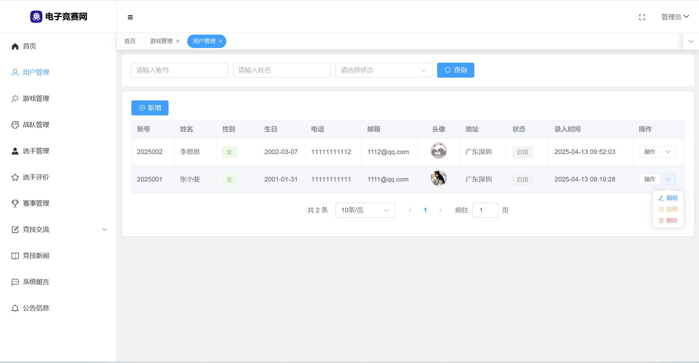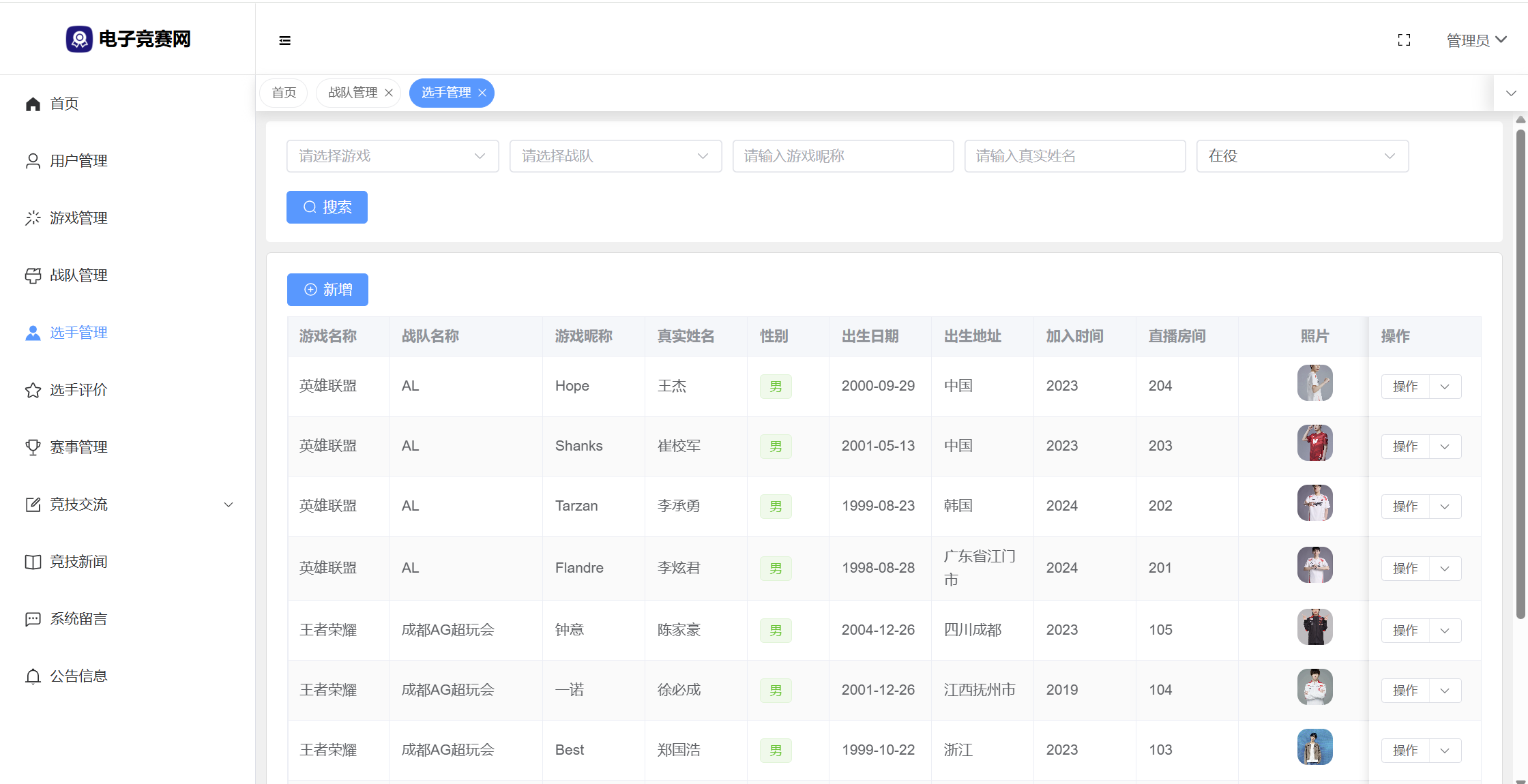 管理员:首页统计(数据统计、性别饼状图、战队饼状图、帖子饼状图、7天发帖折线图);用户管理;游戏管理;战队管理;选手管理;选手评价;赛事管理;竞技交流(版块分类、帖子管理、评论管理);竞技新闻;系统留言;公告信息;修改个人资料;修改密码。