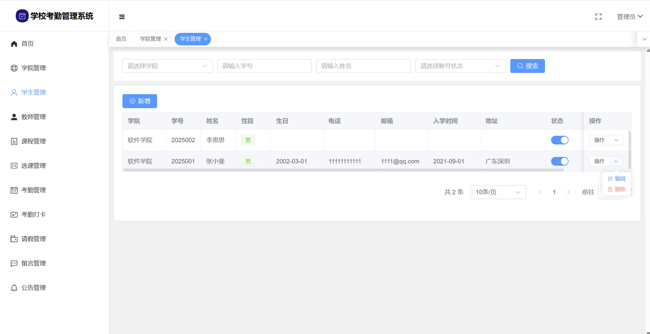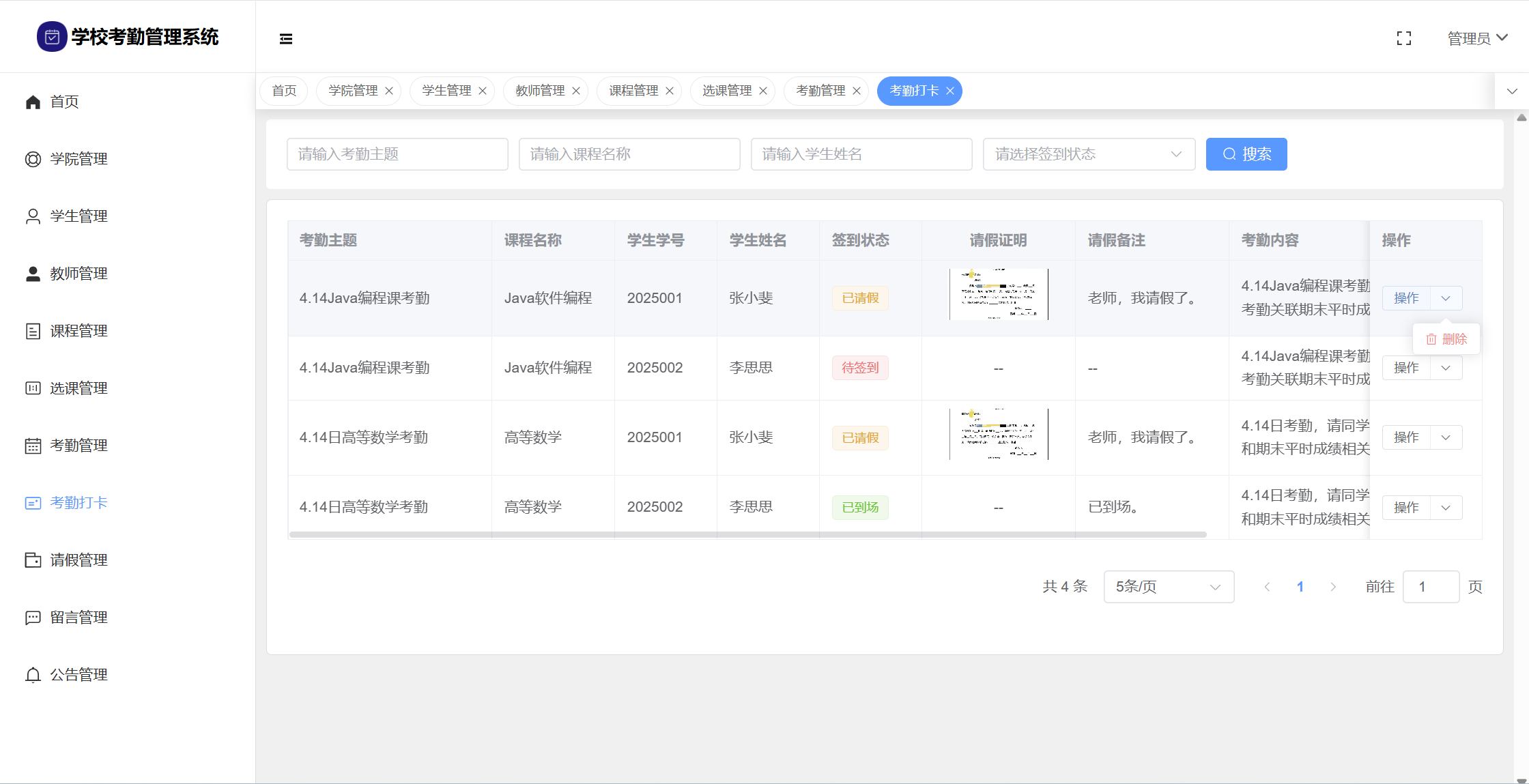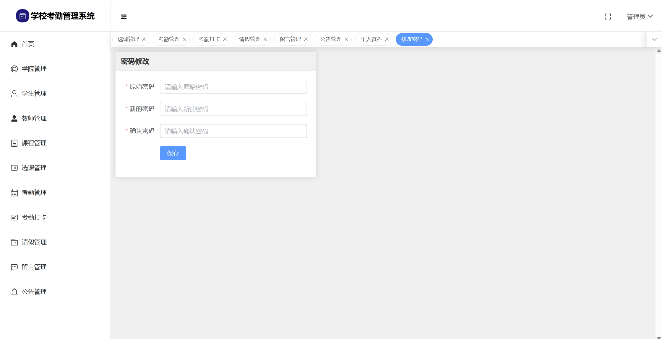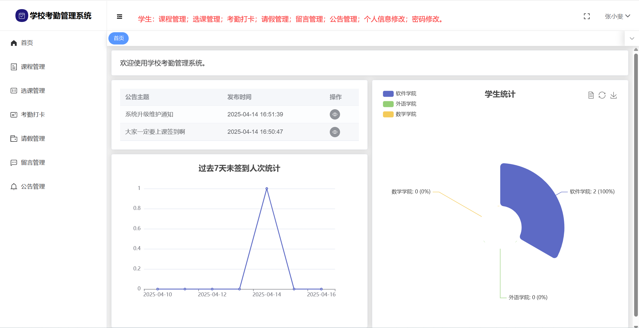 管理员:首页统计(过去7天未签到人数、学生统计);学院管理;学生管理;教师管理;课程管理;选课管理;考勤管理;考勤打卡;请假管理;留言管理;公告管理;修改个人资料;修改密码。