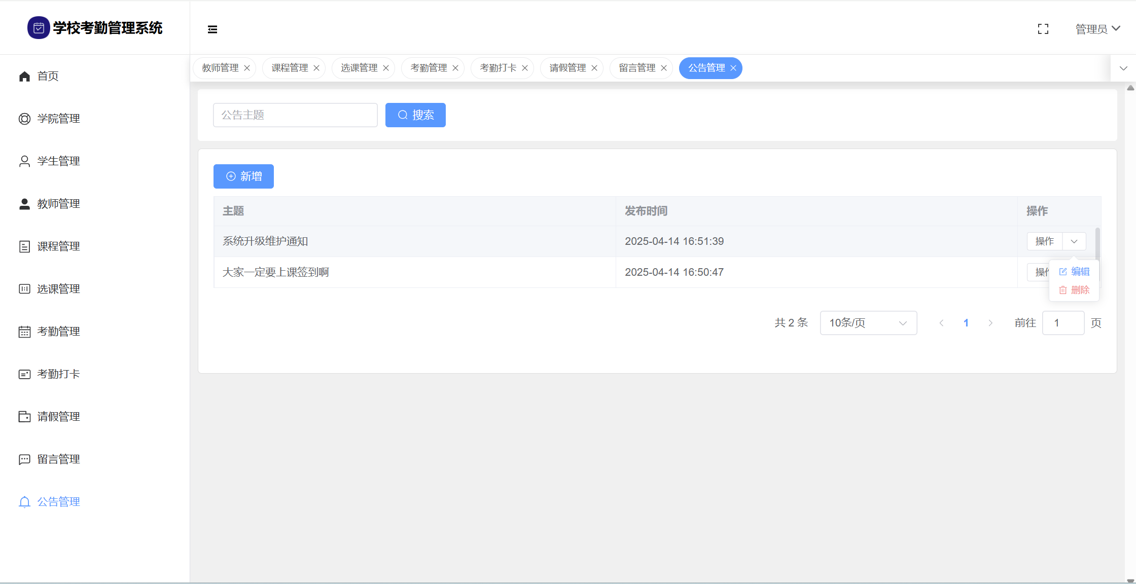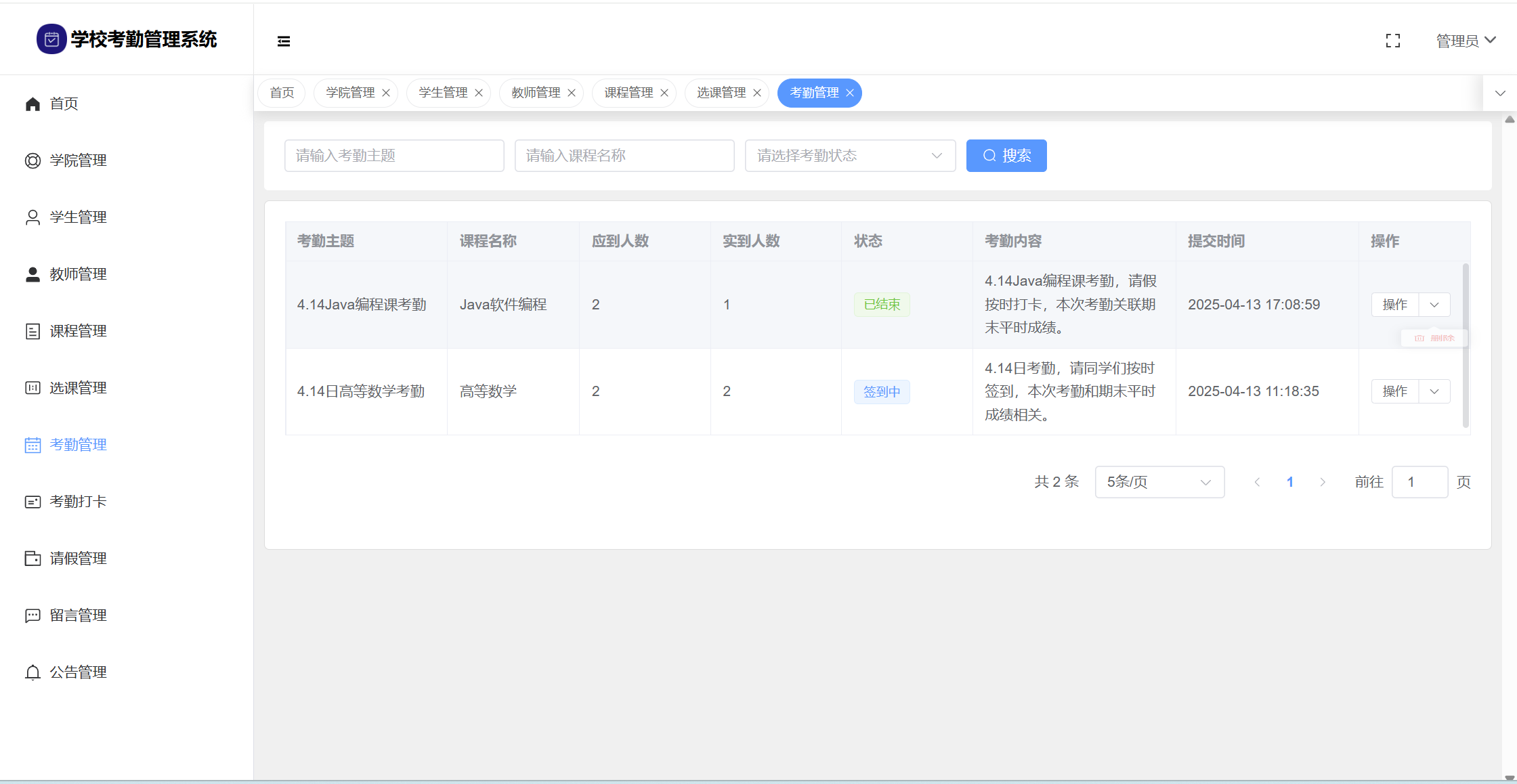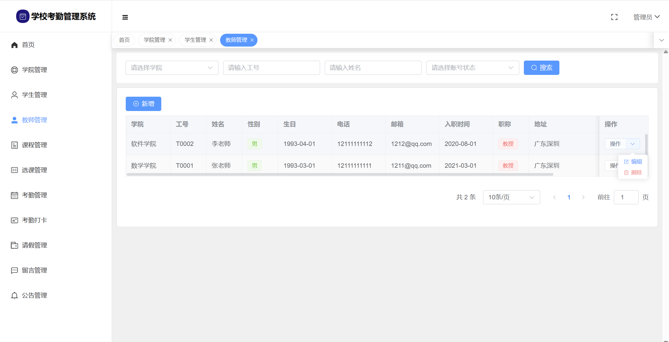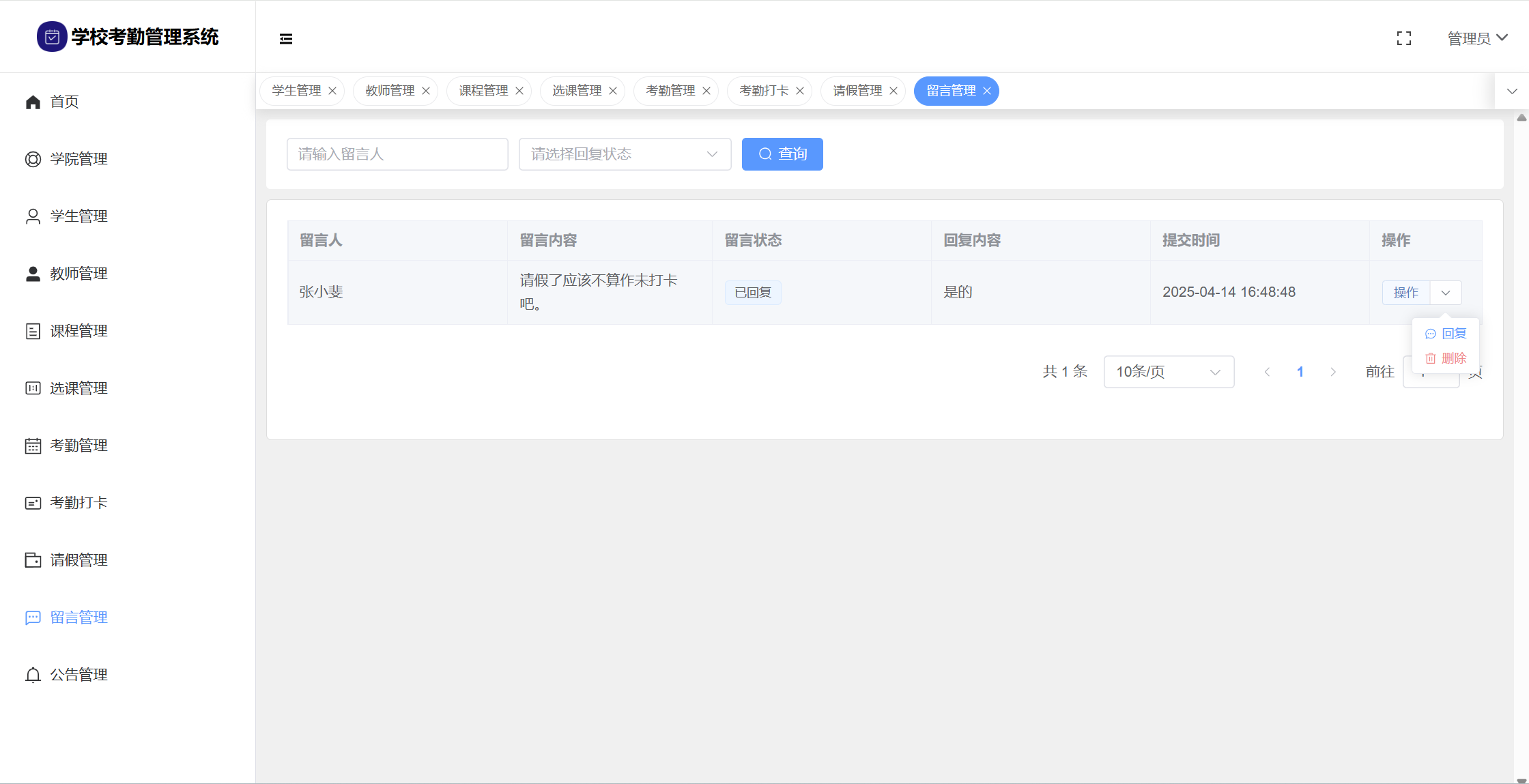 管理员:首页统计(过去7天未签到人数、学生统计);学院管理;学生管理;教师管理;课程管理;选课管理;考勤管理;考勤打卡;请假管理;留言管理;公告管理;修改个人资料;修改密码。