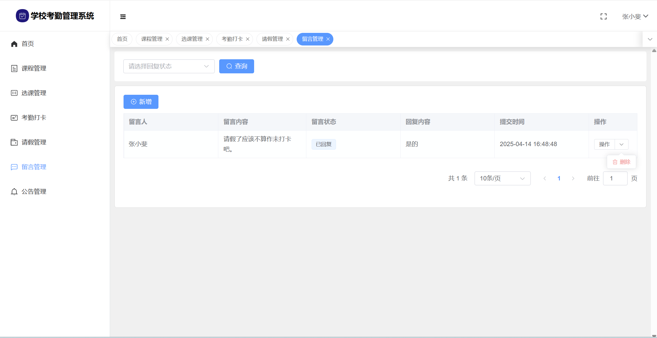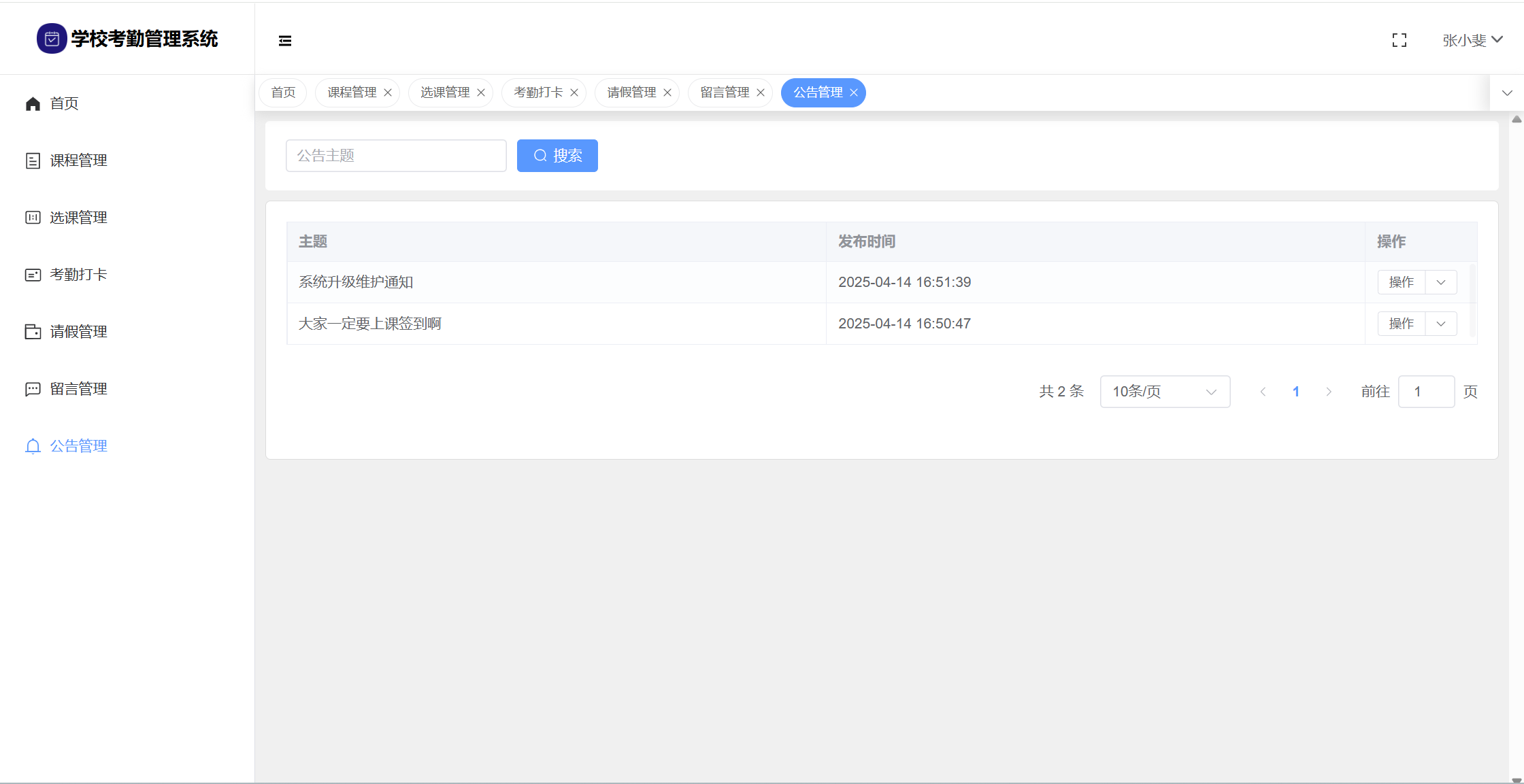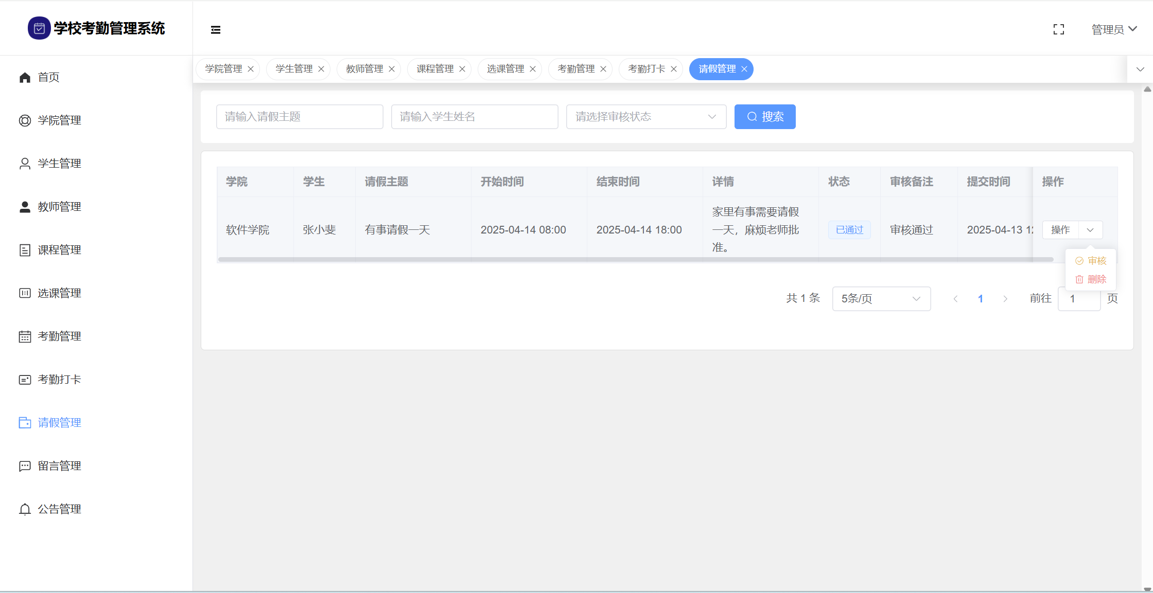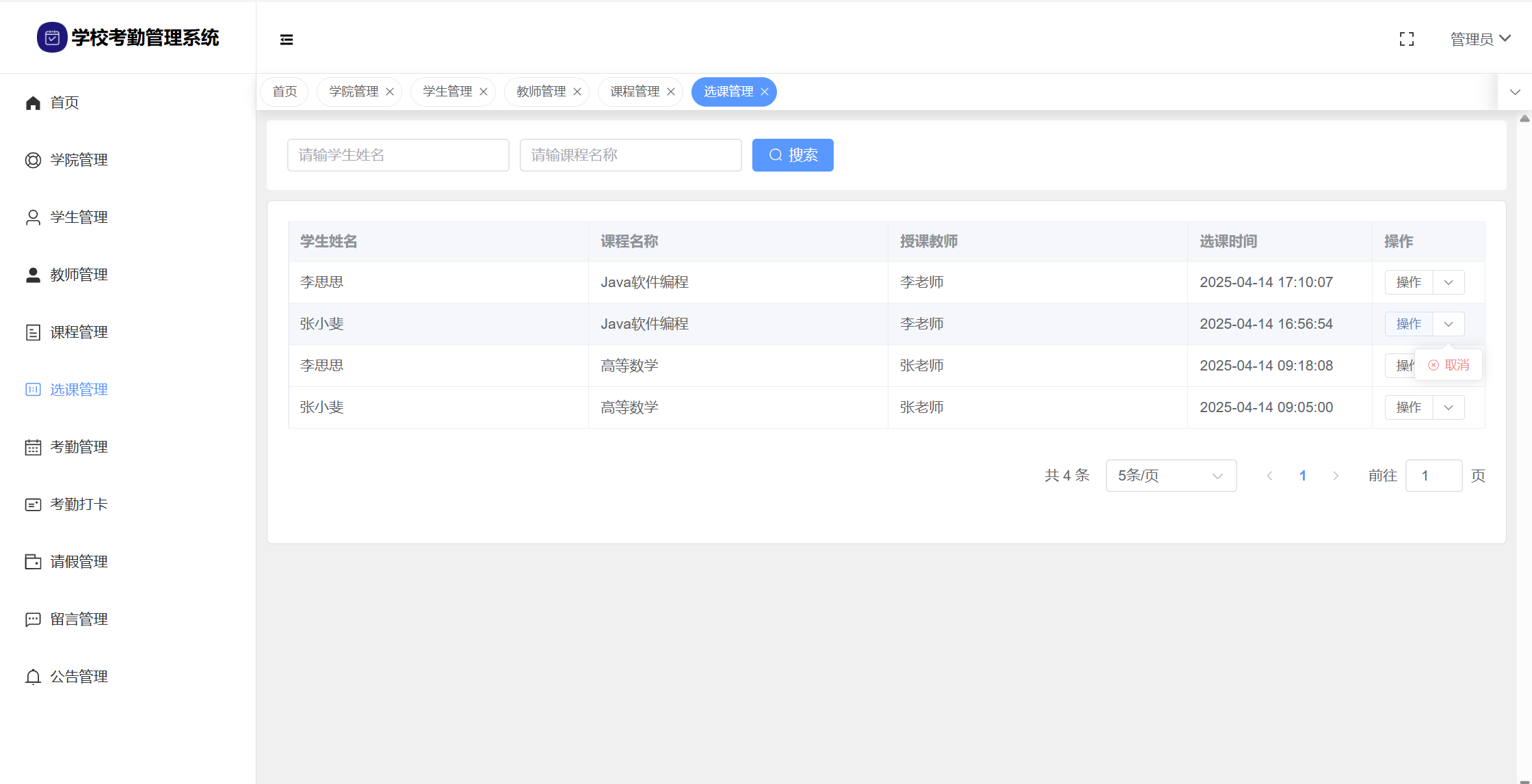 管理员:首页统计(过去7天未签到人数、学生统计);学院管理;学生管理;教师管理;课程管理;选课管理;考勤管理;考勤打卡;请假管理;留言管理;公告管理;修改个人资料;修改密码。