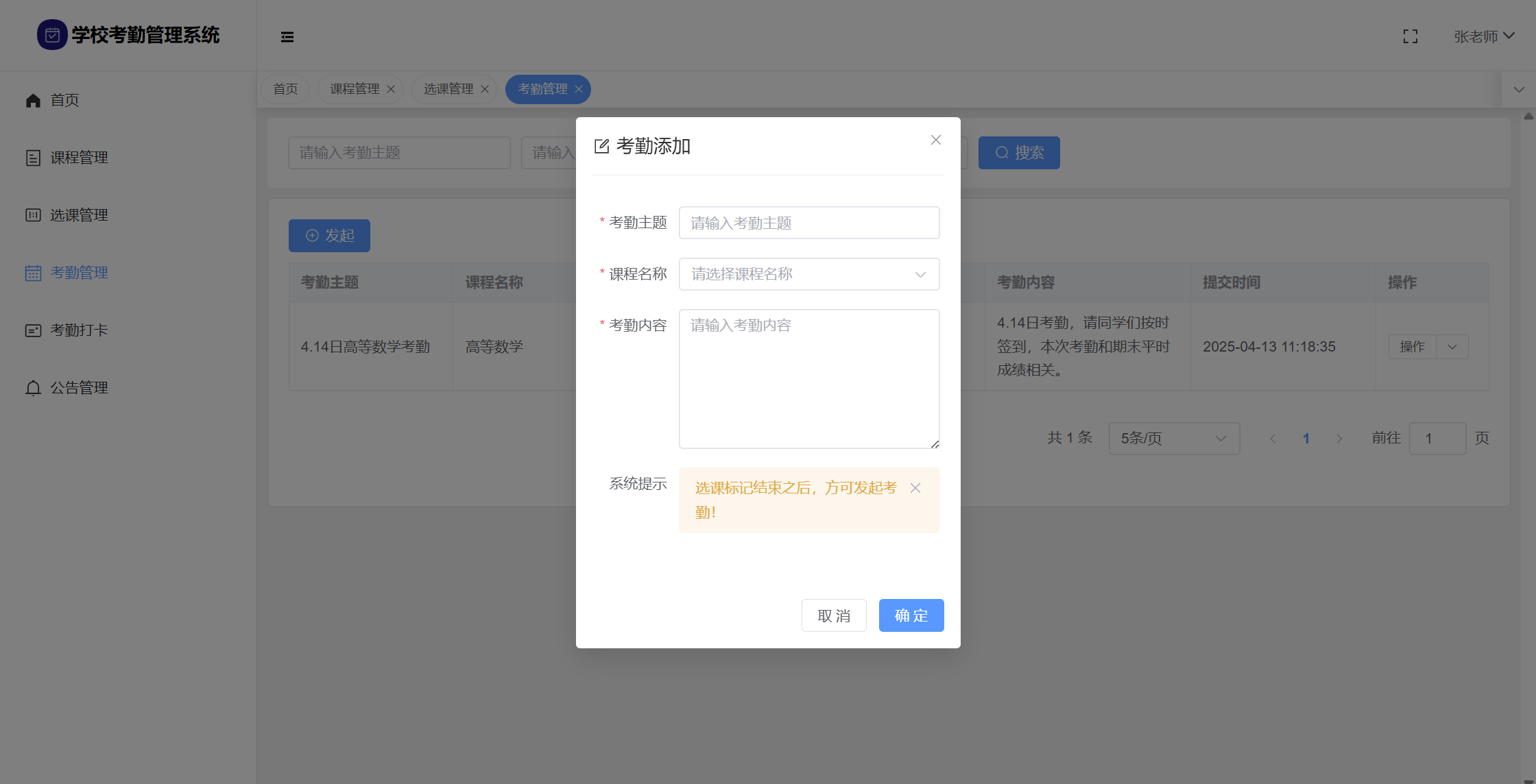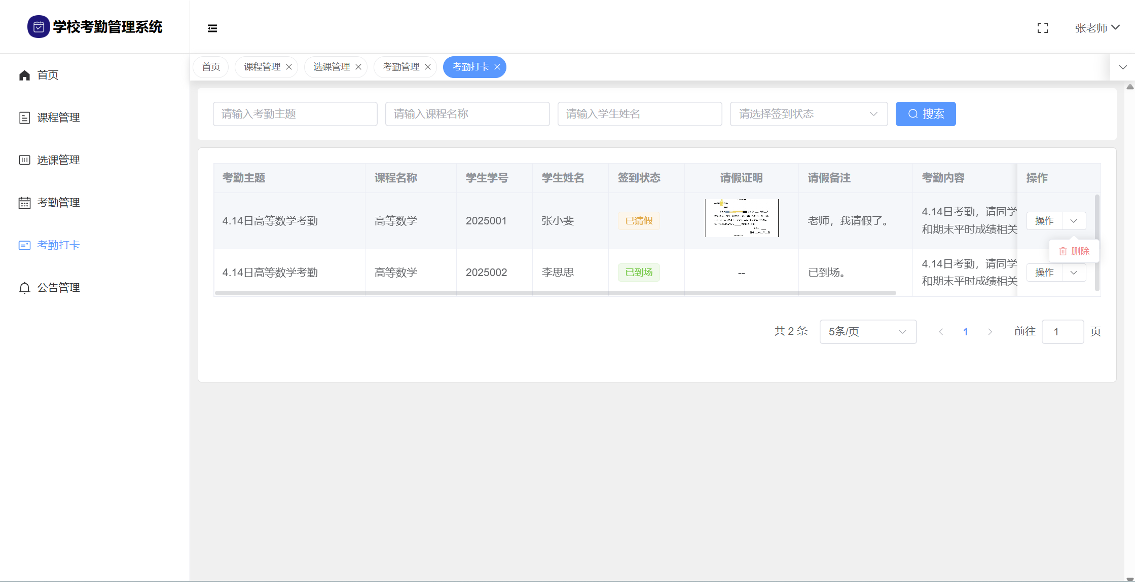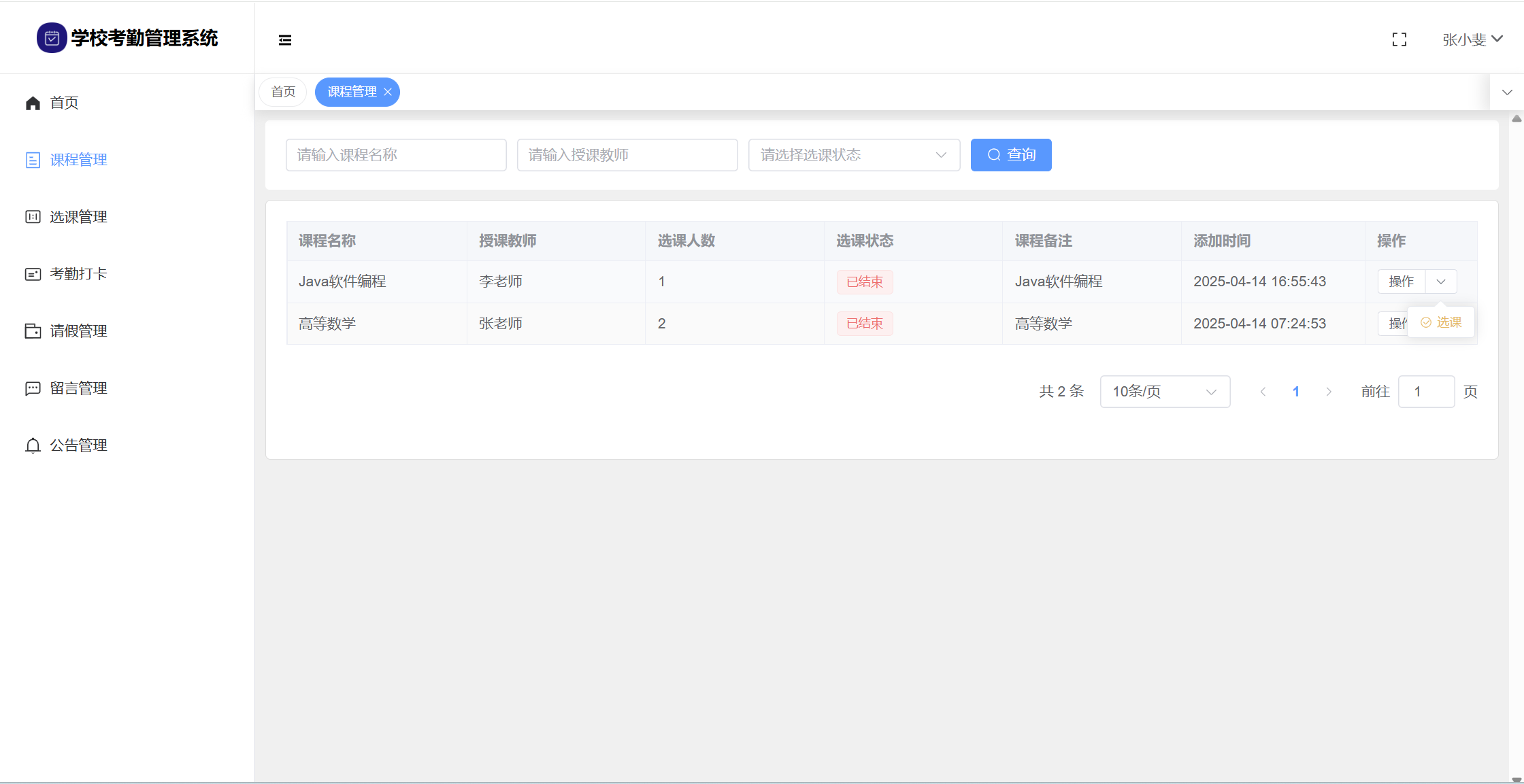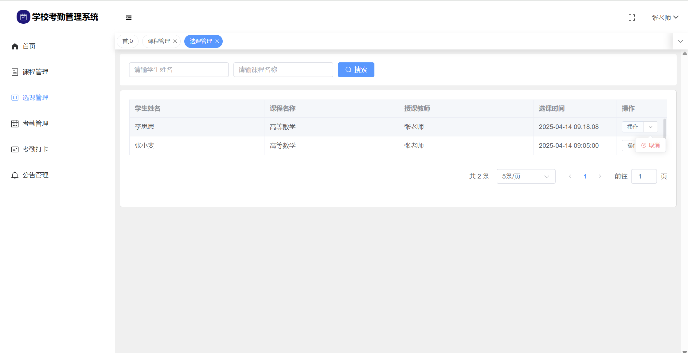 教师:课程管理;选课管理(查看选课学生);考勤管理(发起考勤);考勤打卡(查看打卡学生);公告管理;修改个人资料;修改密码。