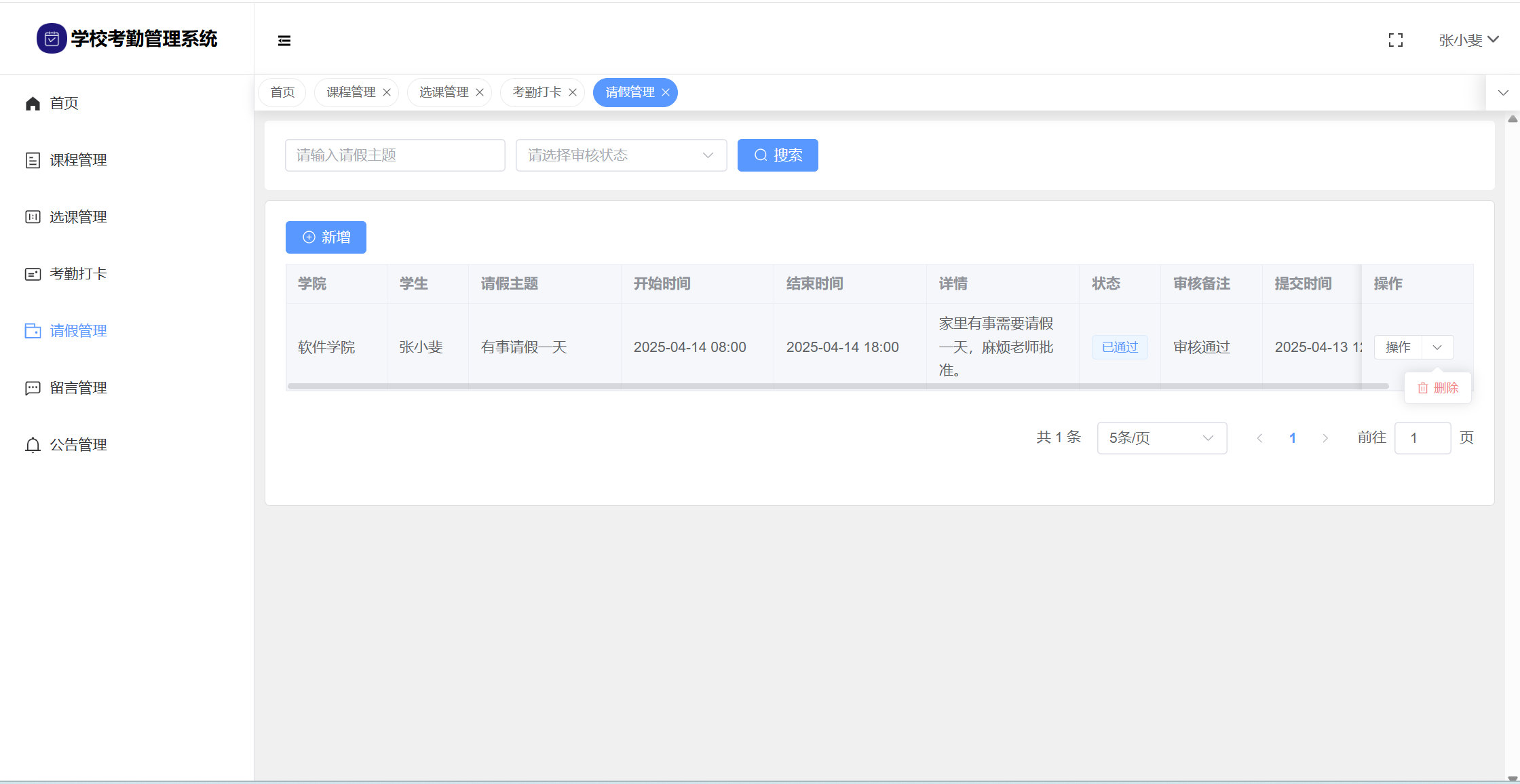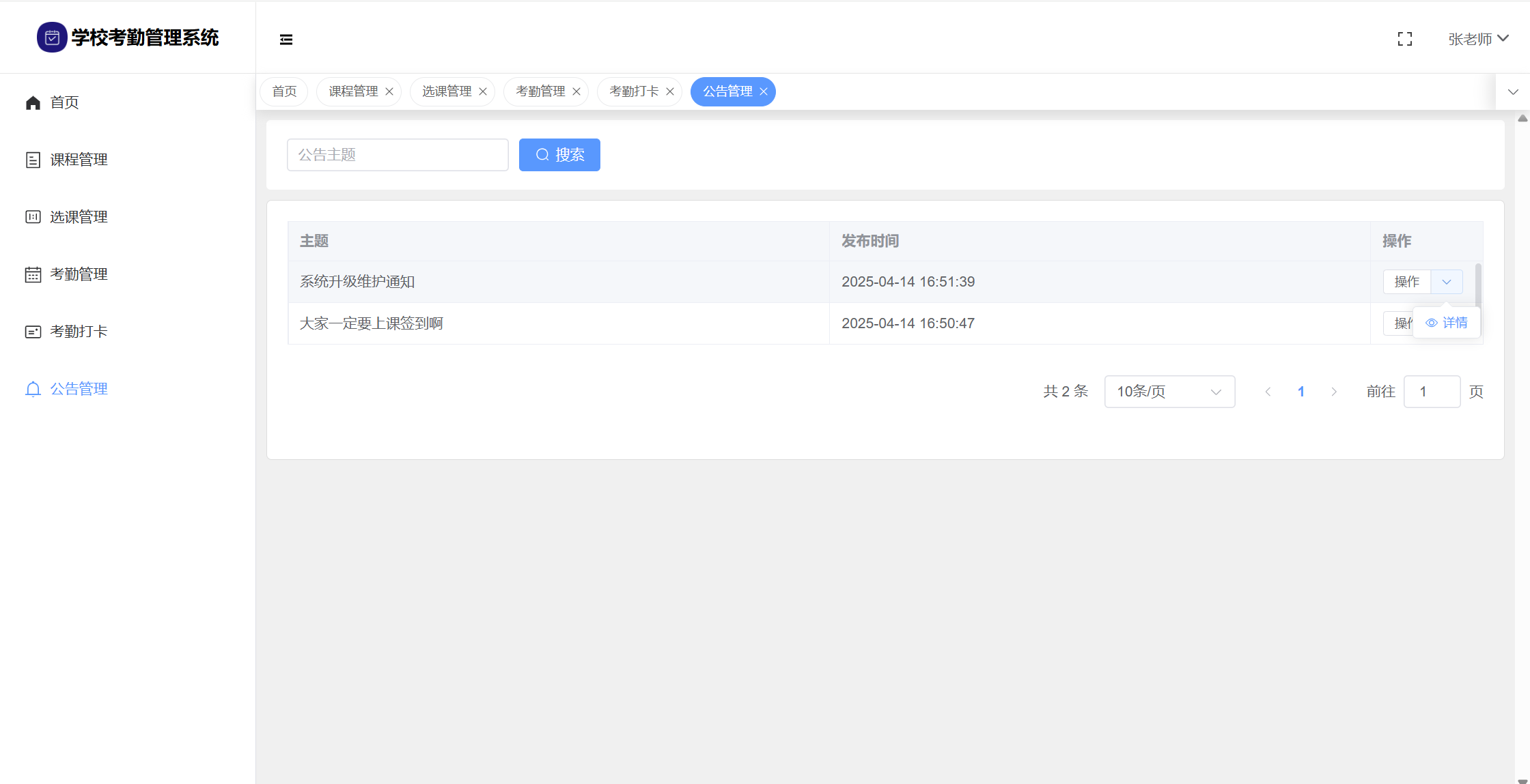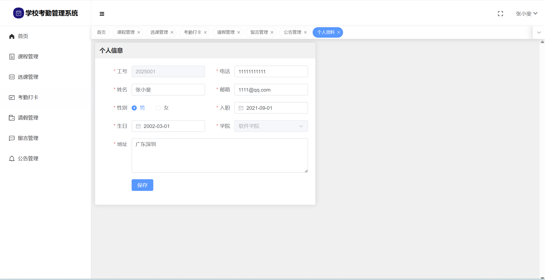 基于SpringBoot3+Vue3前后端分离的校园考勤管理系统(源码+文档),系统包含管理员、教师、员工角色,功能如下: