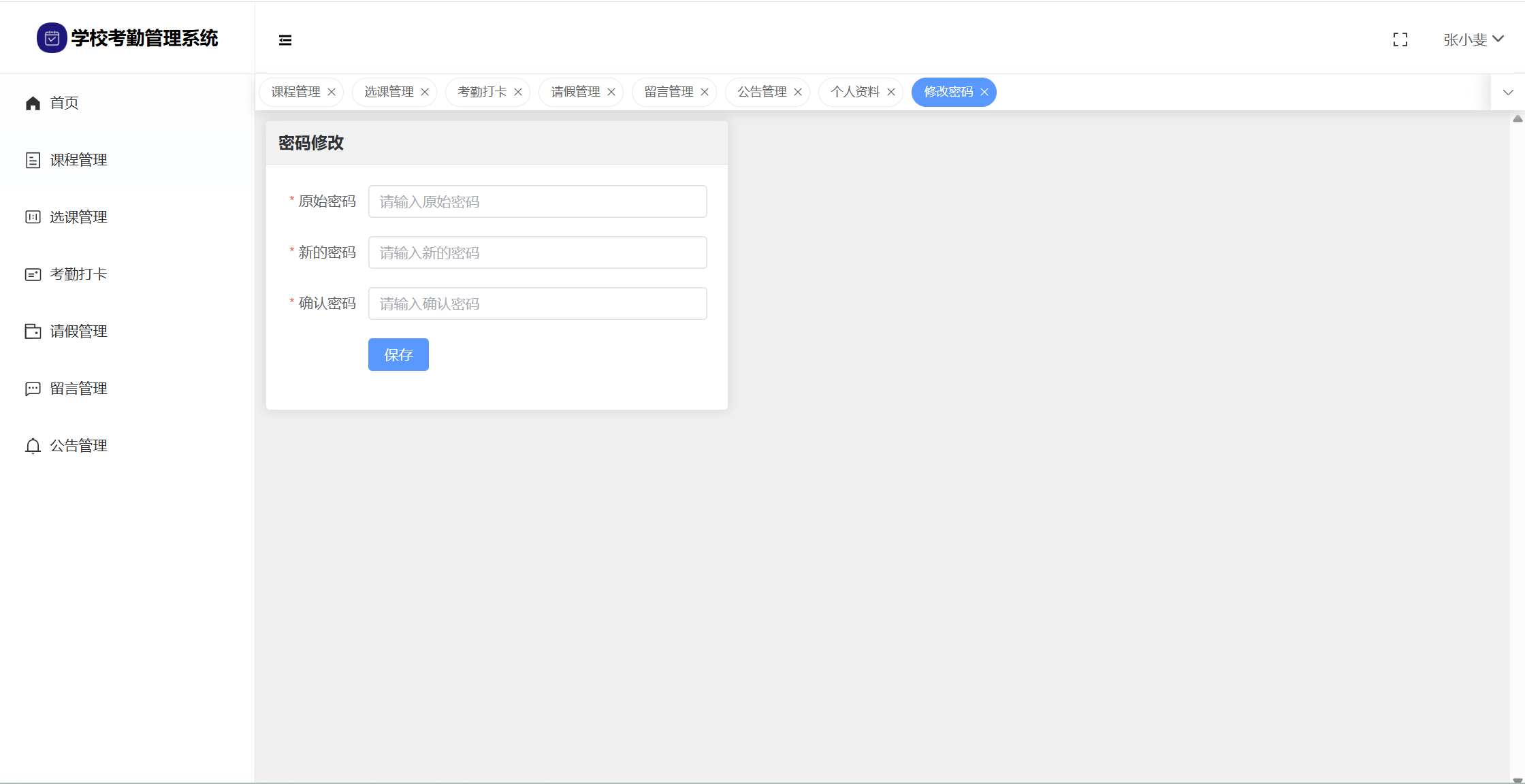 学生:课程管理;选课管理;考勤打卡;请假管理;留言管理;公告管理;个人信息修改;密码修改。