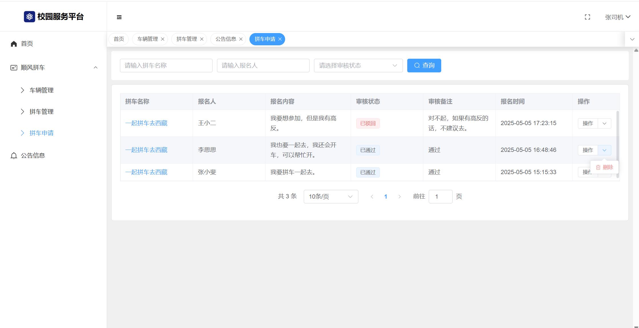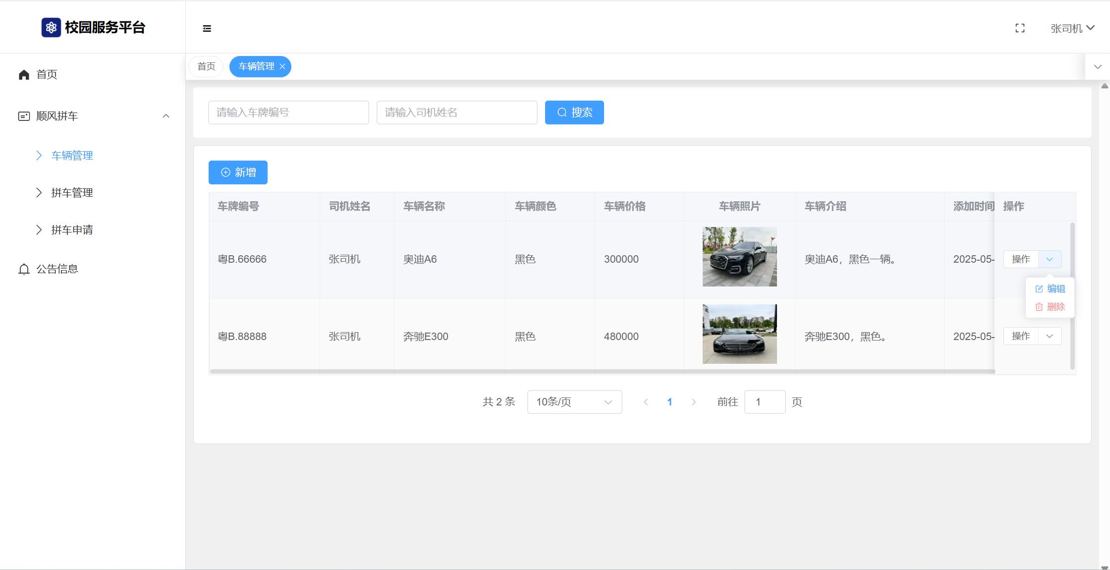 司机:顺风拼车(车辆管理、拼车管理、拼车申请);公告查看;个人信息;修改密码。