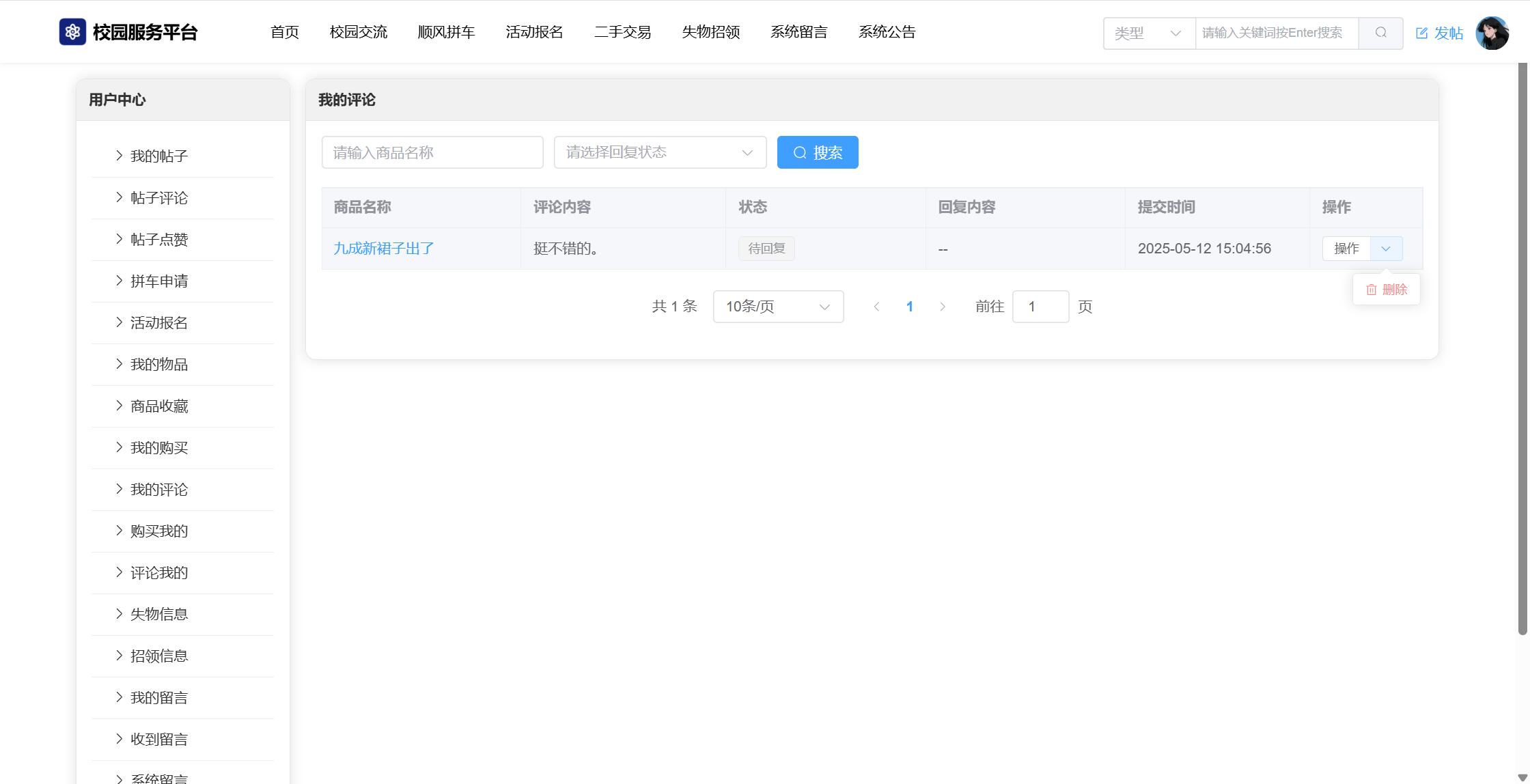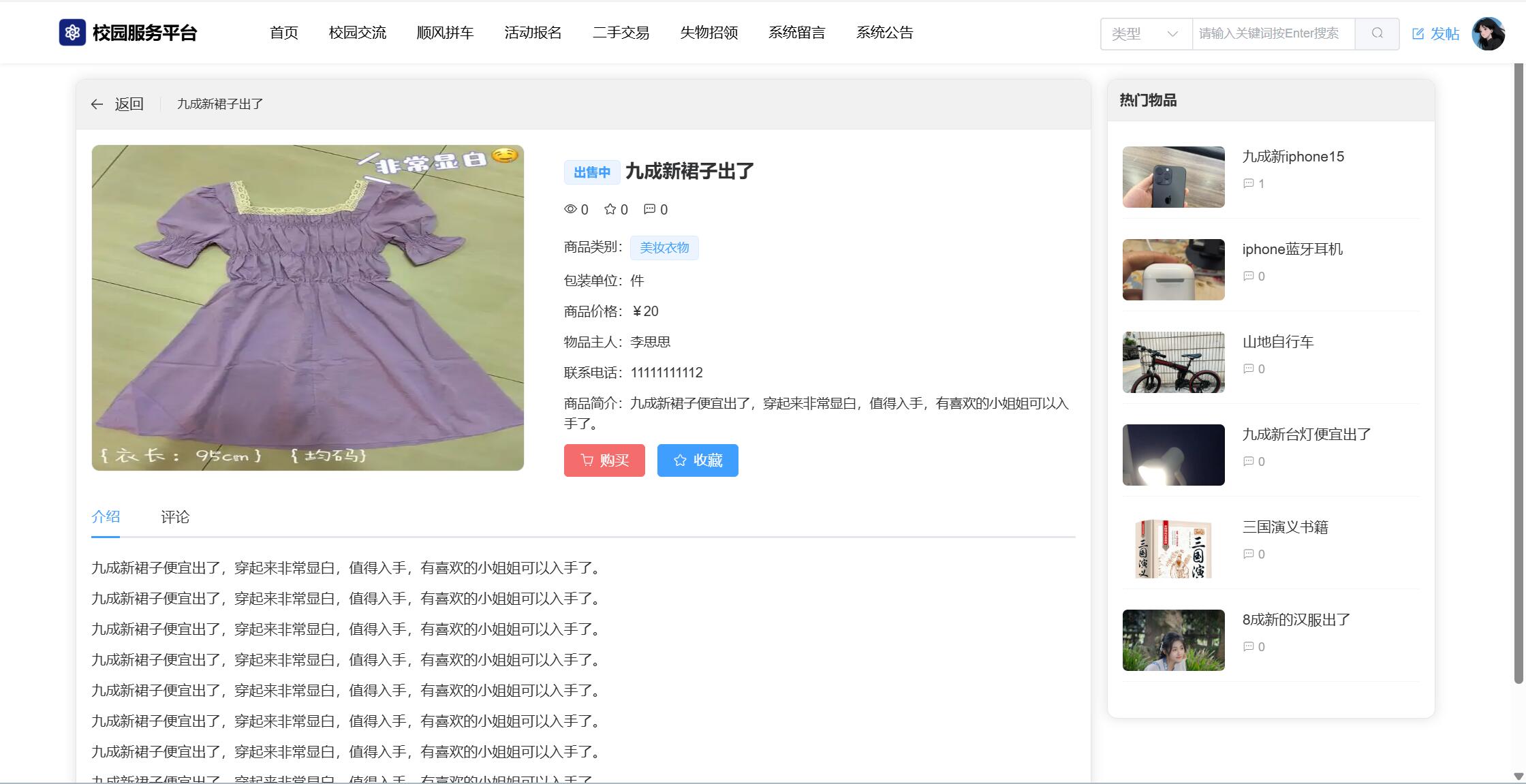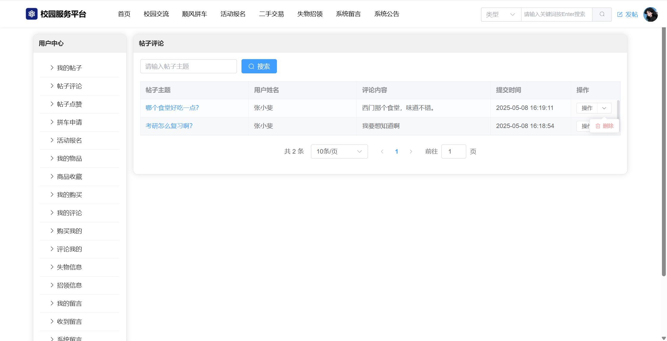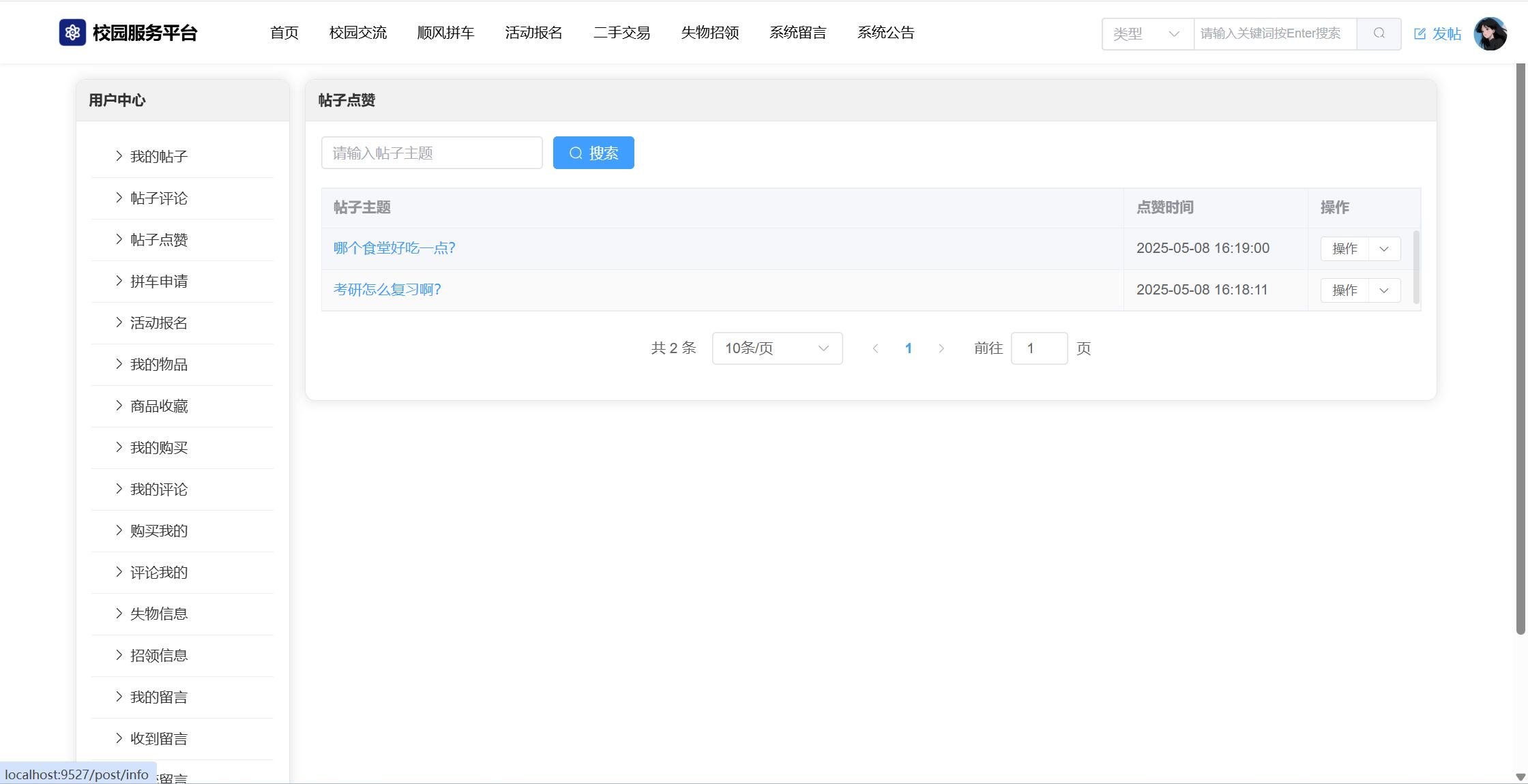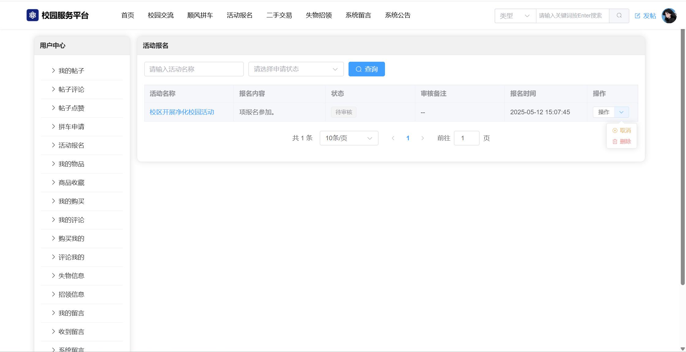 用户:注册、登录;首页、校园交流(版块、帖子信息、详情、点赞、评论);顺风拼车(详情、拼车、报名名单);活动报名(详情、报名、报名名单);二手交易(分类、物品信息、详情、购买、收藏);失物招领(失物信息、招领信息、留言);留言;系统公告;用户还具有个人中心功能:我的帖子、帖子评论、帖子点赞、拼车申请、活动报名、我的物品、商品收藏、我的购买、我的评论、购买我的、评论我的、失物信息、招领信息、我的留言、收到留言;系统留言;个人资料;修改密码。