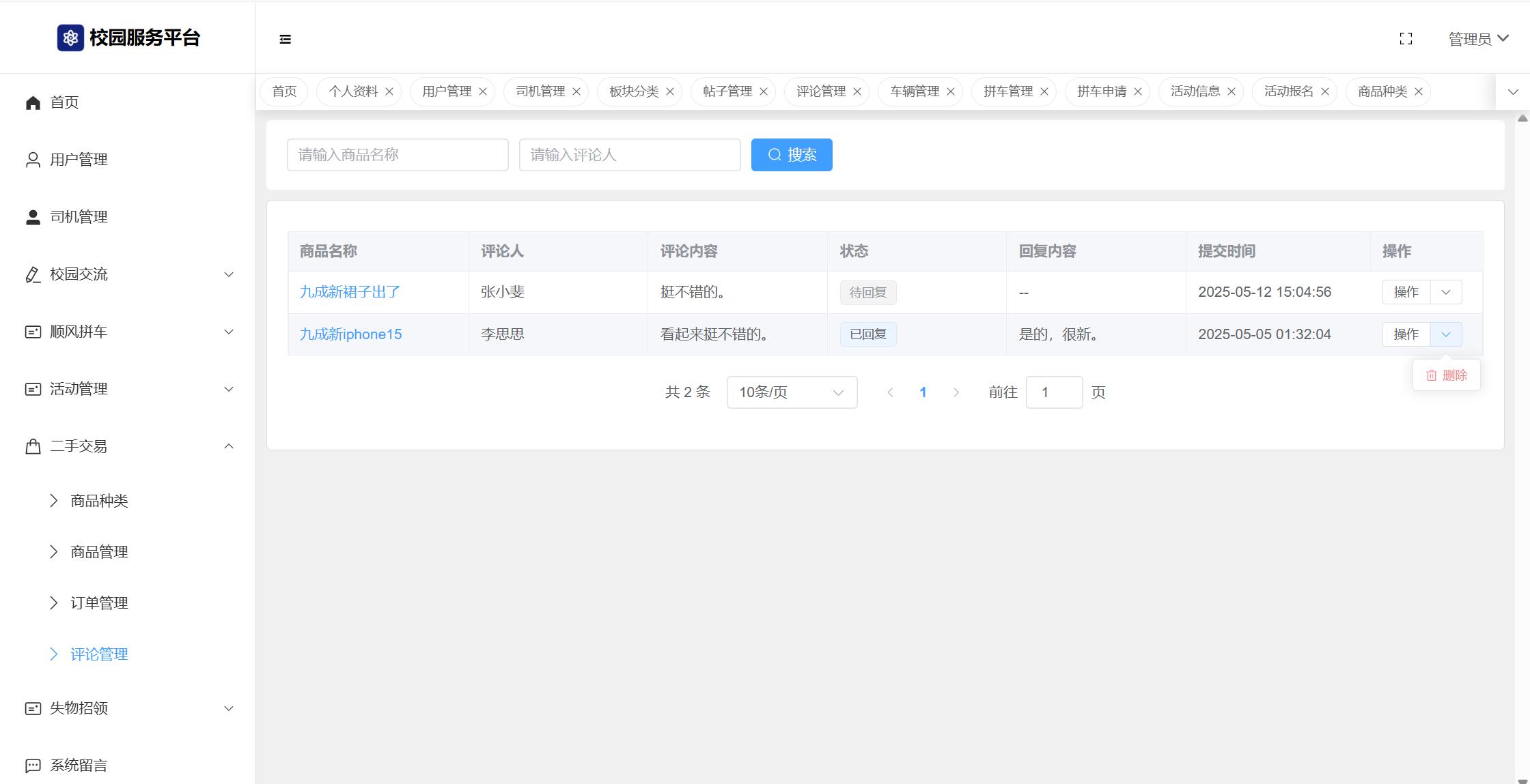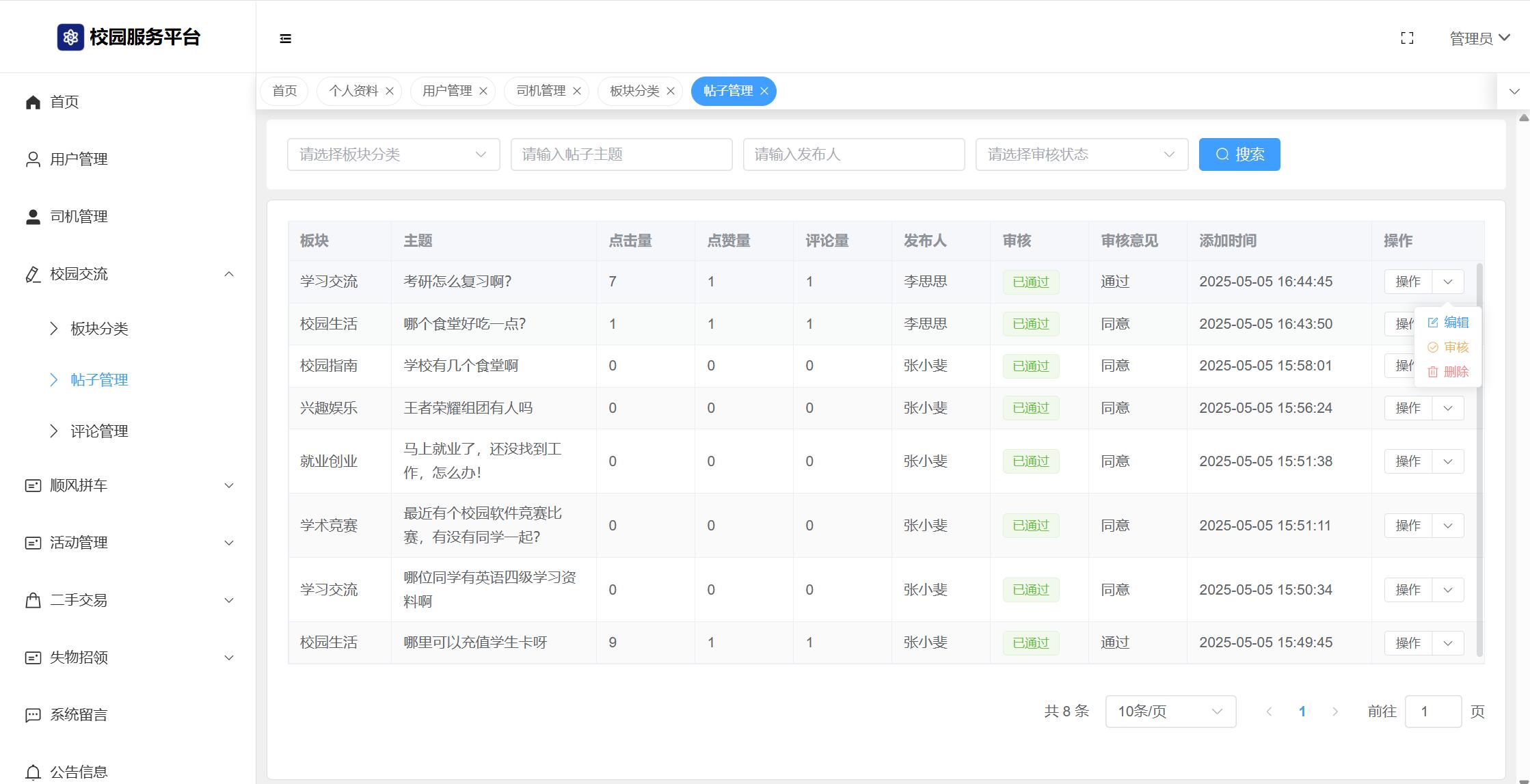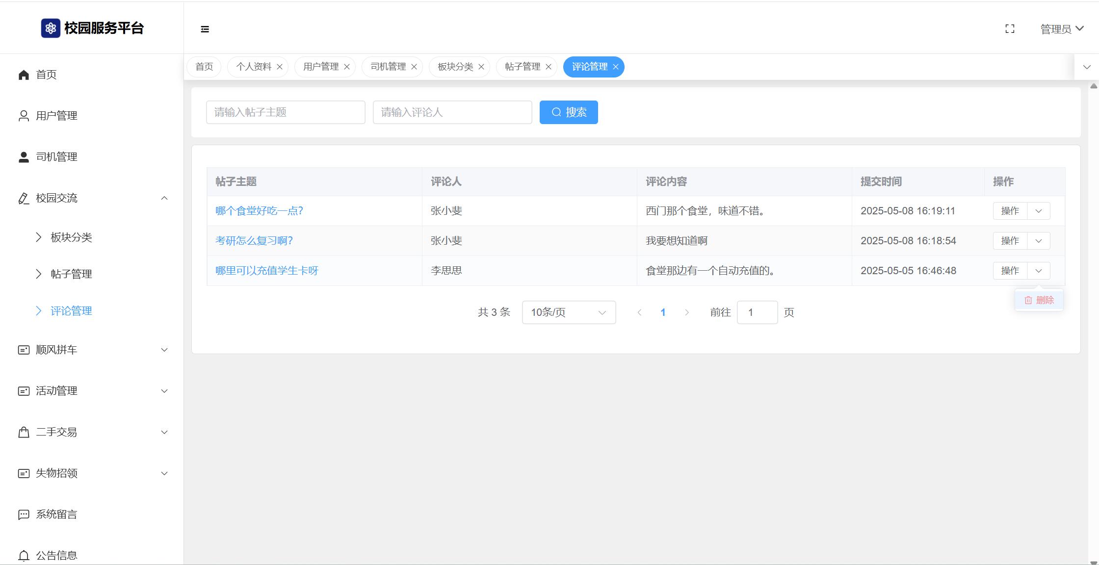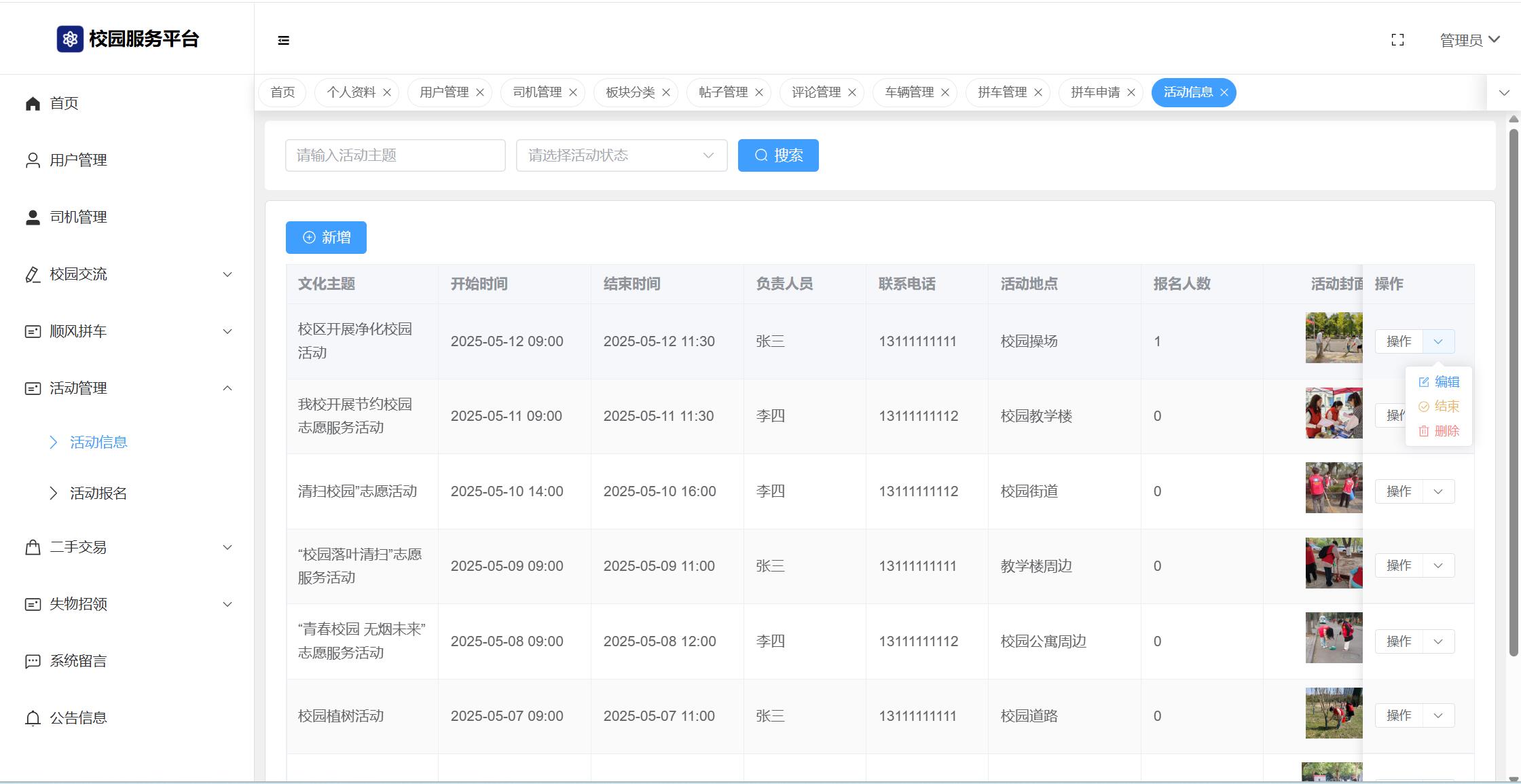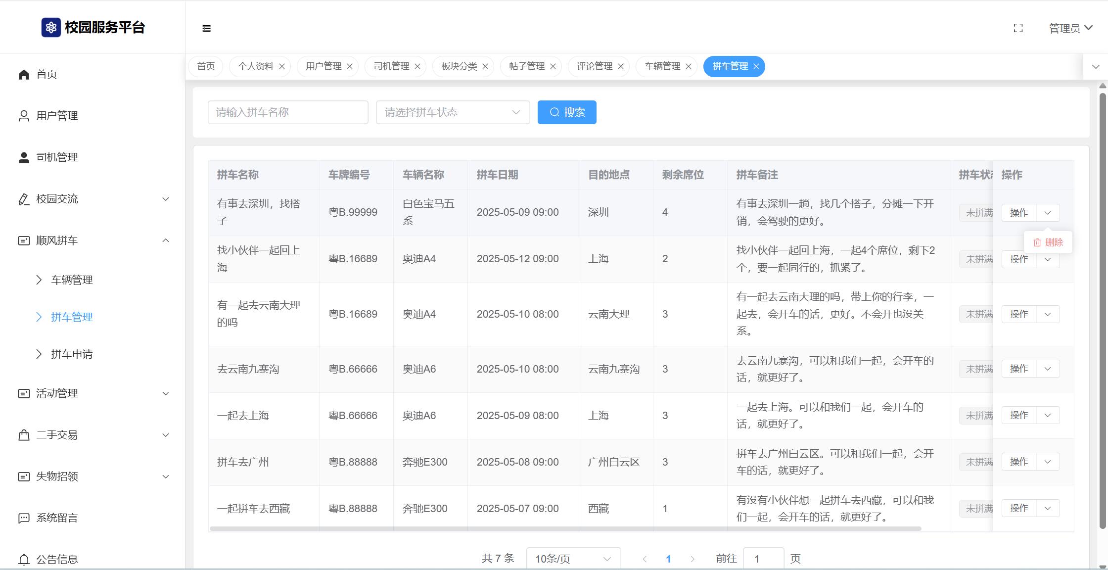 管理员:首页统计(帖子统计、二手交易金额统计);用户管理;司机管理;校园交流(版块分了、帖子管理、评论管理);顺风拼车(车辆管理、拼车管理、拼车申请);活动管理(活动信息、活动报名);二手交易(商品种类、商品管理、订单管理、评论管理);失物招领(失物信息、招领信息、留言管理);系统留言;公告信息;个人信息;修改密码。
