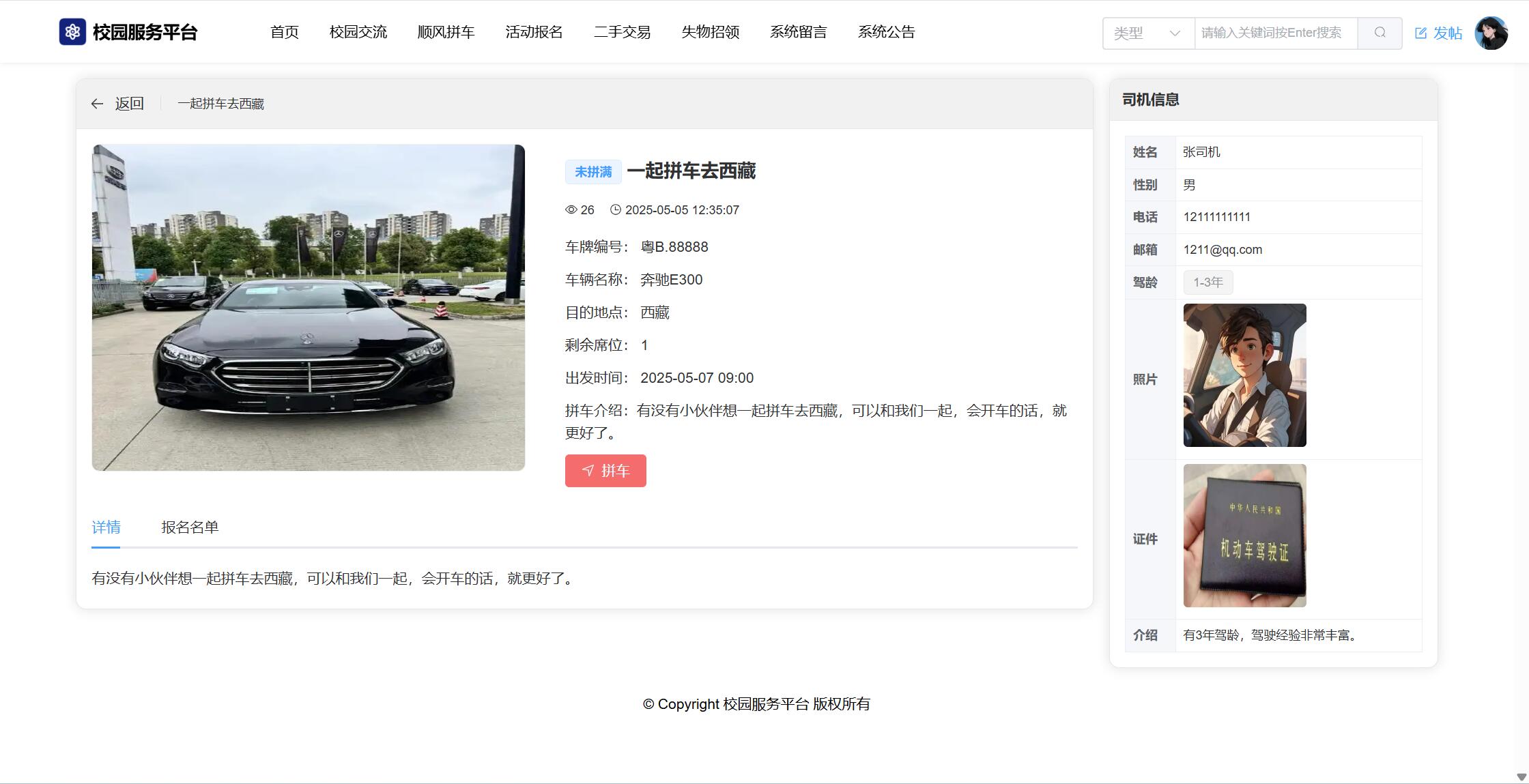 基于SpringBoot3+Vue3前后端分离的校园服务平台系统,系统包含管理员、司机、用户角色,功能如下: