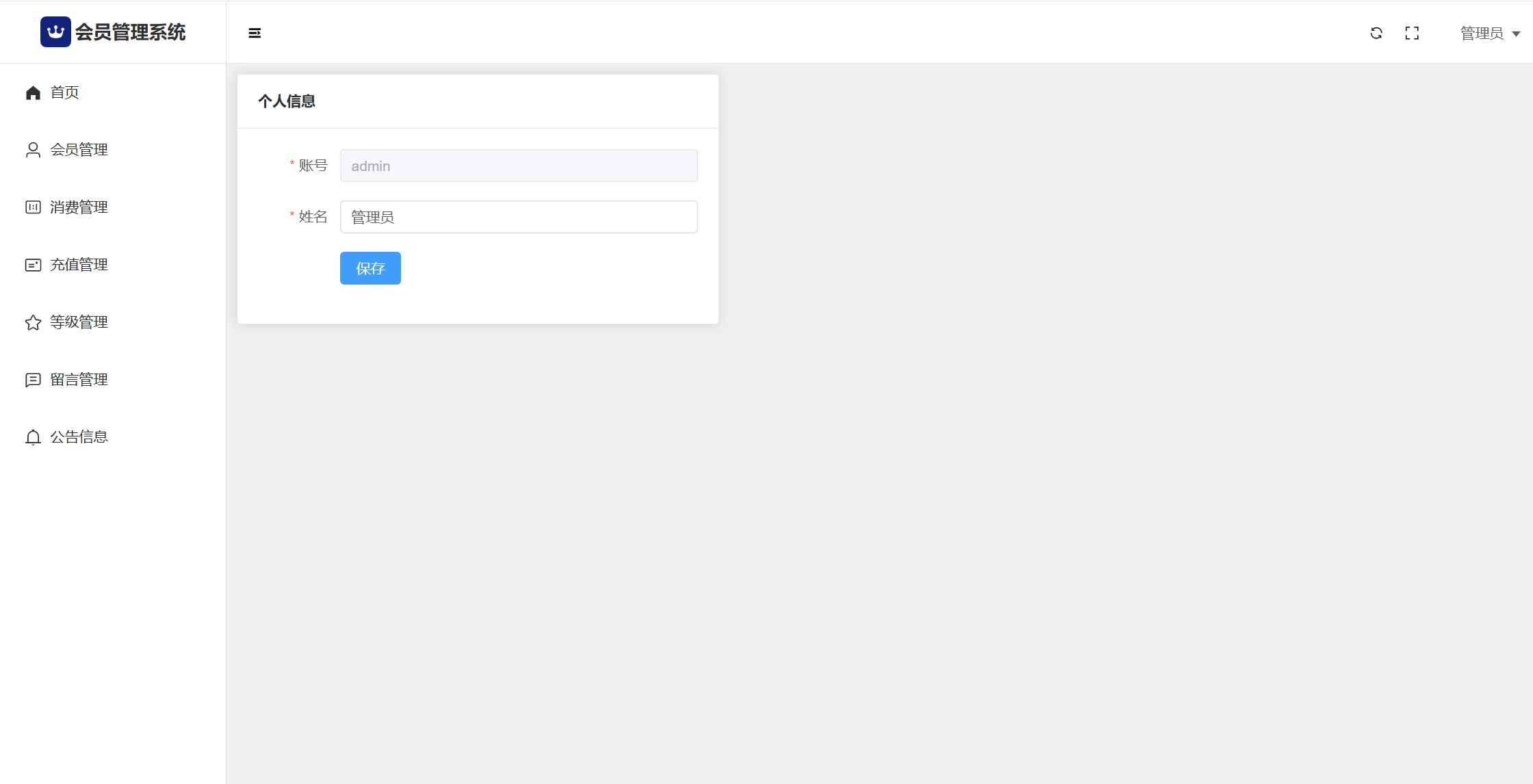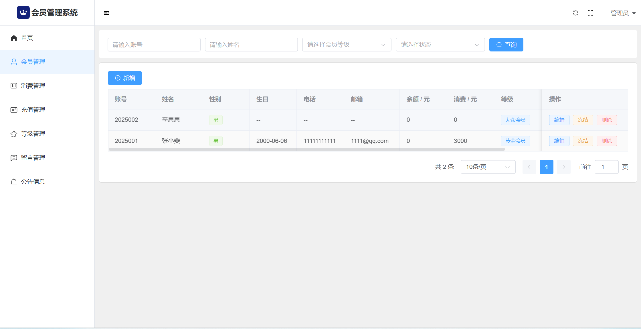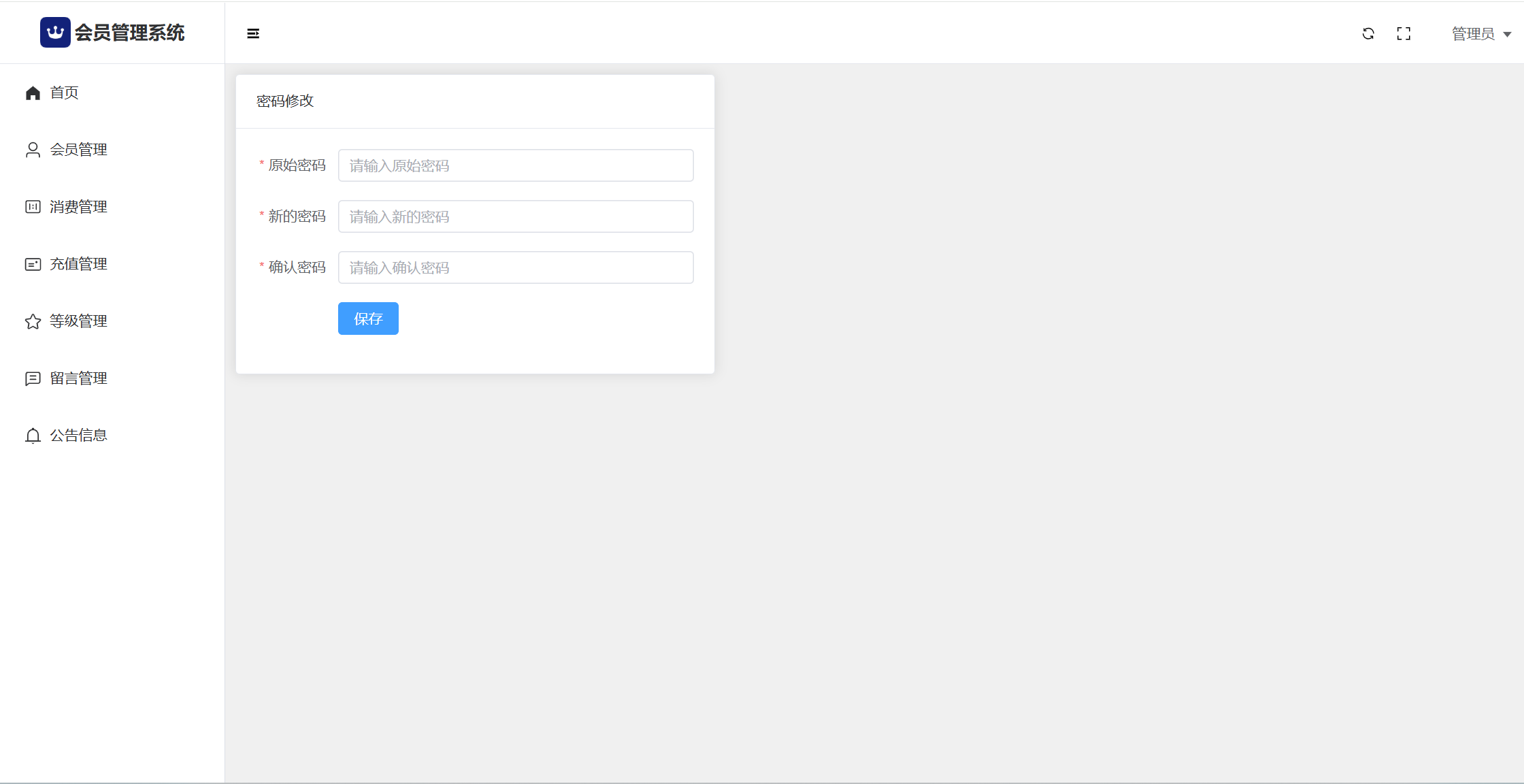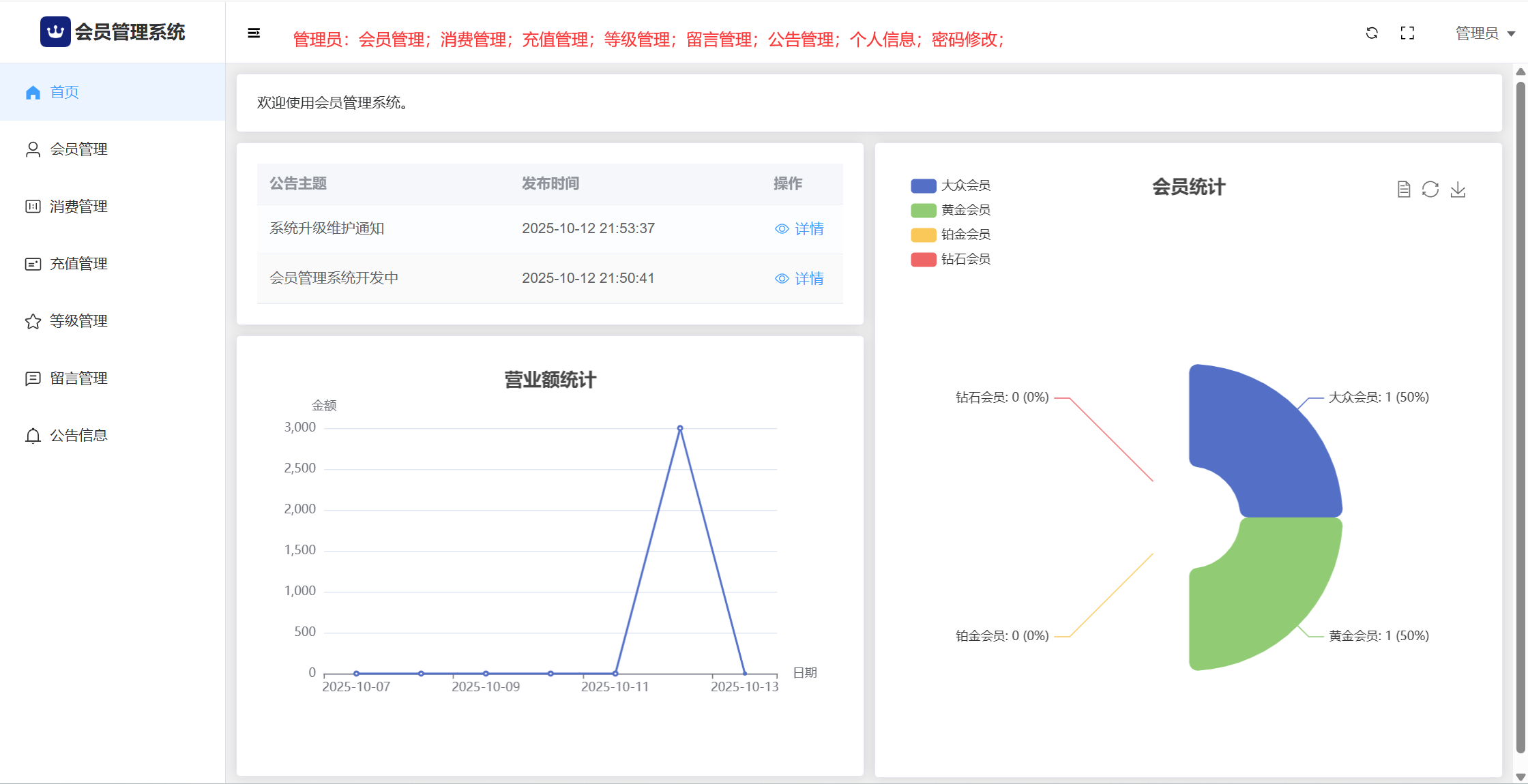 管理员:会员管理;消费管理;充值管理;等级管理;留言管理;公告管理;个人信息;密码修改;