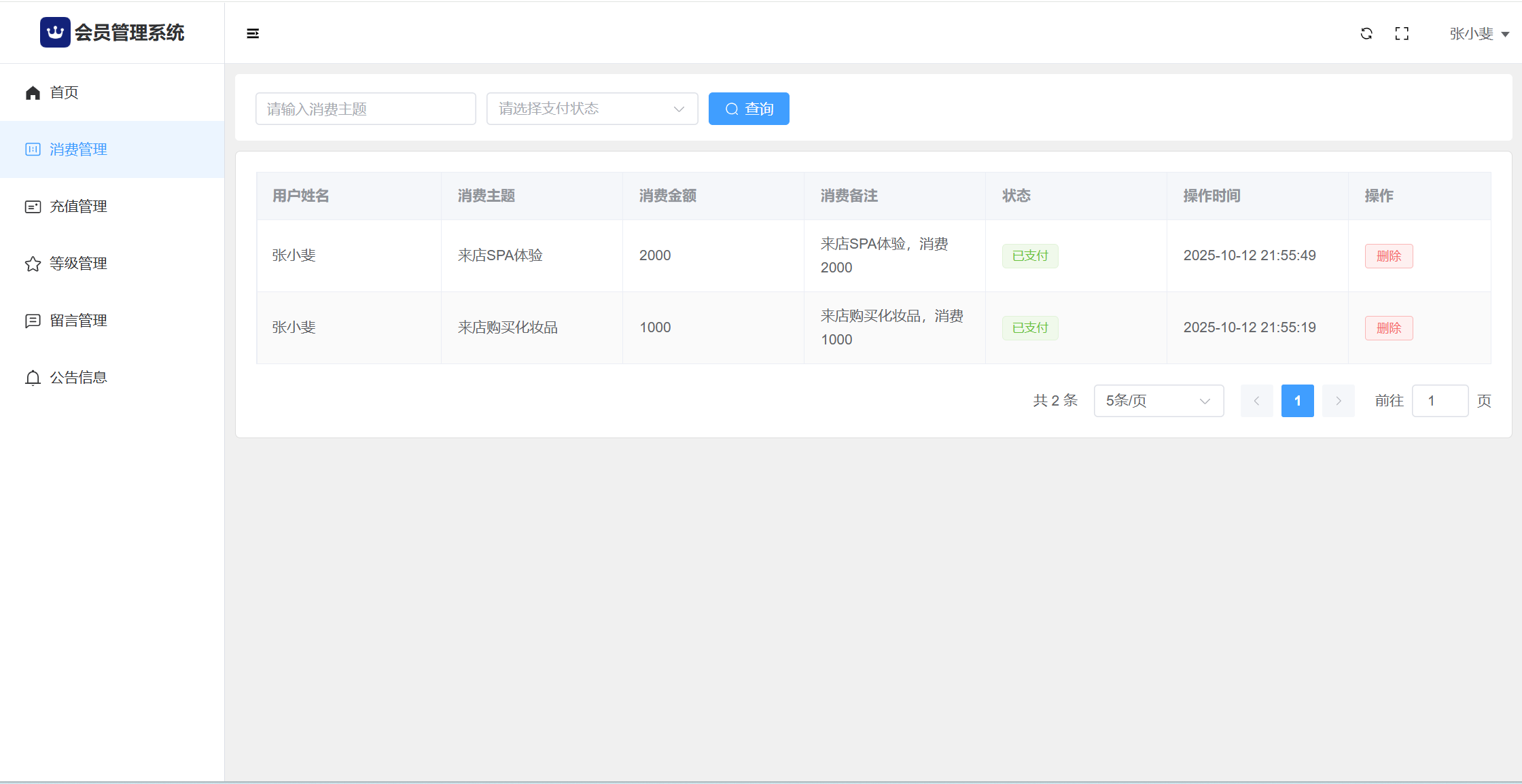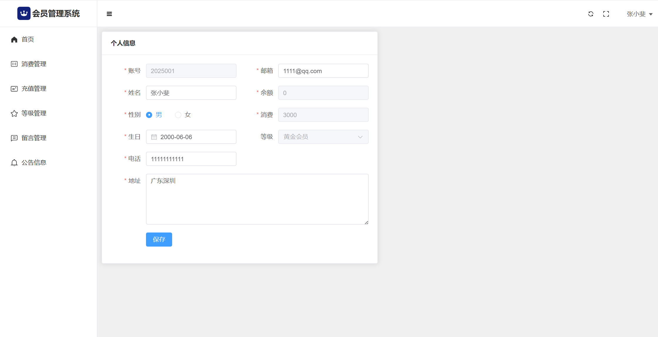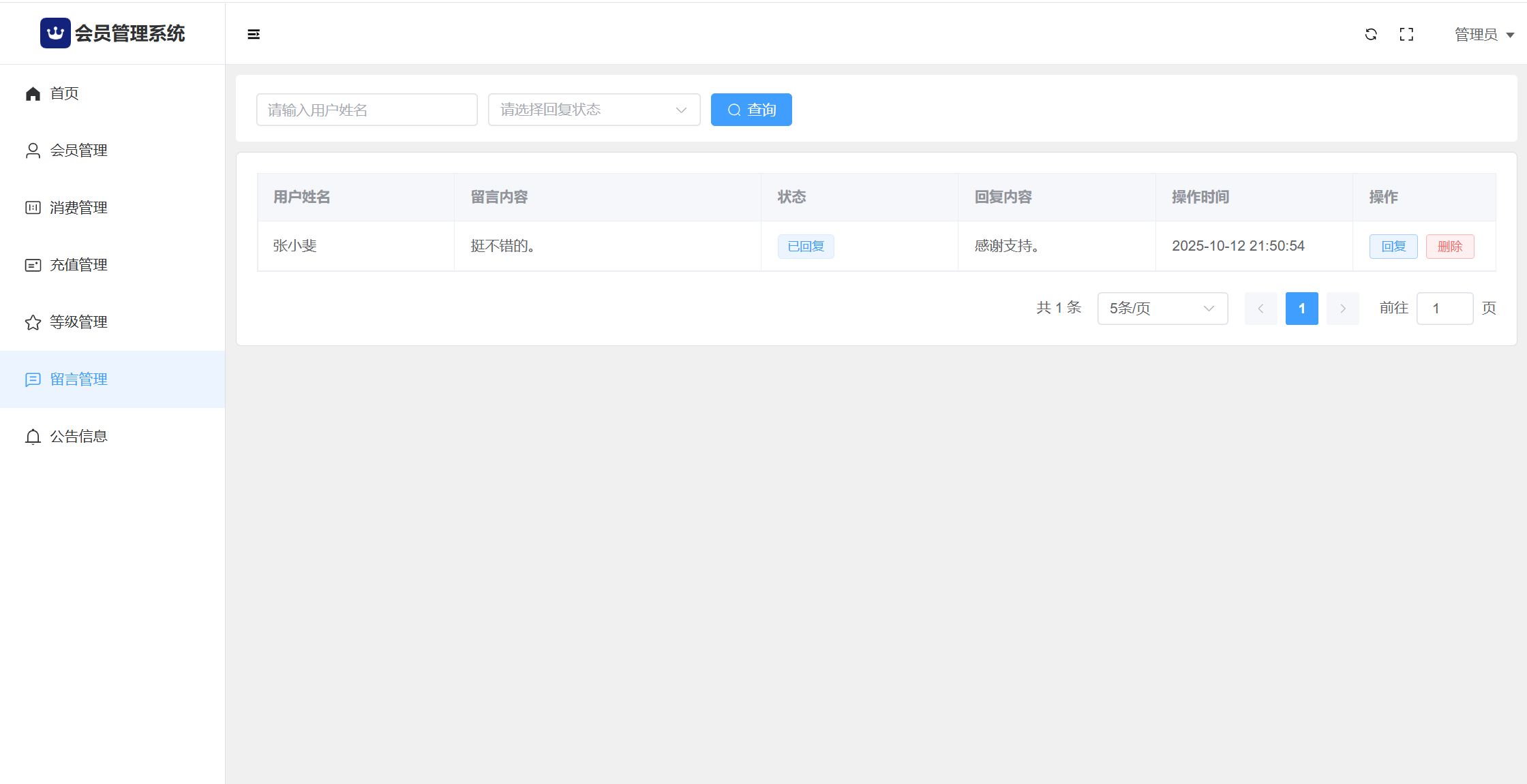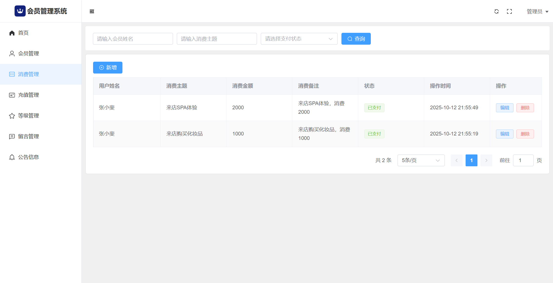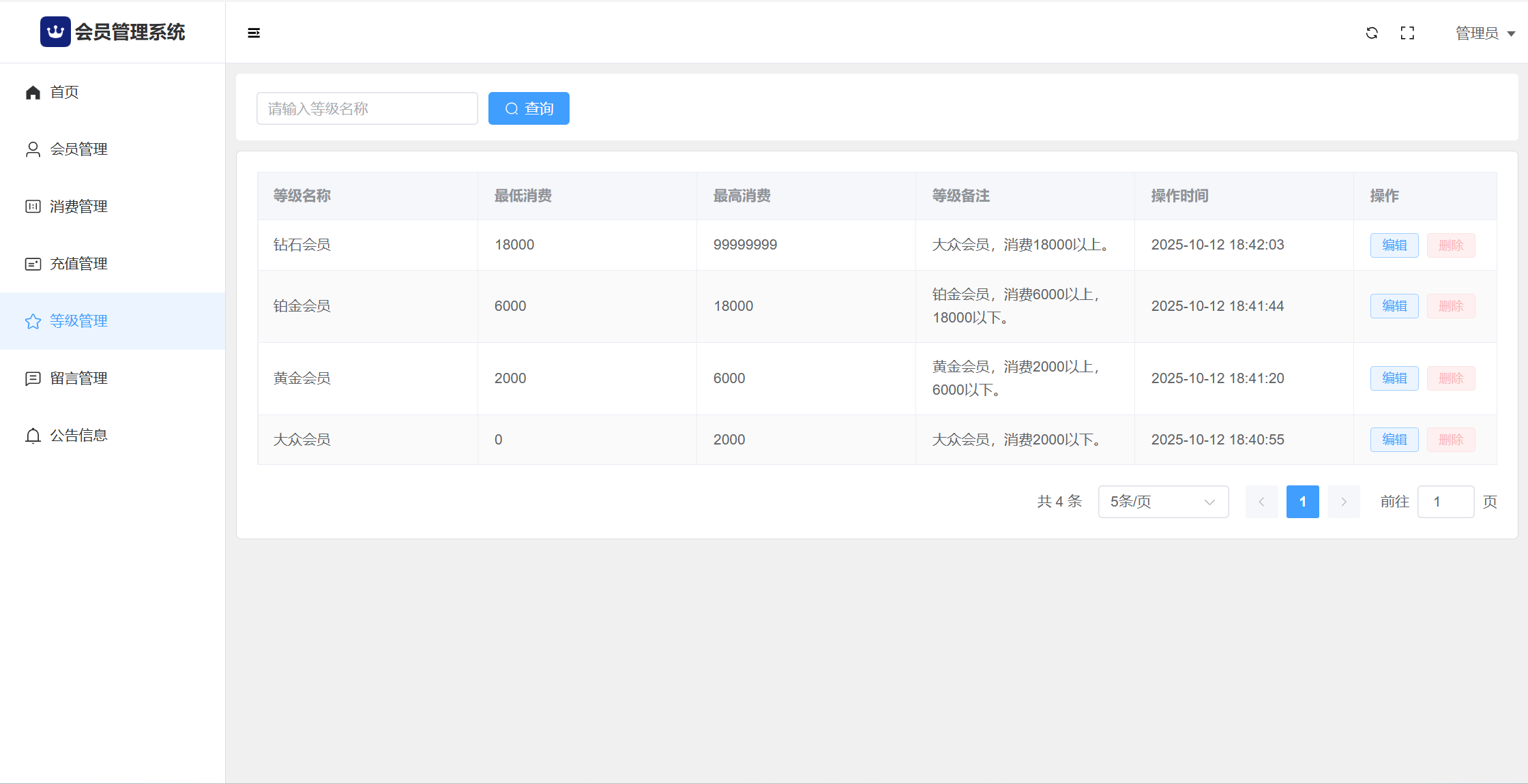 管理员:会员管理;消费管理;充值管理;等级管理;留言管理;公告管理;个人信息;密码修改;