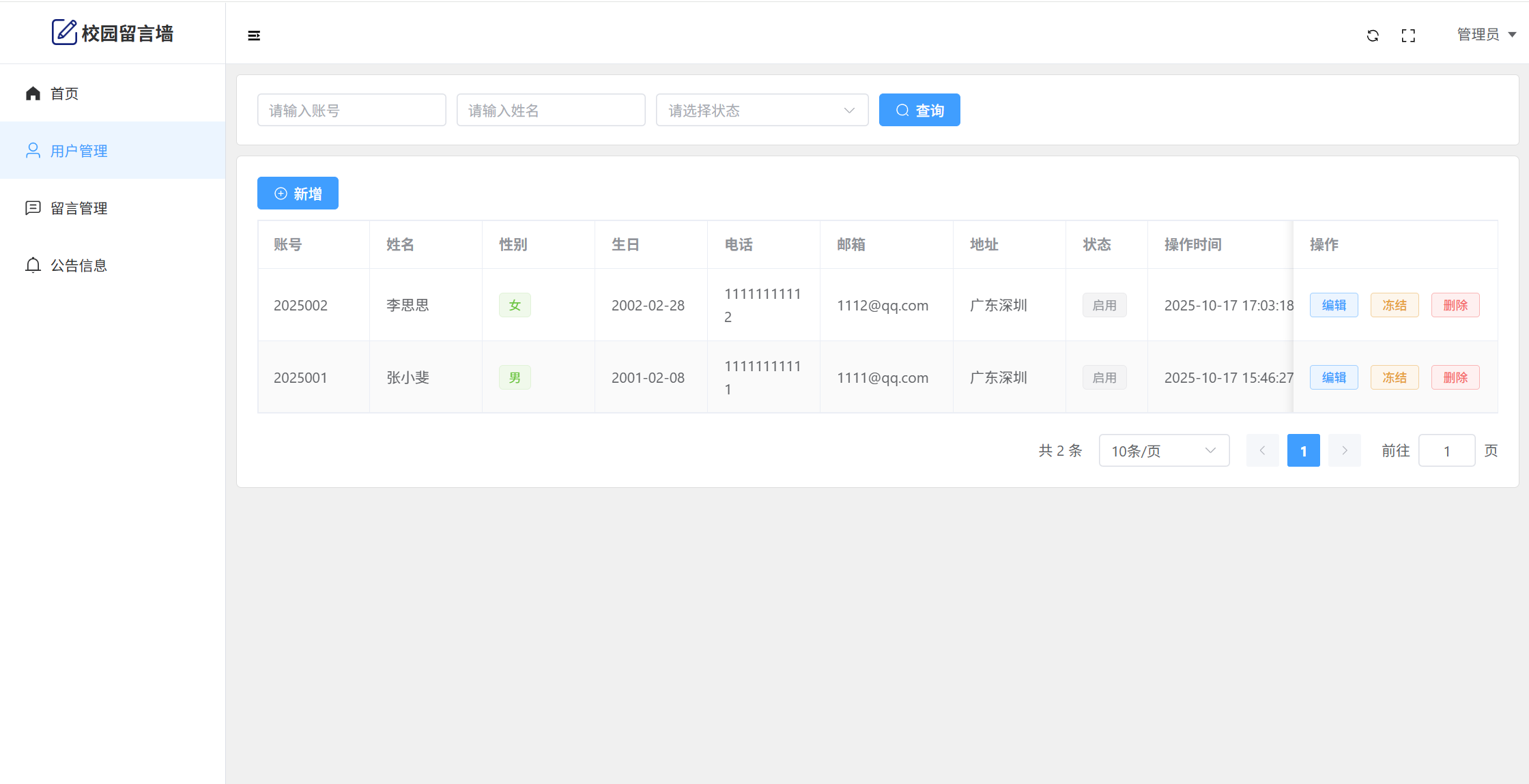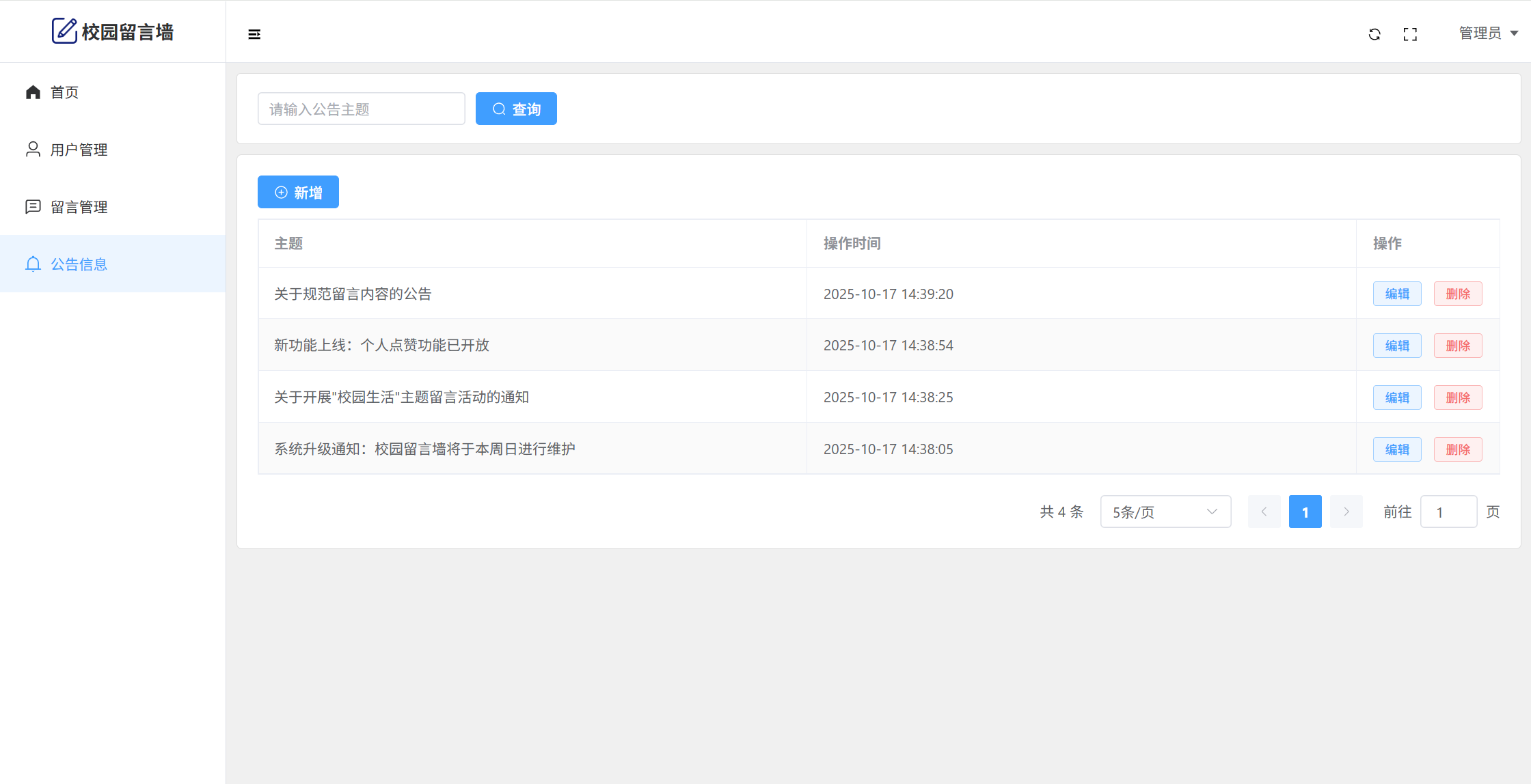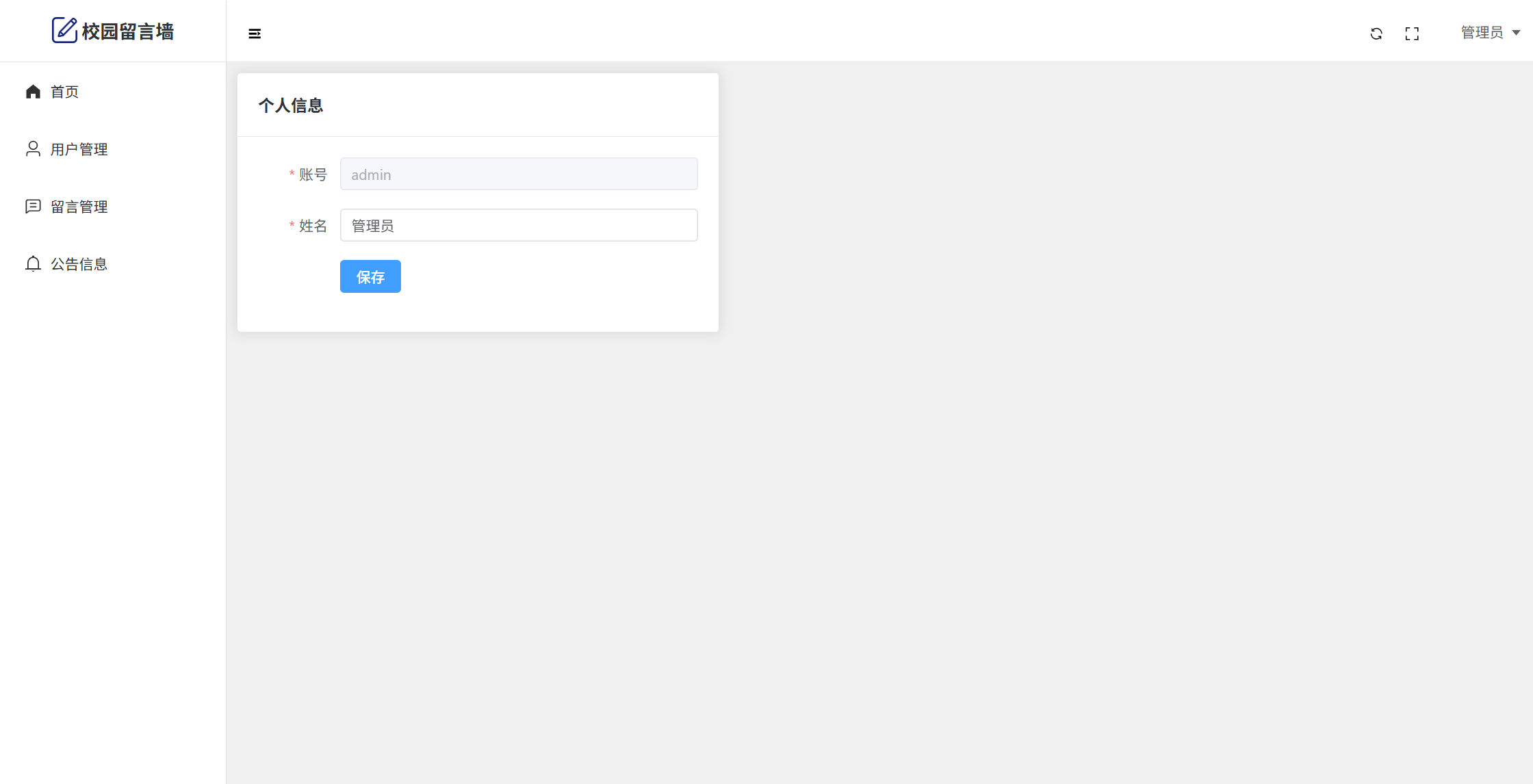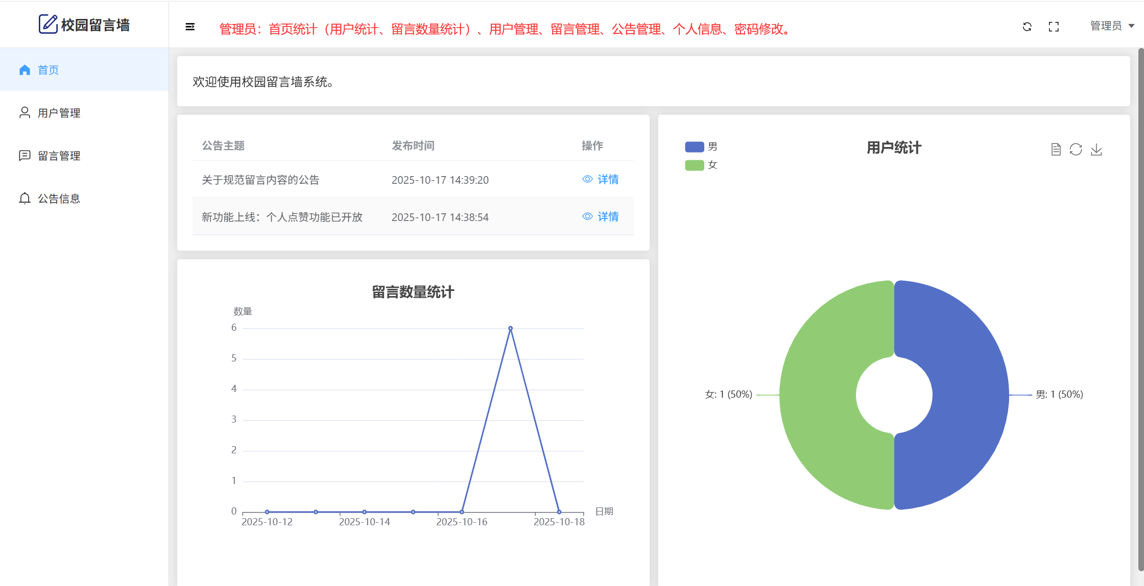 管理员:首页统计(用户统计、留言数量统计)、用户管理、留言管理、公告管理、个人信息、密码修改。