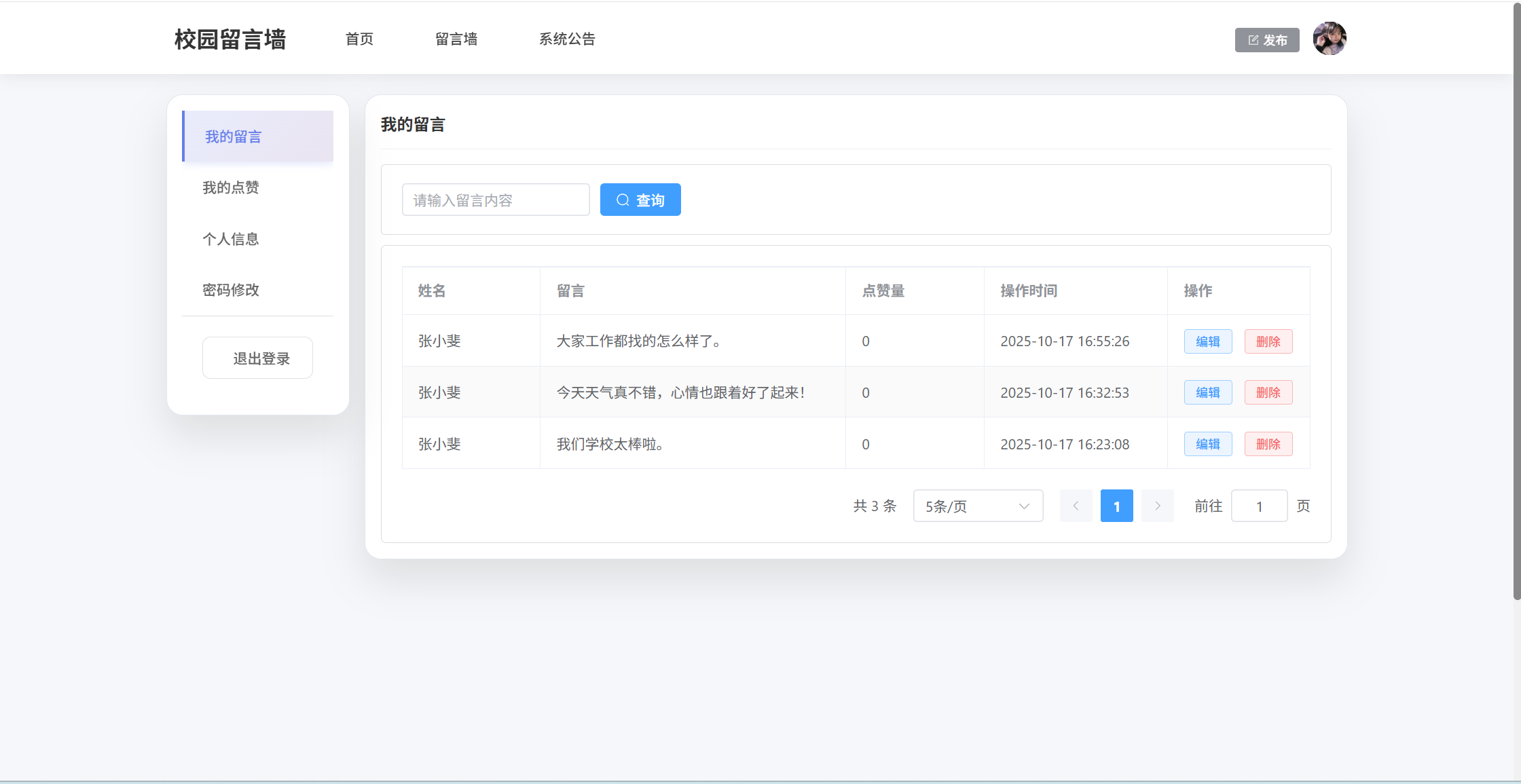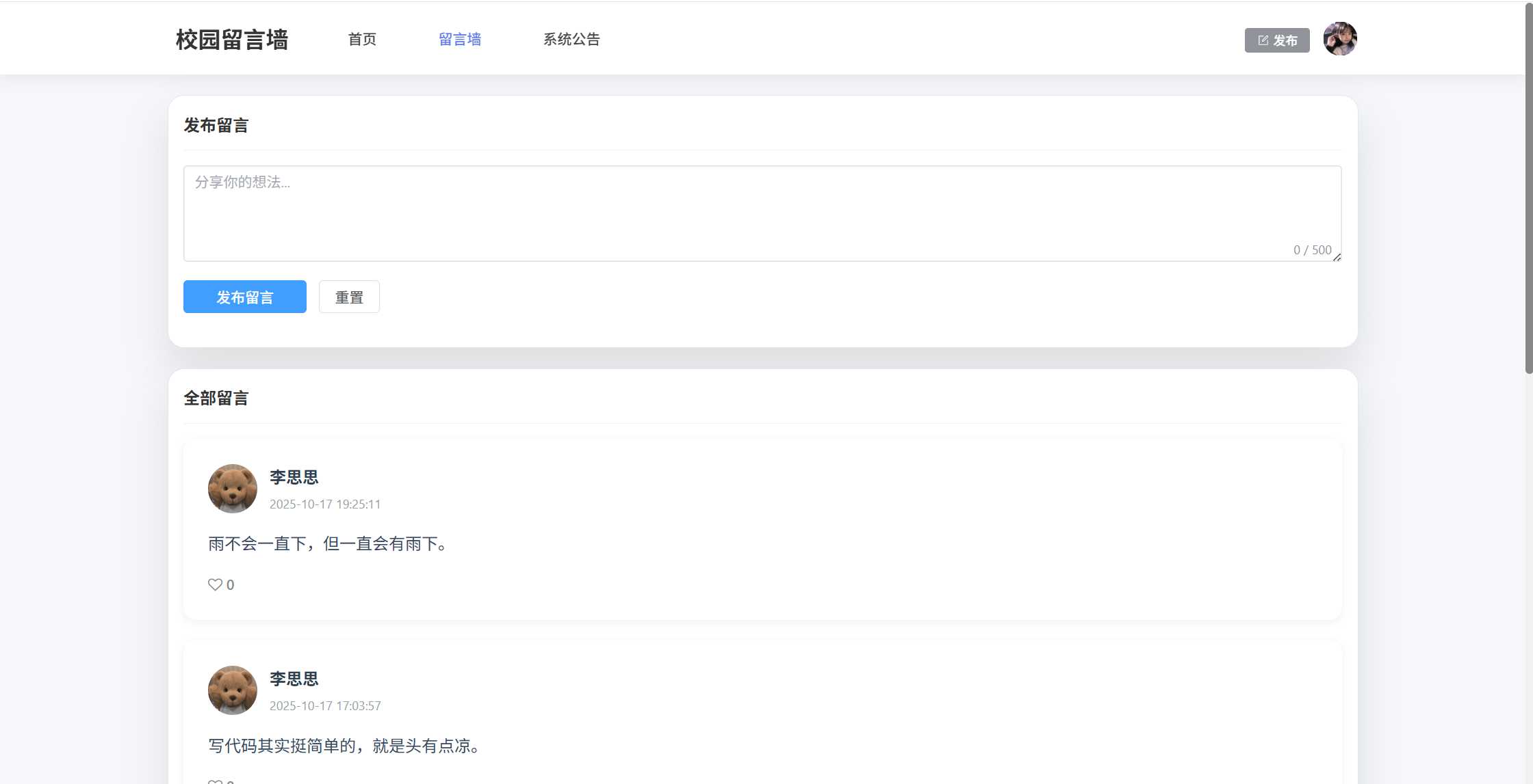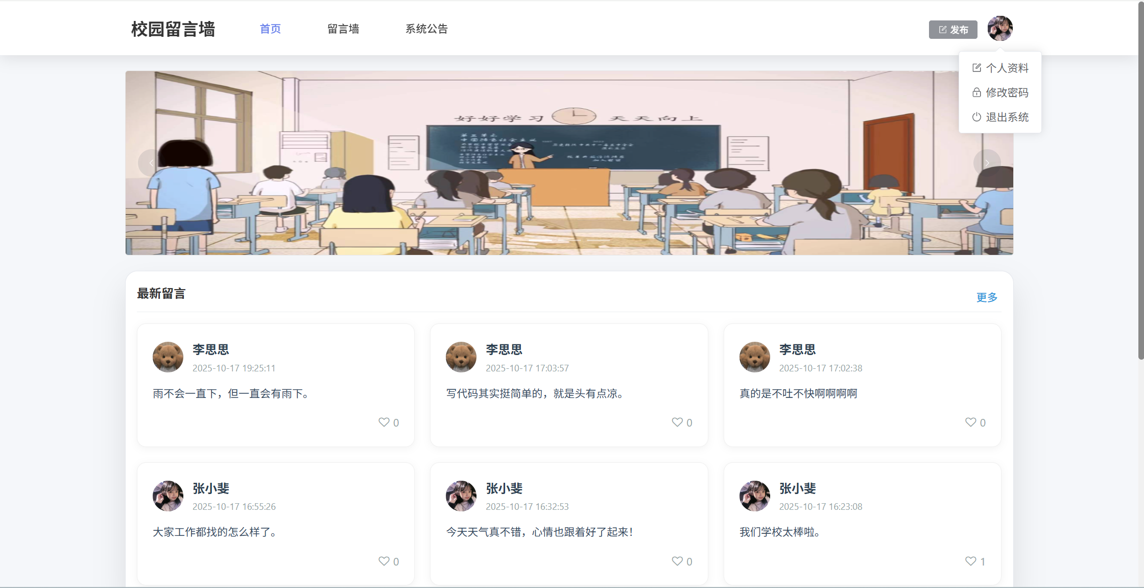 基于SpringBoot3+Vue3前后端分离的校园留言墙系统,本人原创开发。
