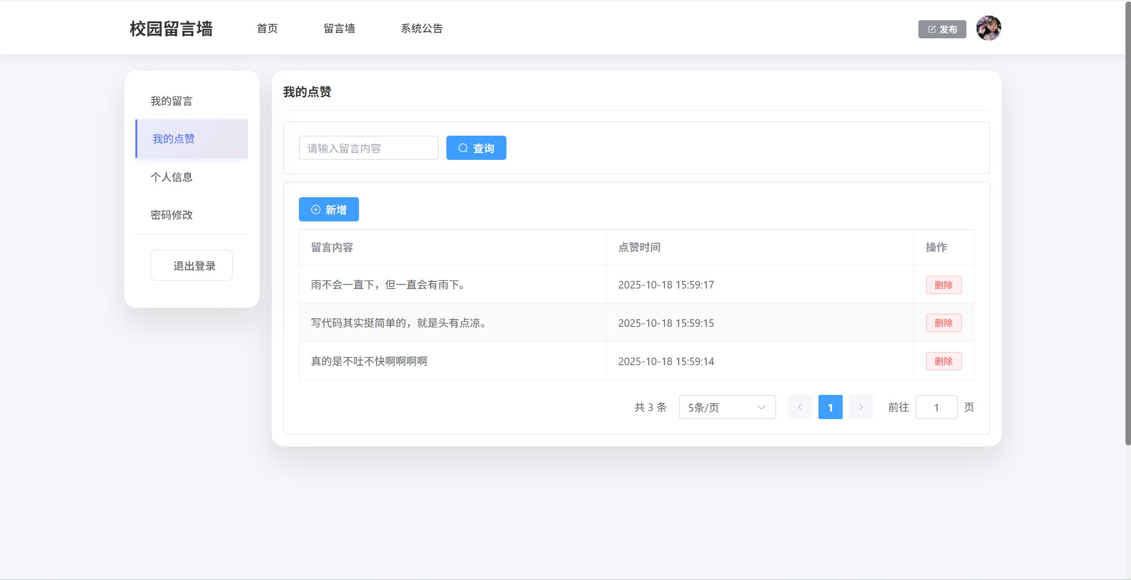 基于SpringBoot3+Vue3前后端分离的校园留言墙系统,系统包含管理员、学生角色,功能如下: