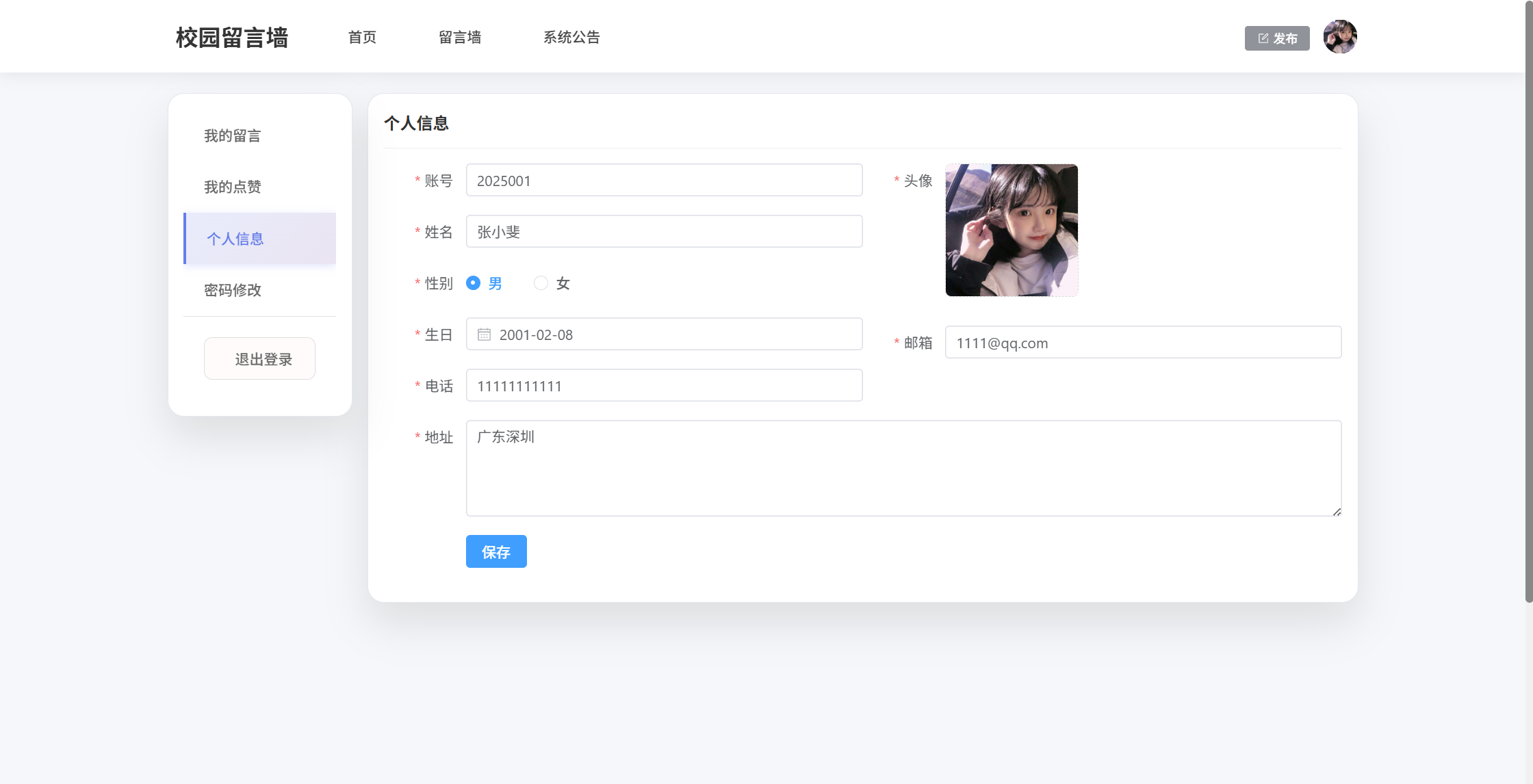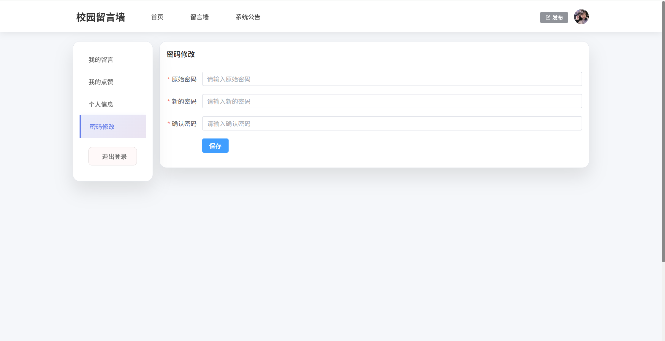 学生端:首页、留言墙(发布留言、点赞)、系统公告(公告详情);用户还具有个人中心功能,功能包括:我的留言、我的点赞、个人信息、密码修改
